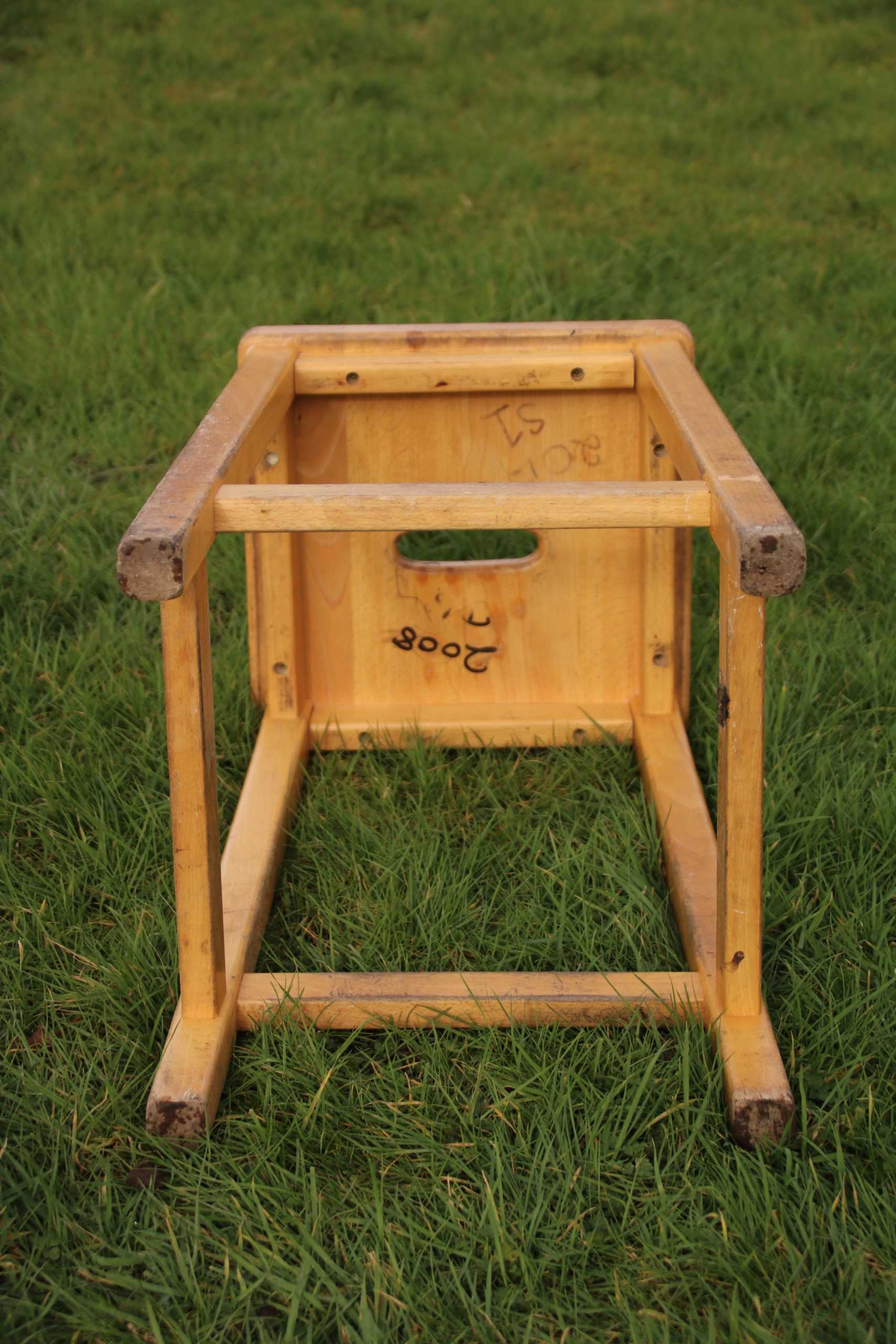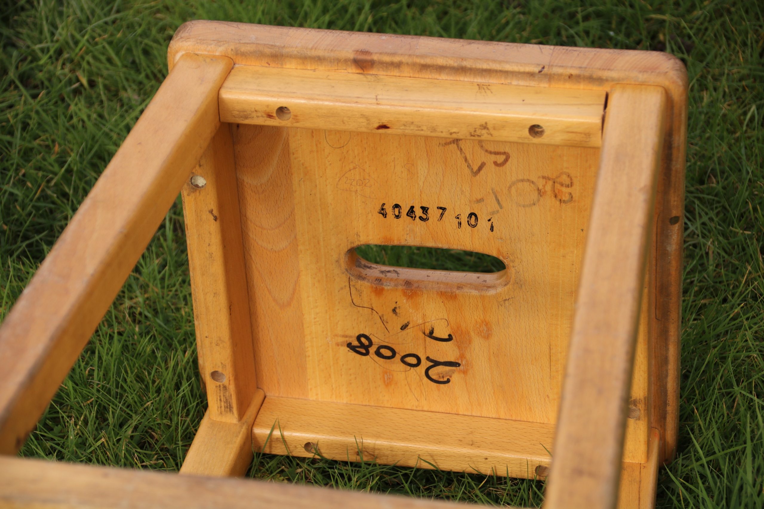 The stool is in very good condition with a few marks, stains and scratches due to age. It has some pen and paint marks and underneath is handwritten ‘2008 D6’.