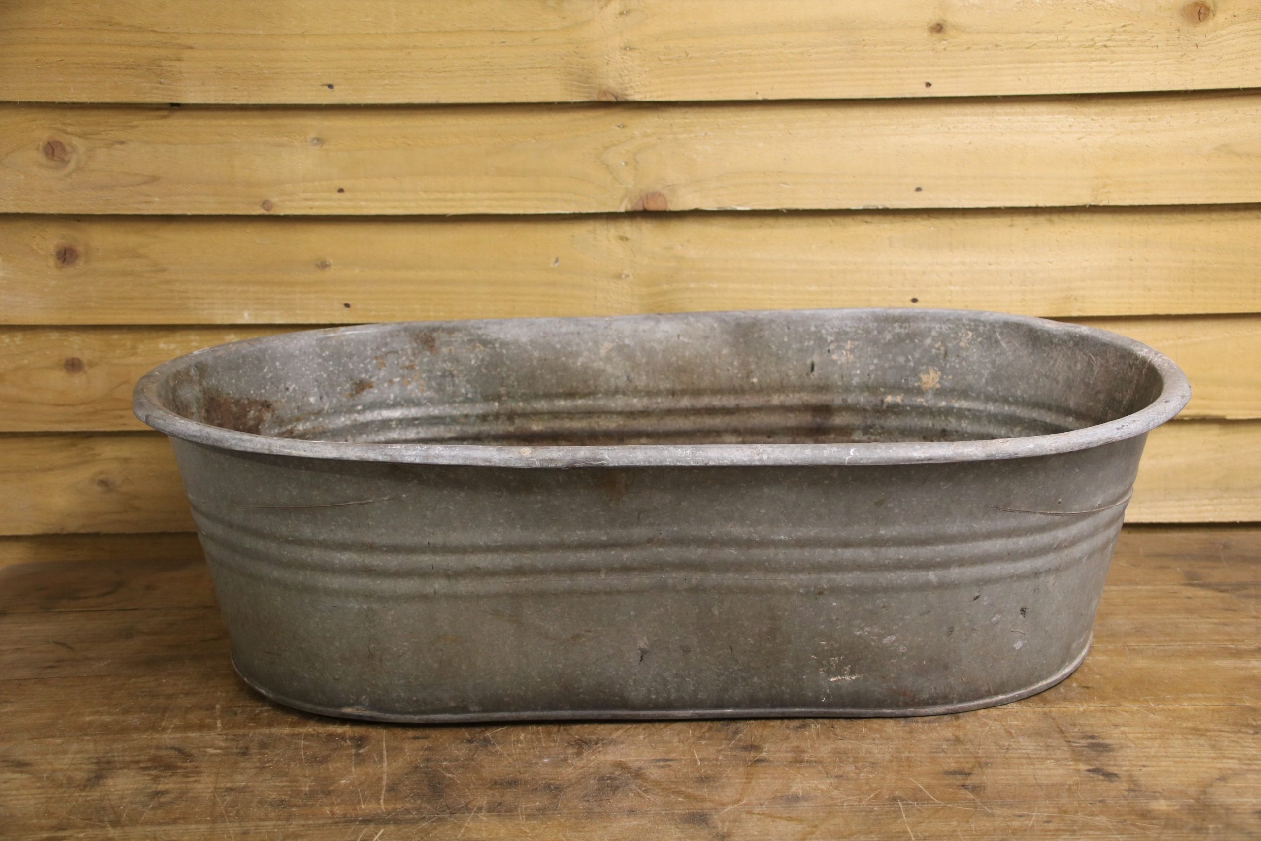 A vintage, galvanised baby bath. Perfect for planting up with flowers, herbs or even vegetables.