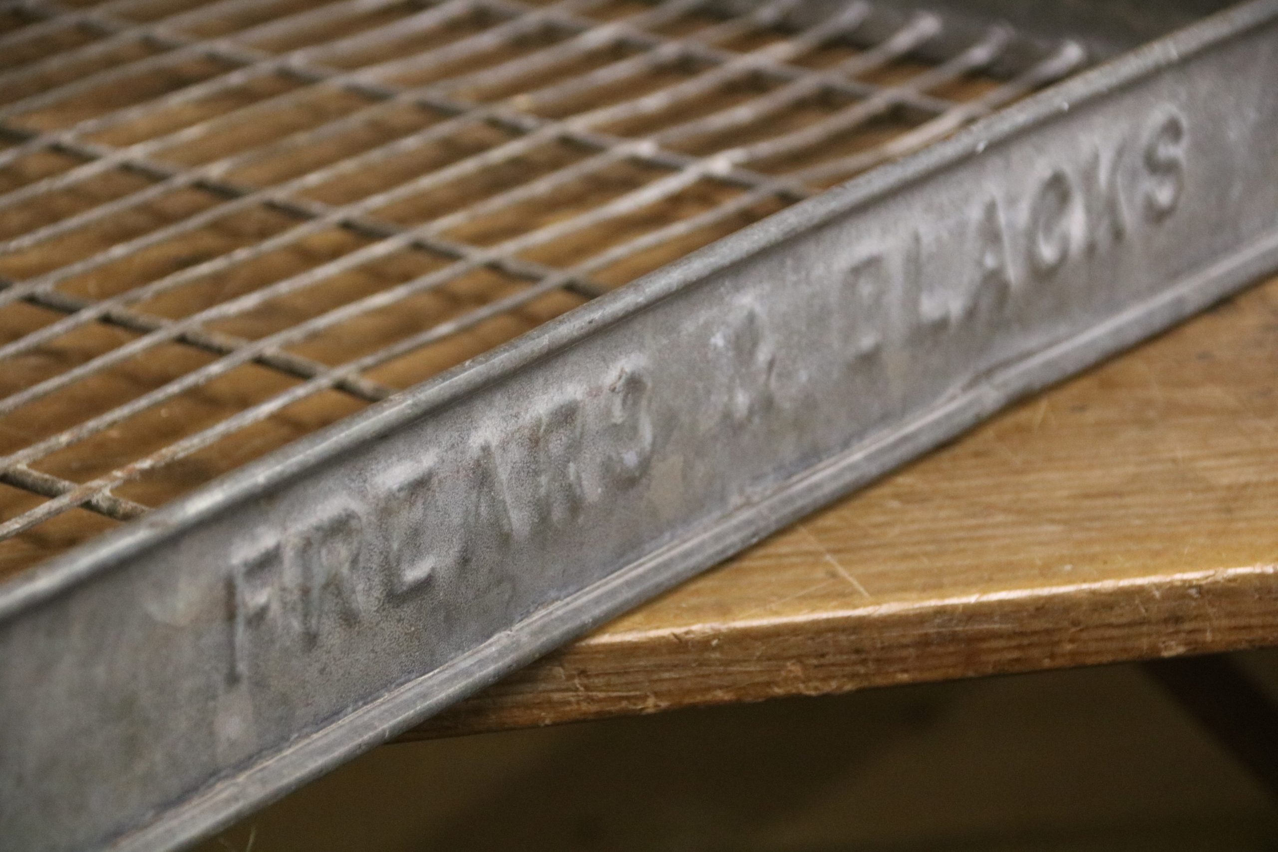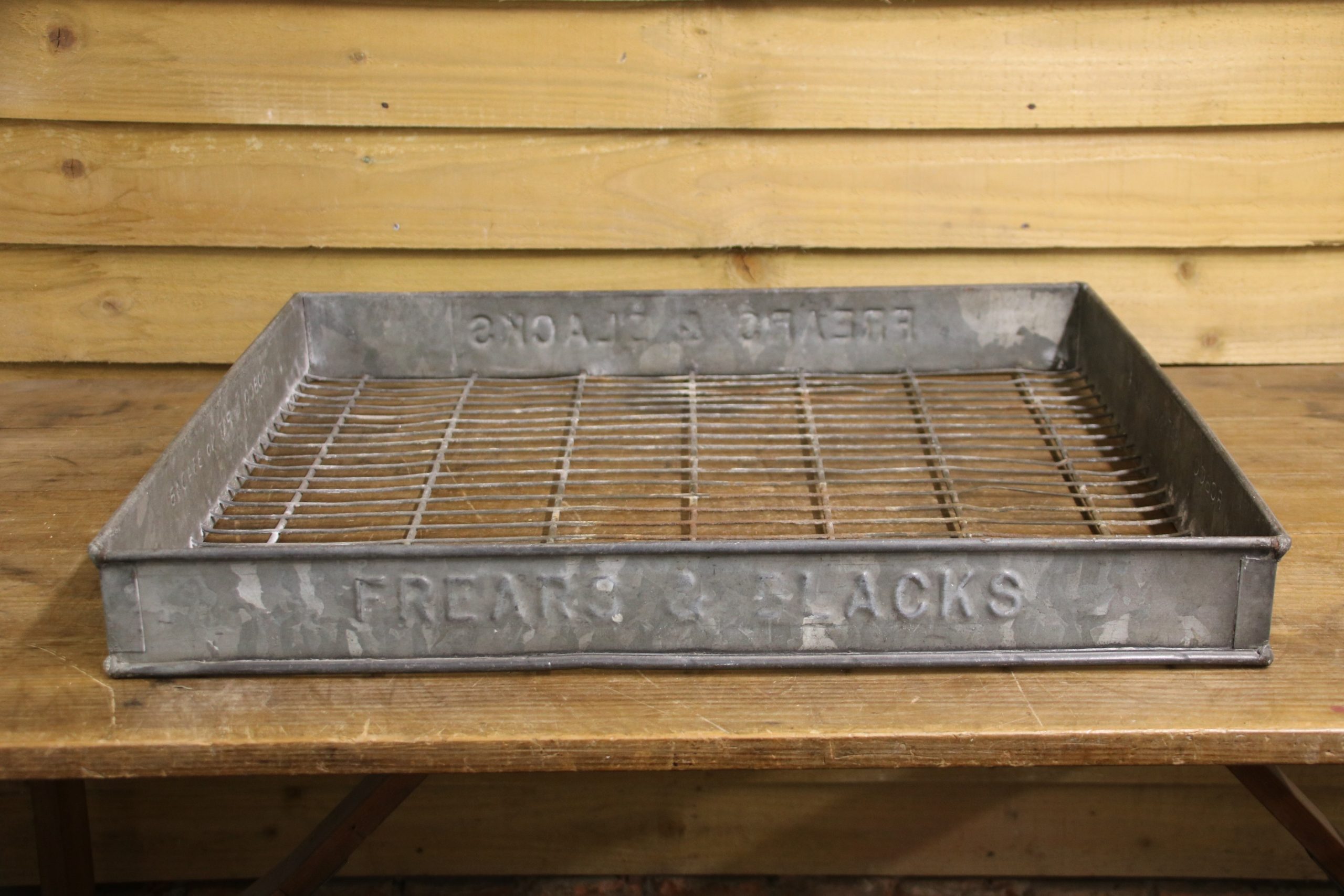 A large vintage galvanised tray, original used in a bread bakery. Frears & Blacks was a famous bakery in Leicester, known for their innovative electric bread delivery vans and later aquired by Spillers in 1973.