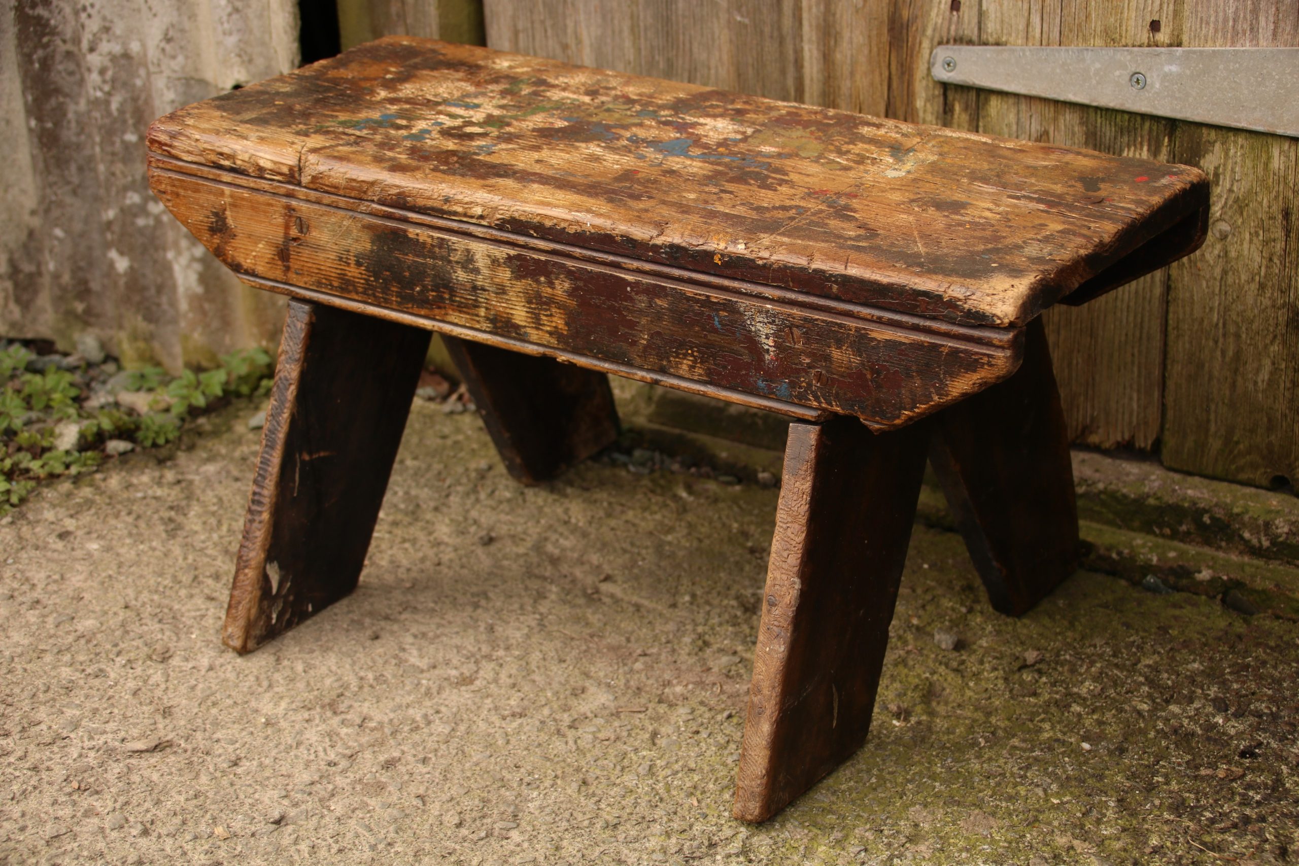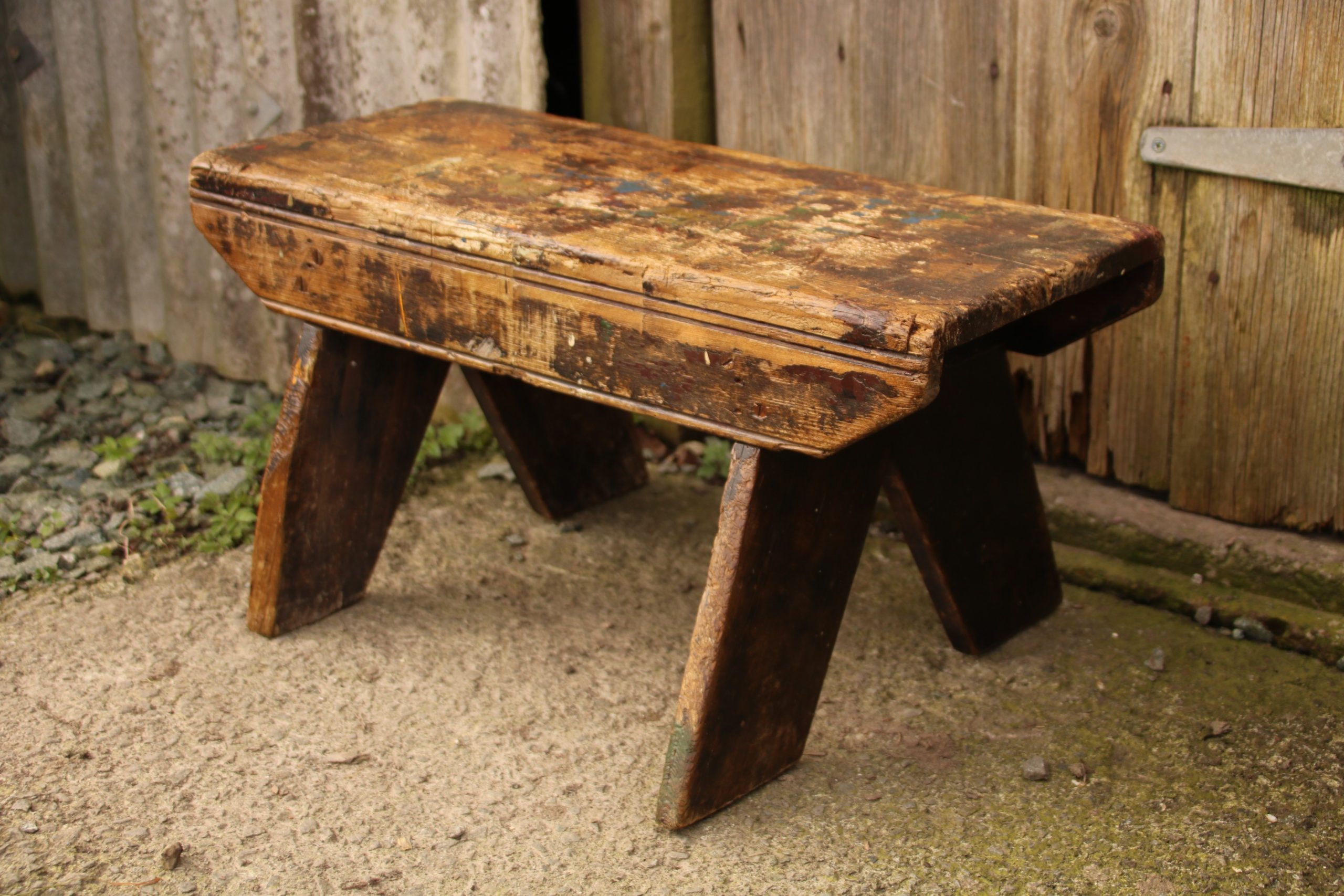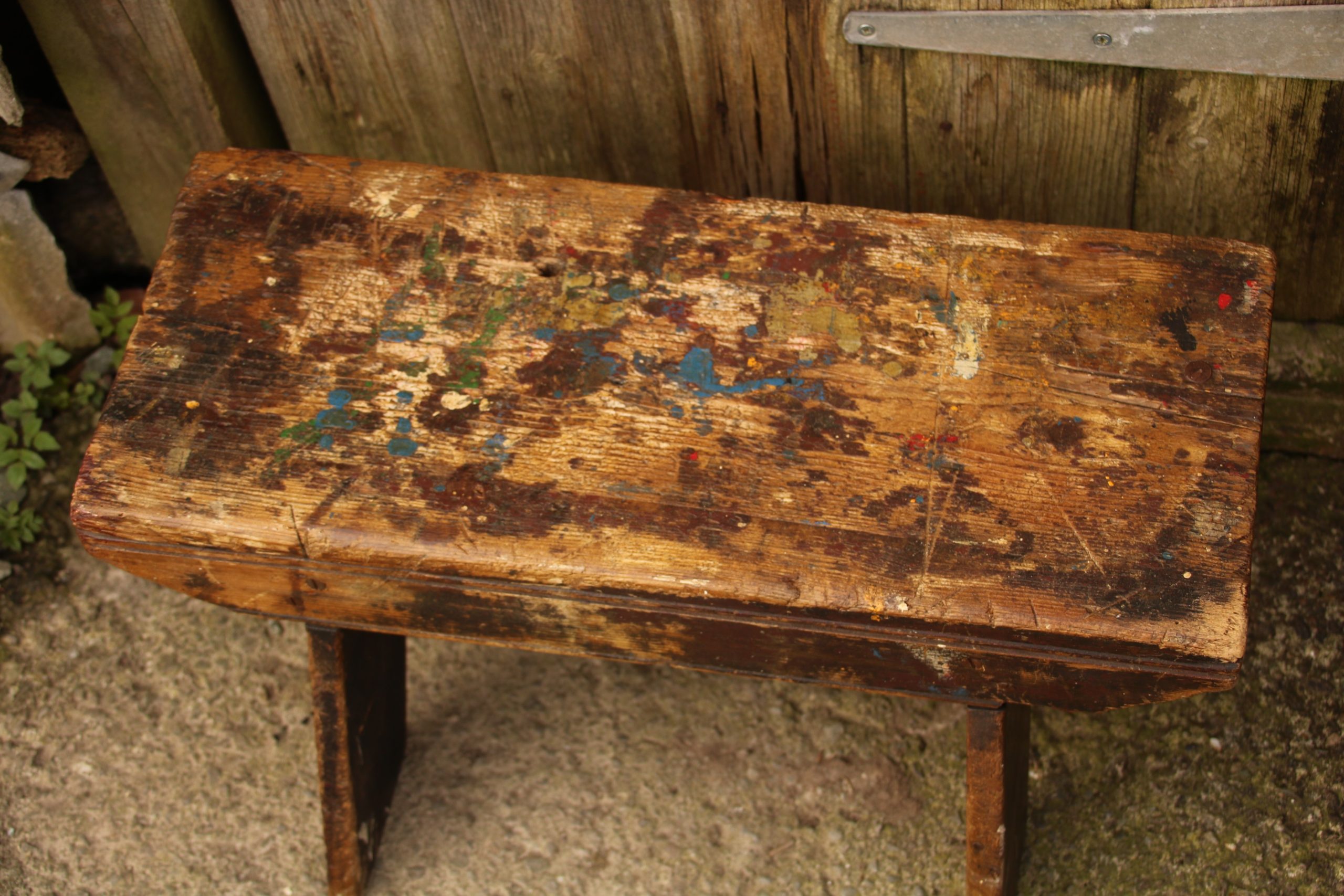 The stool is in very good condition with a few marks, stains and scratches due to age. It has original paint splatters and marks on the wood, and it has been waxed ready for use.