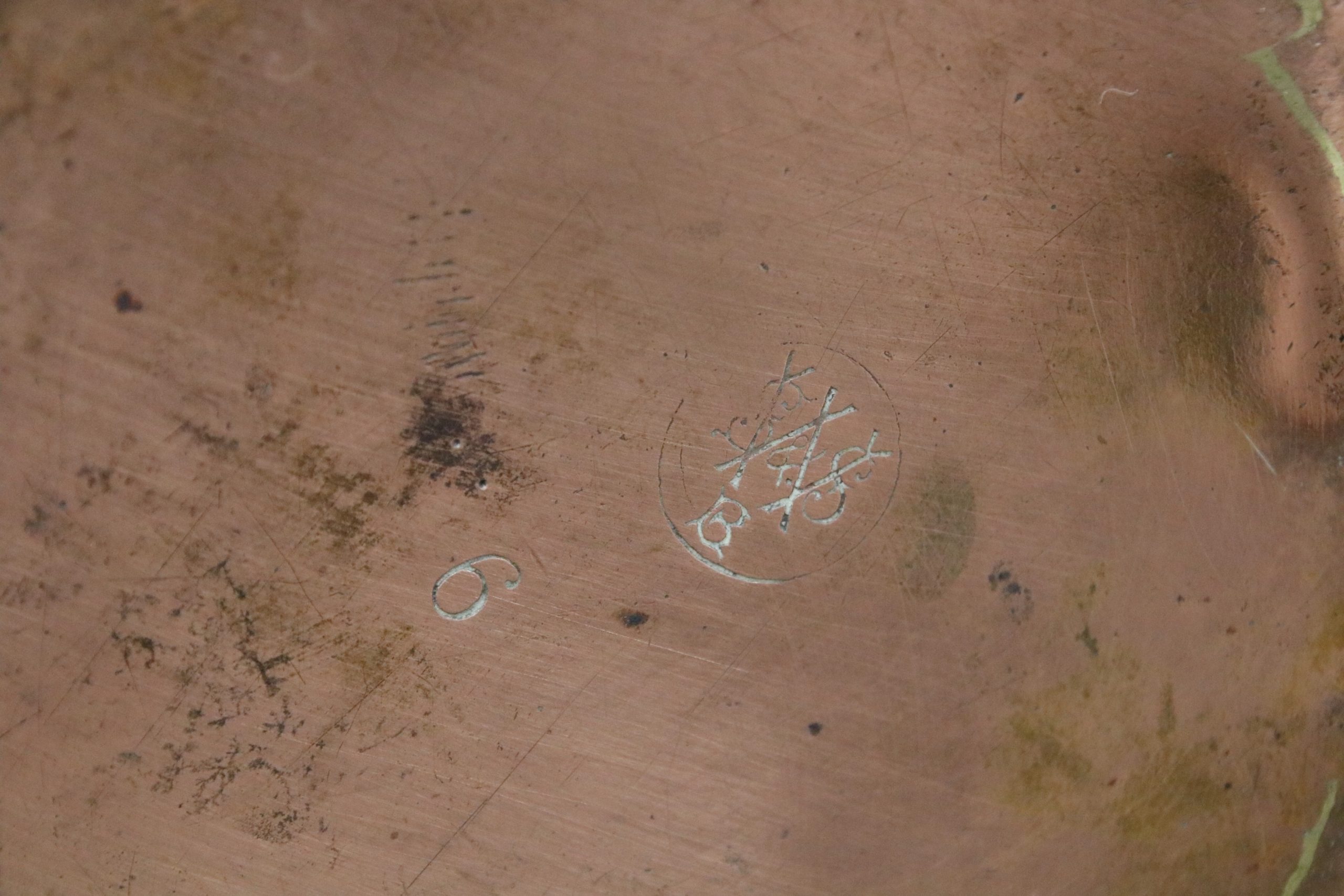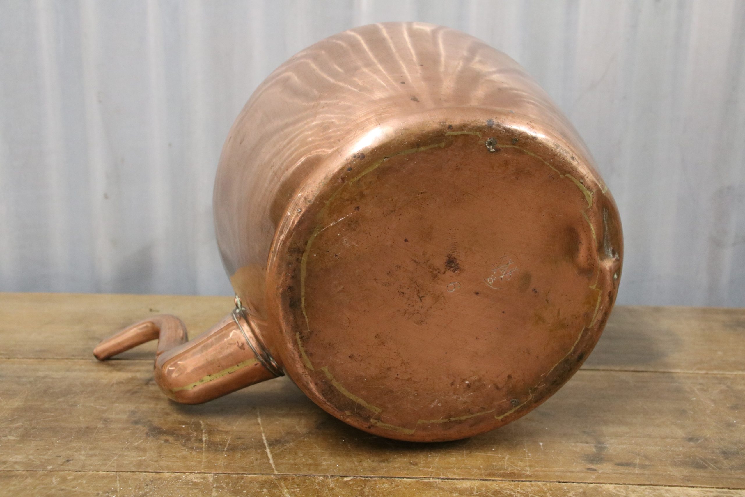 The kettle is in very good, used condition with a few marks, stains and some dents due to age. There is a manufacturer stamp on the bottom.