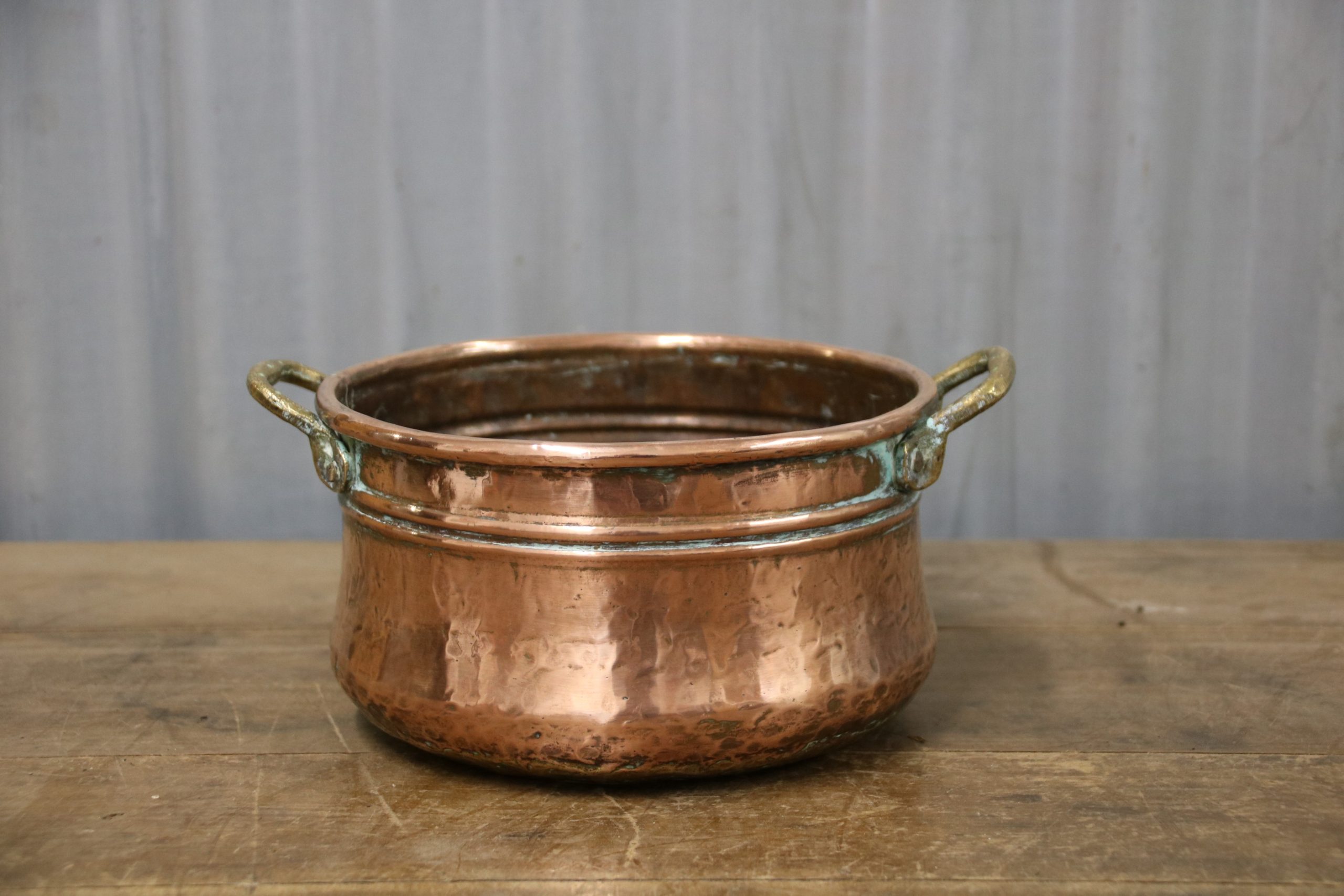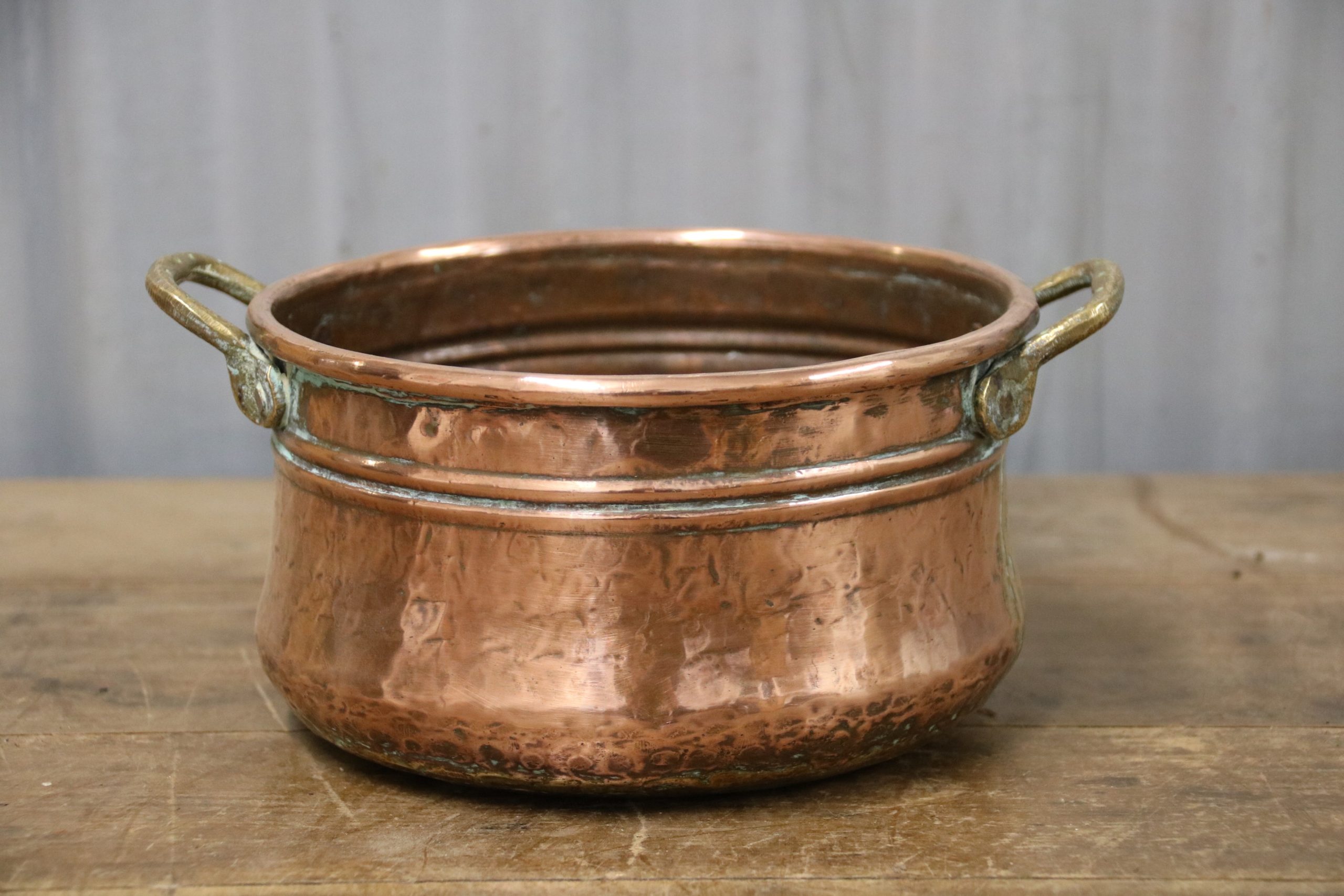 A small round copper container. Perfect for planting up with flowers or succulents inside the house, or even using as a fruit bowl!