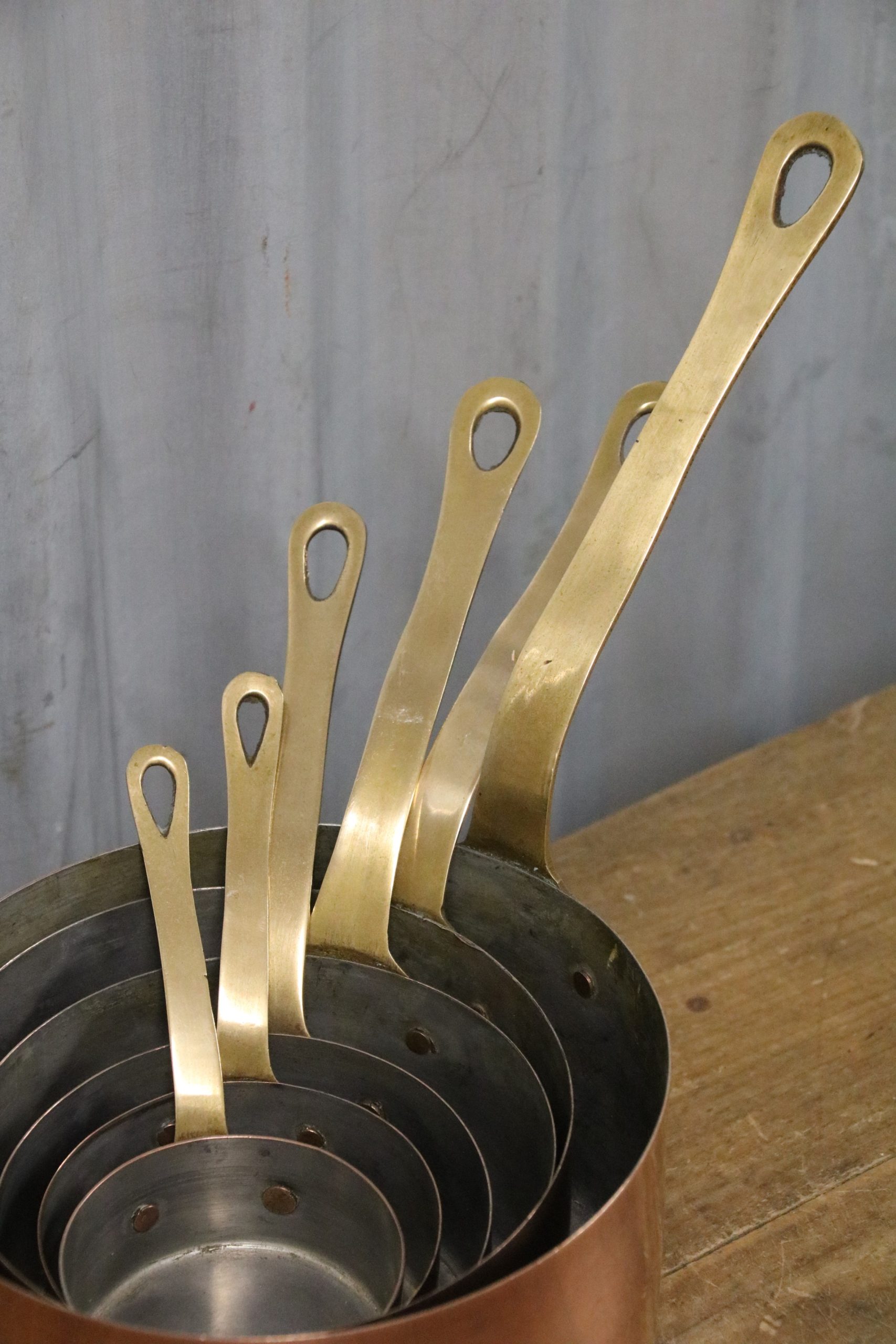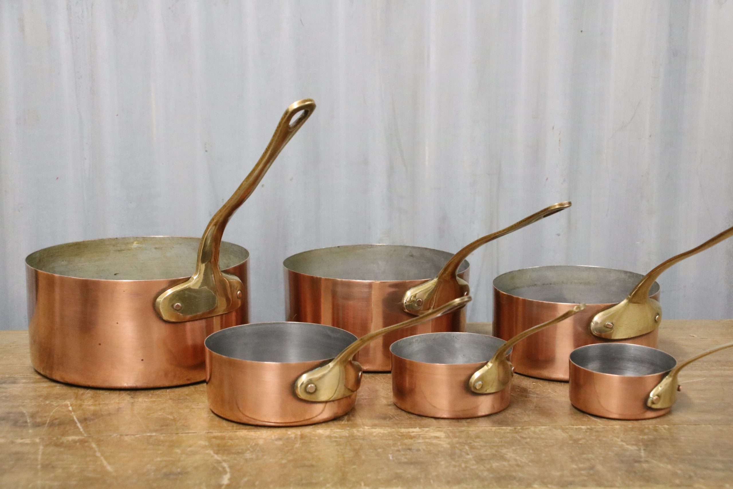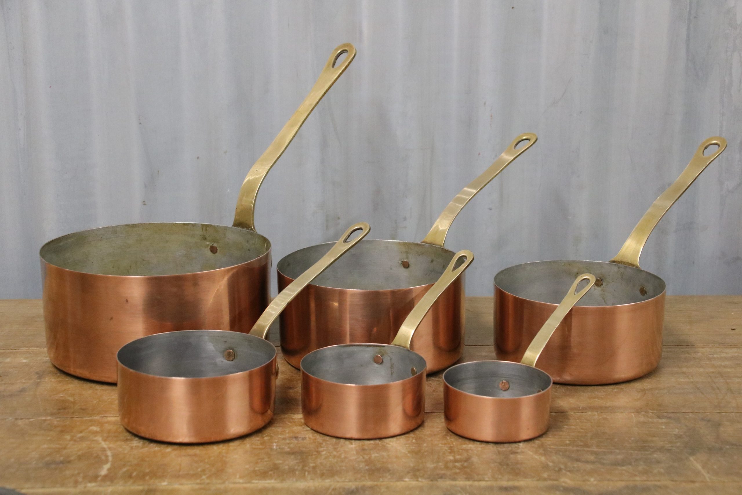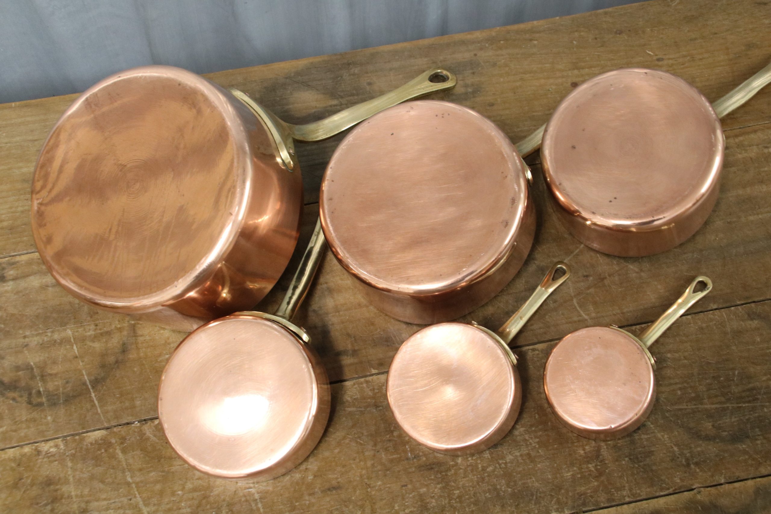 A beautiful set of 6 vintage copper saucepans.