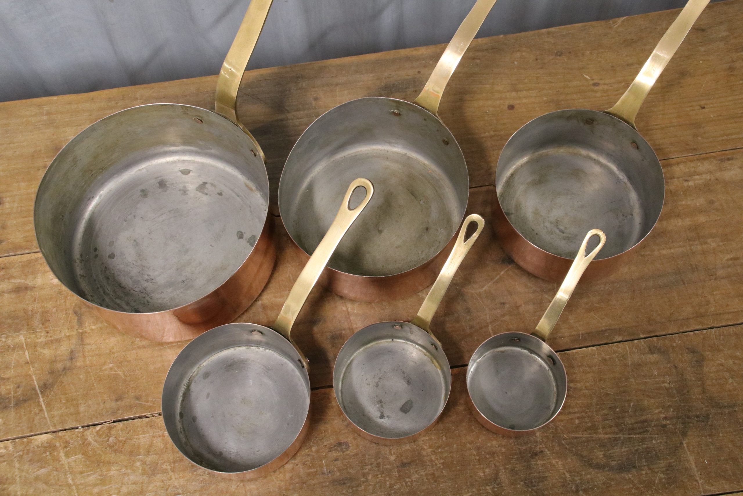 The pans are in very good condition with a few marks, stains and some small dings due to age. They are lined with tin and have stains inside.