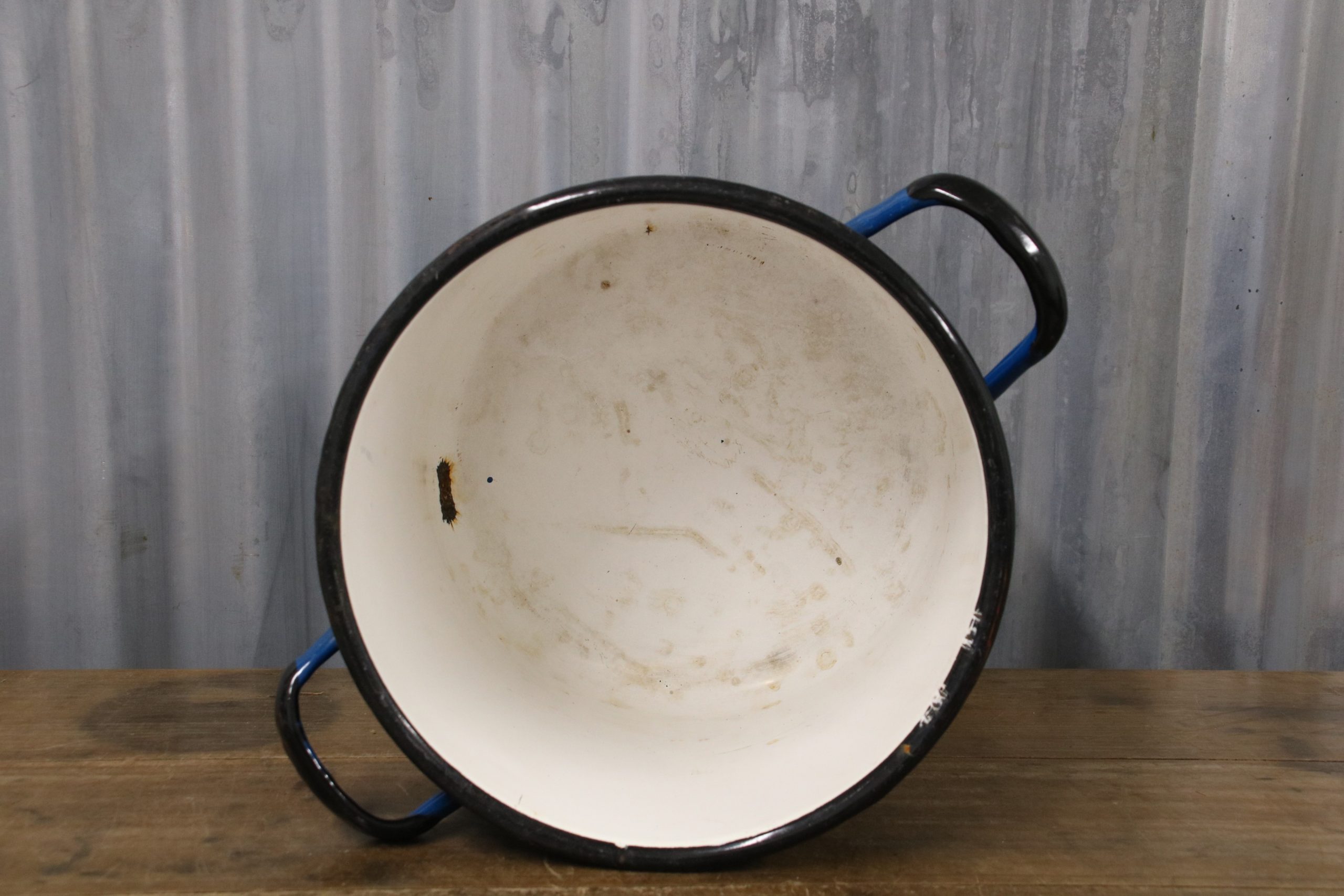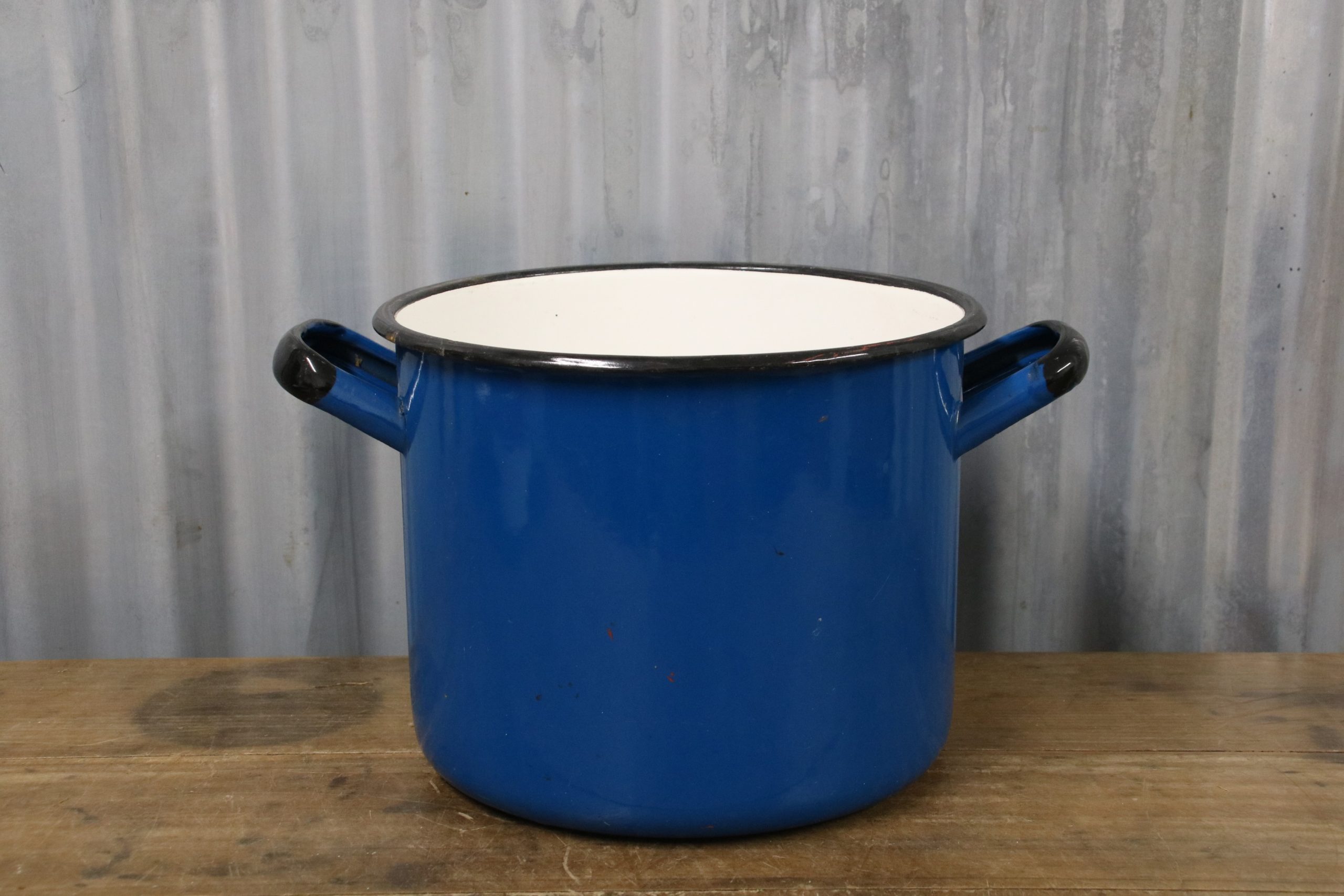A beautiful blue vintage enamel pot. Perfect for using as storage in the garden or kitchen, or plant up with Spring bulbs.