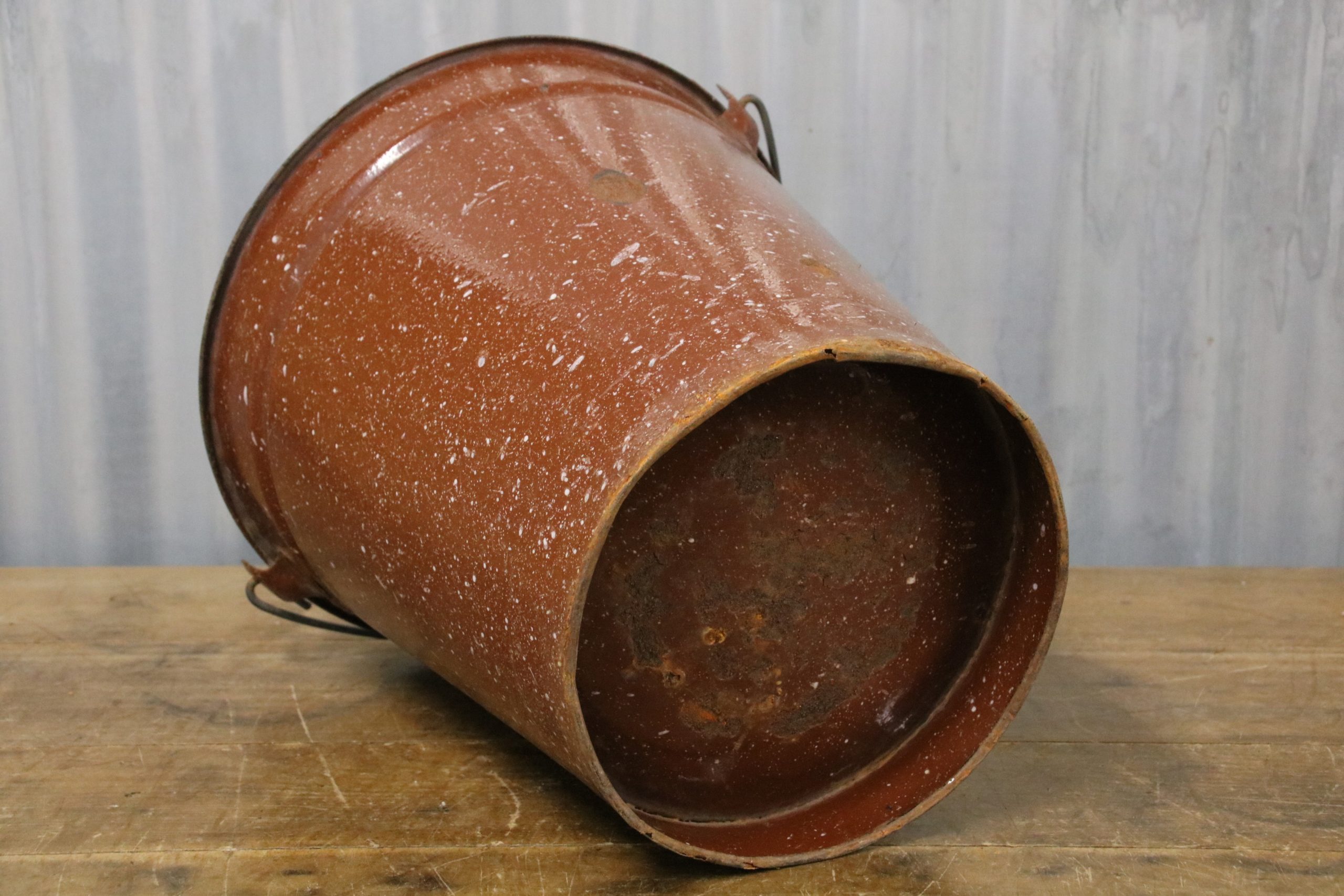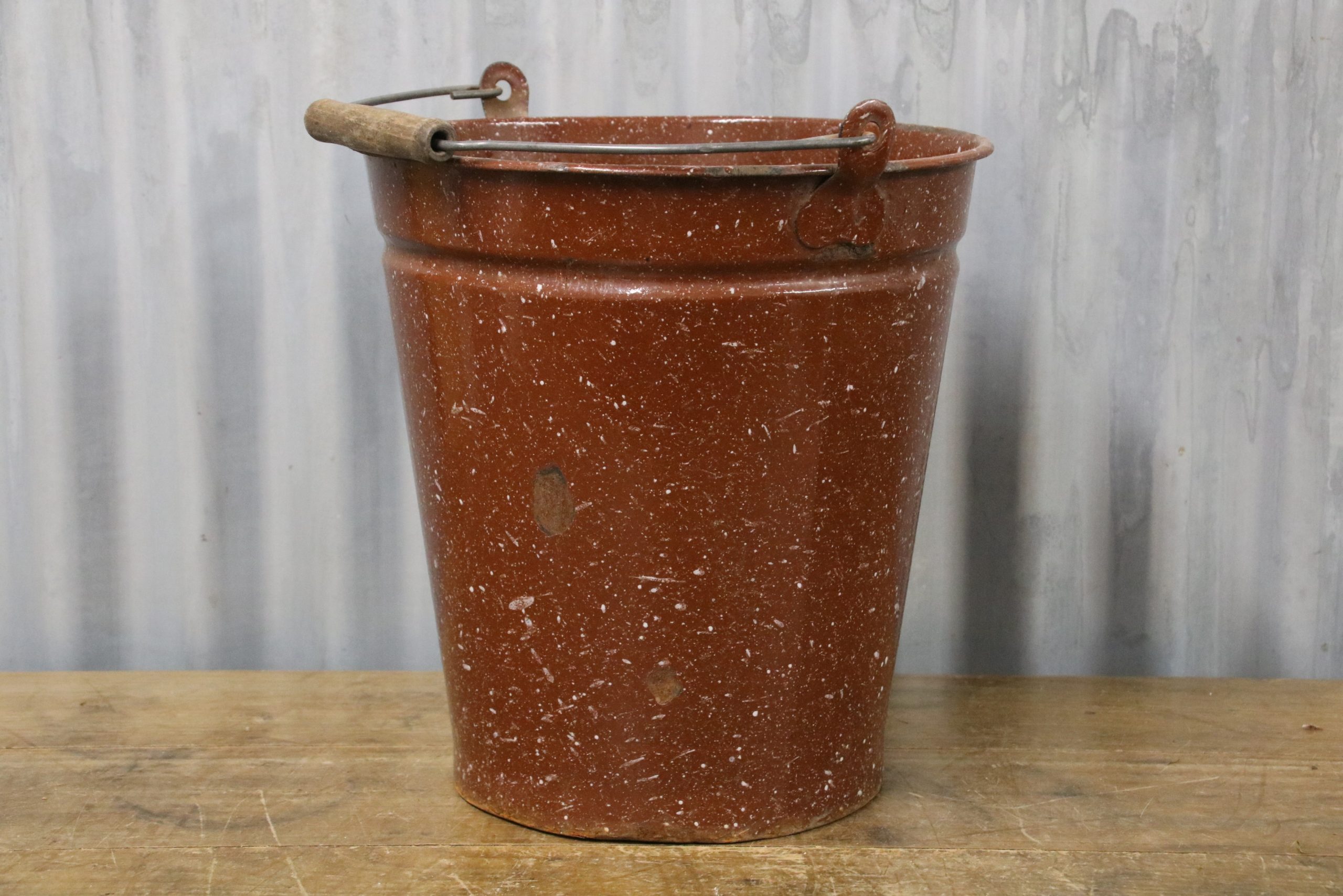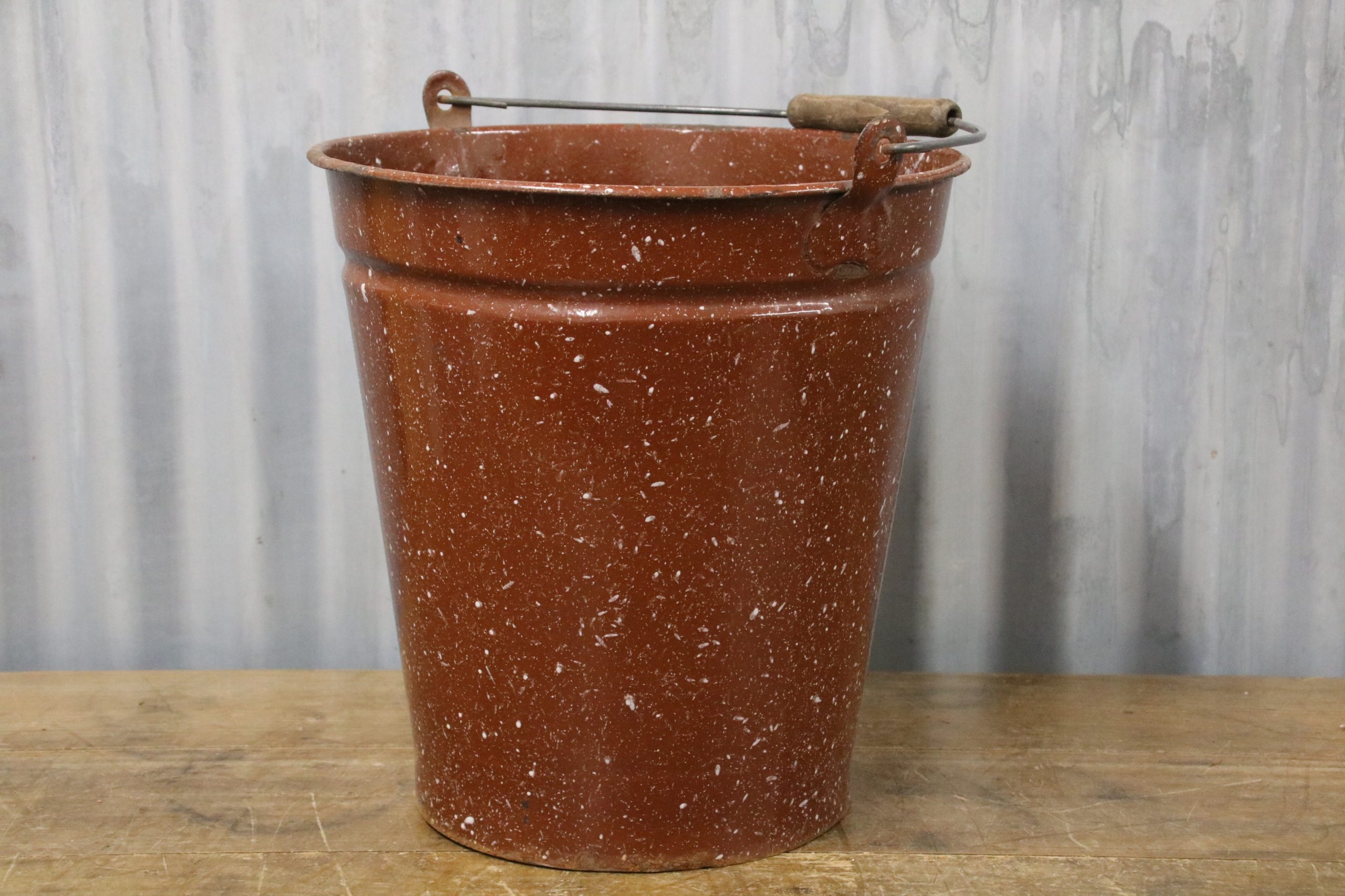 A beautiful brown speckled vintage enamel bucket, perfect for planting up or using to collect homegrown cut flowers in the garden.