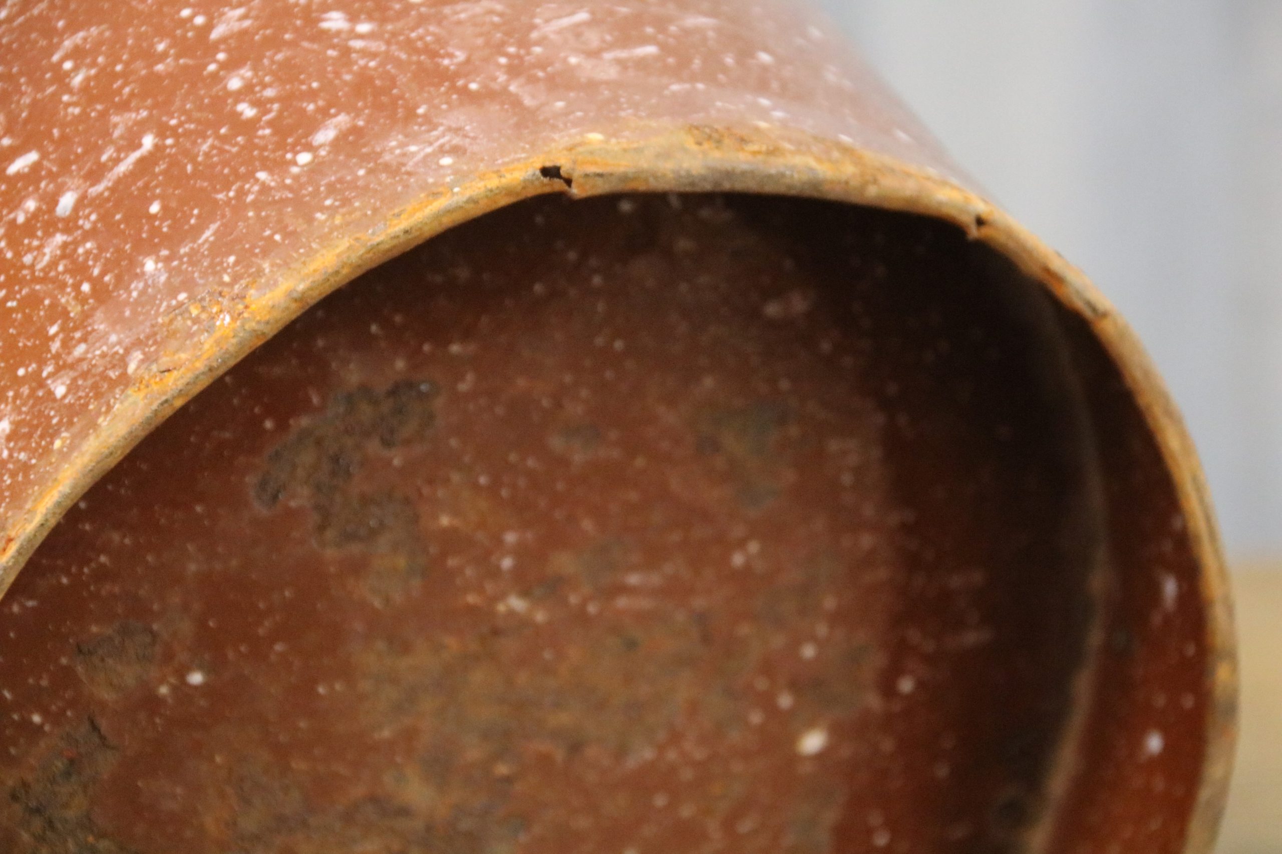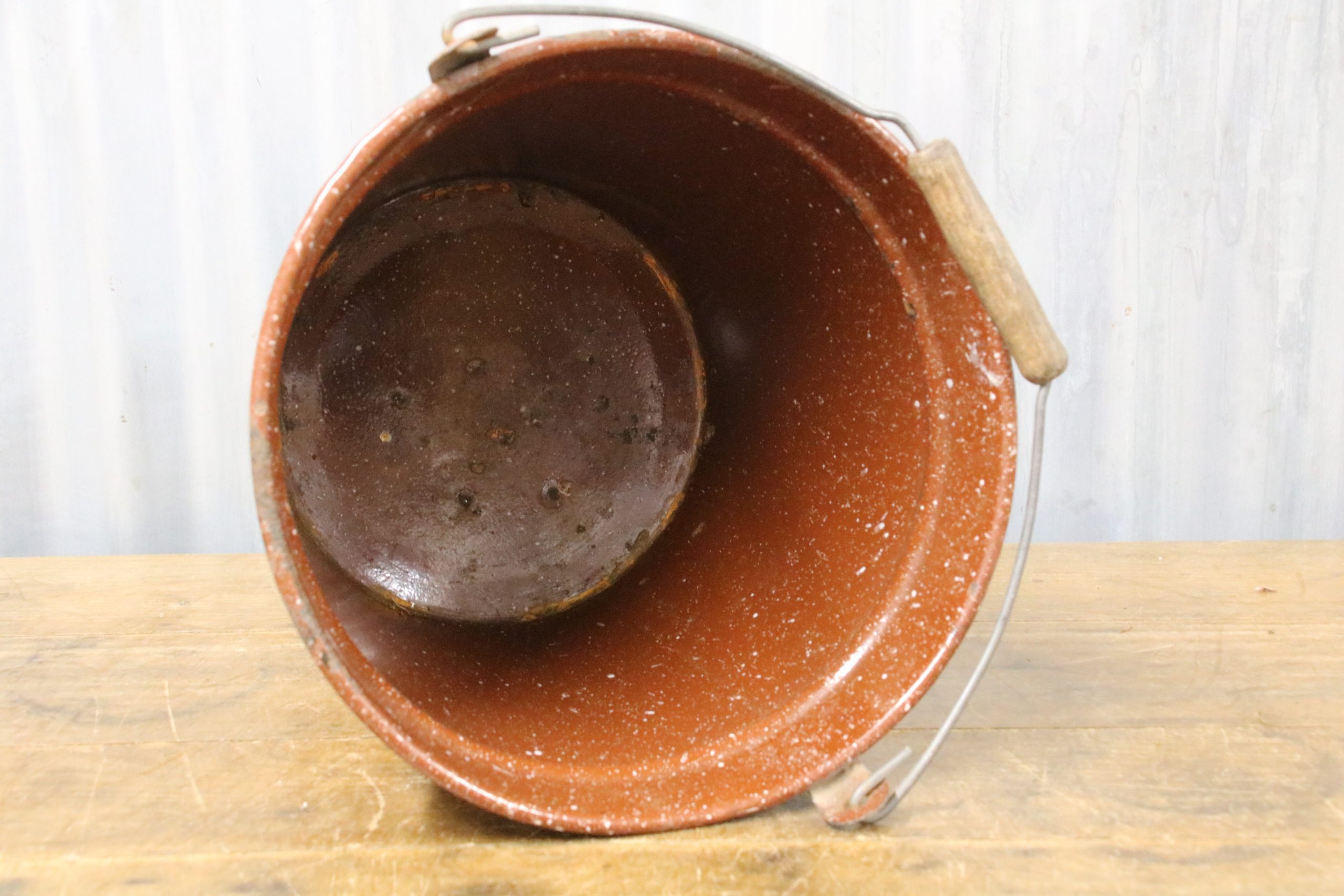 The bucket is in very good condition with a few stains, marks and some chips. The bucket has a wooden handle. There are some chips on the bottom and some small holes on the bottom rim.