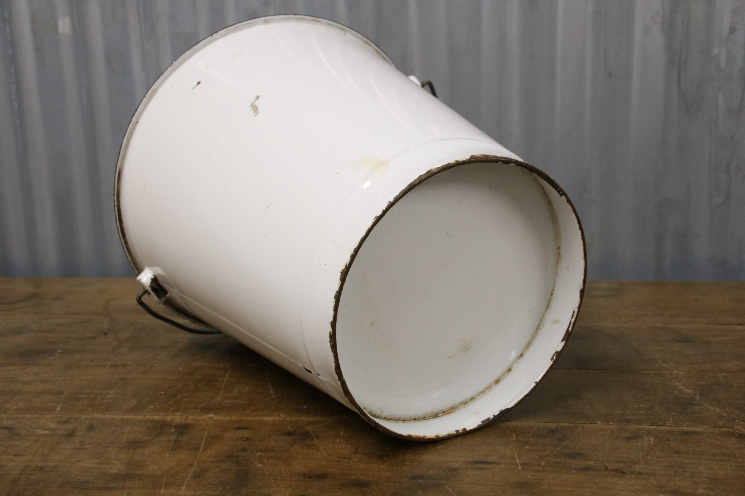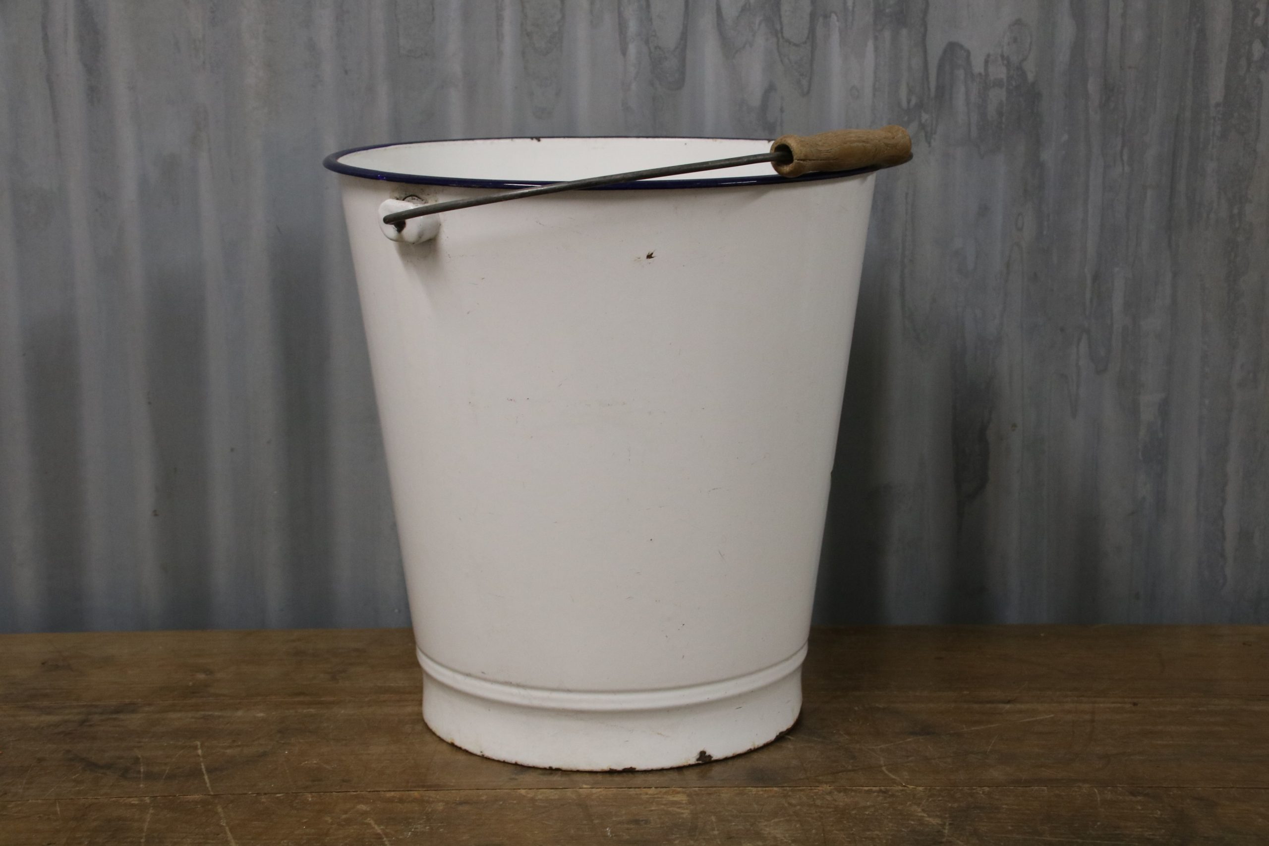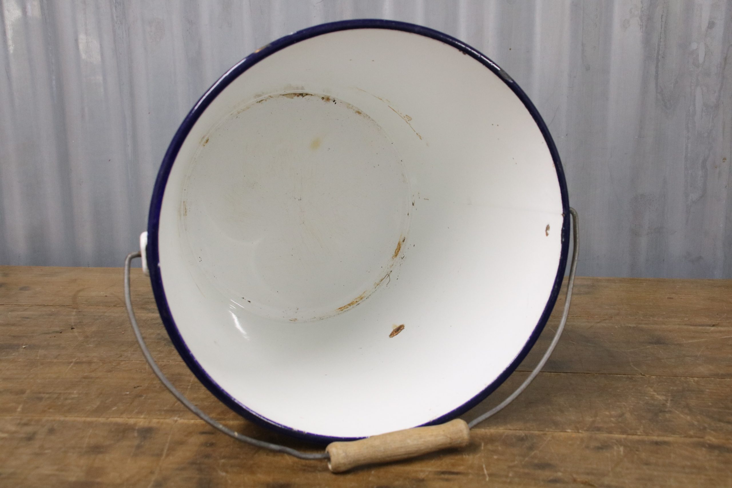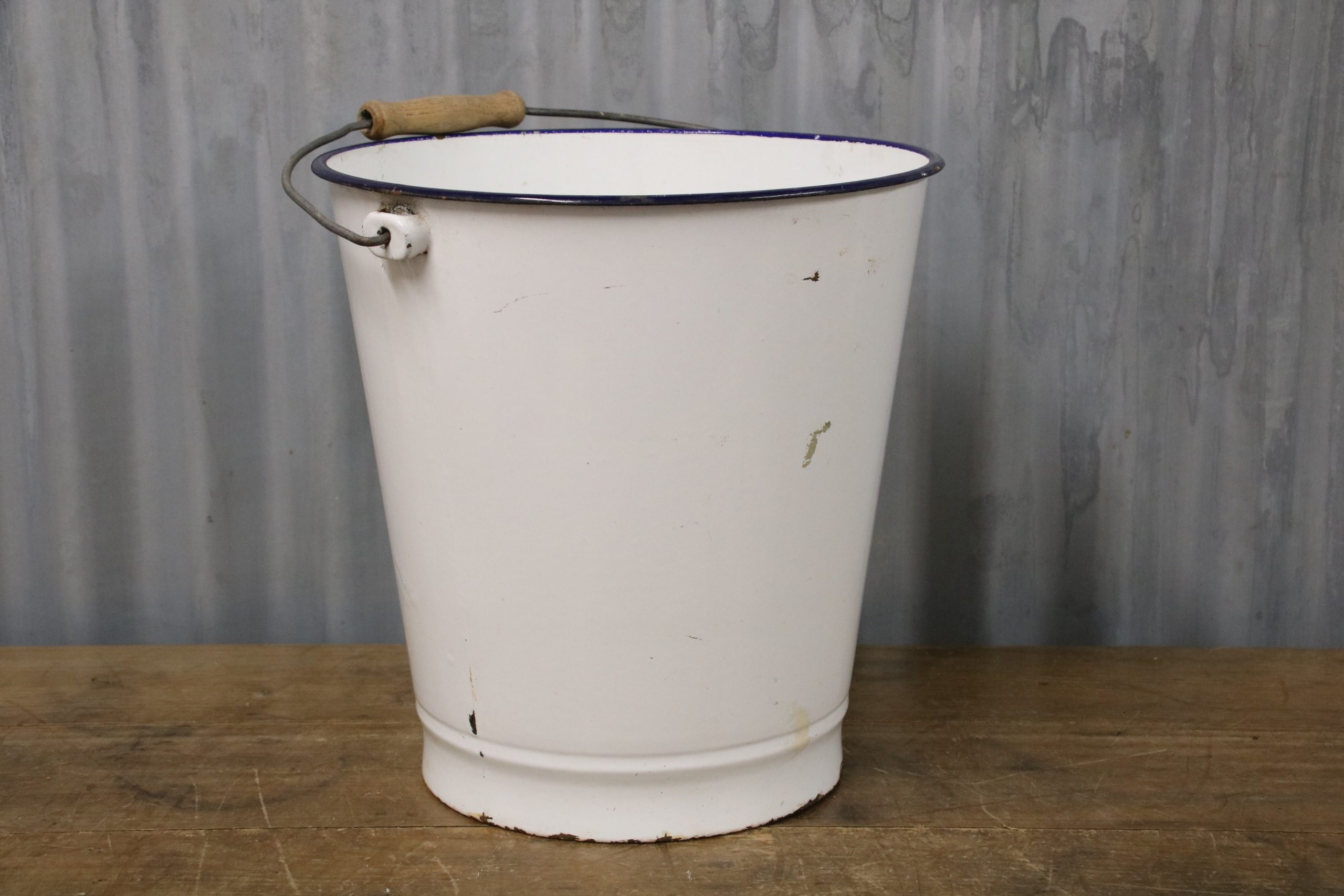 The bucket is in very good condition with a few stains and some chips. The bucket has a wooden handle.