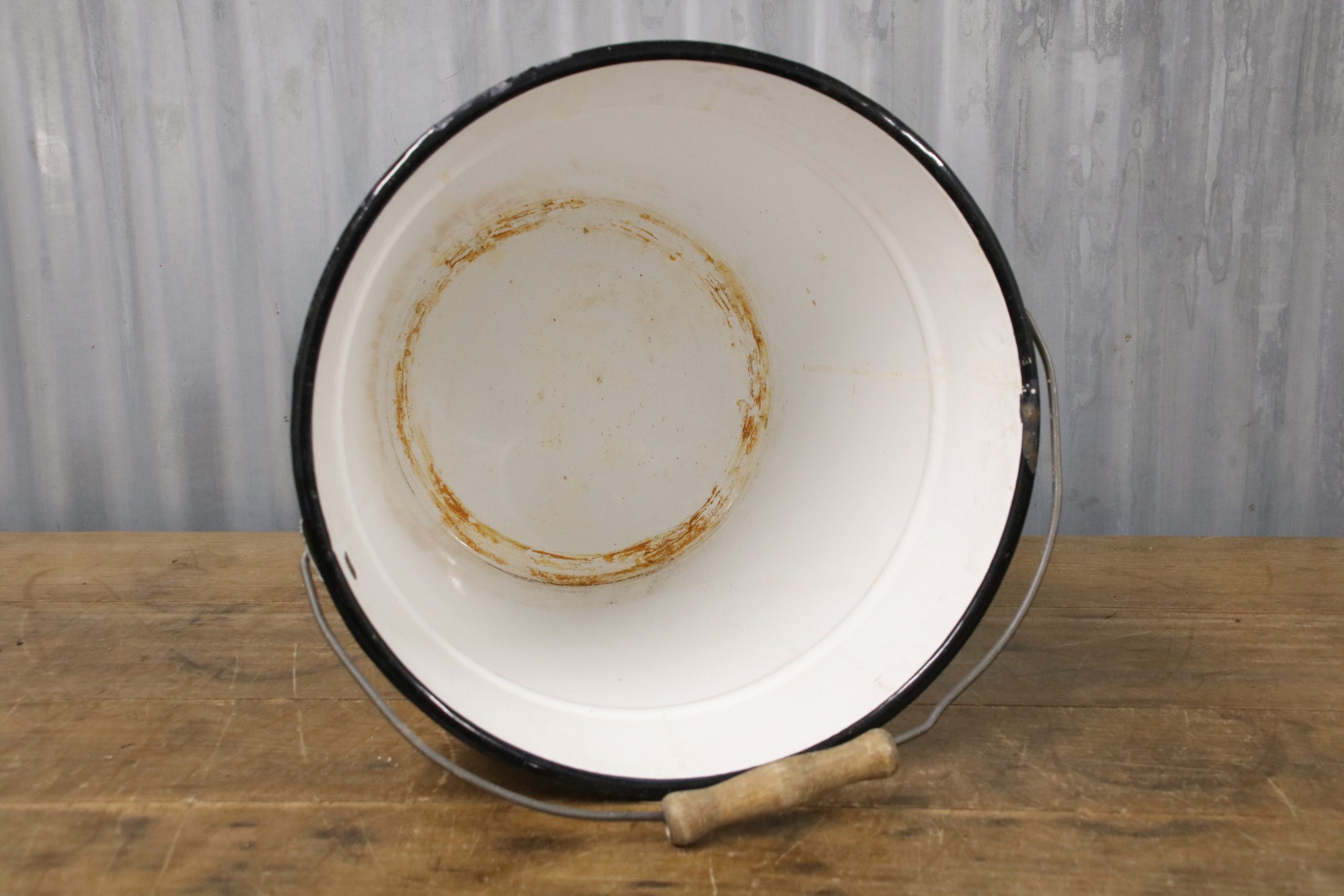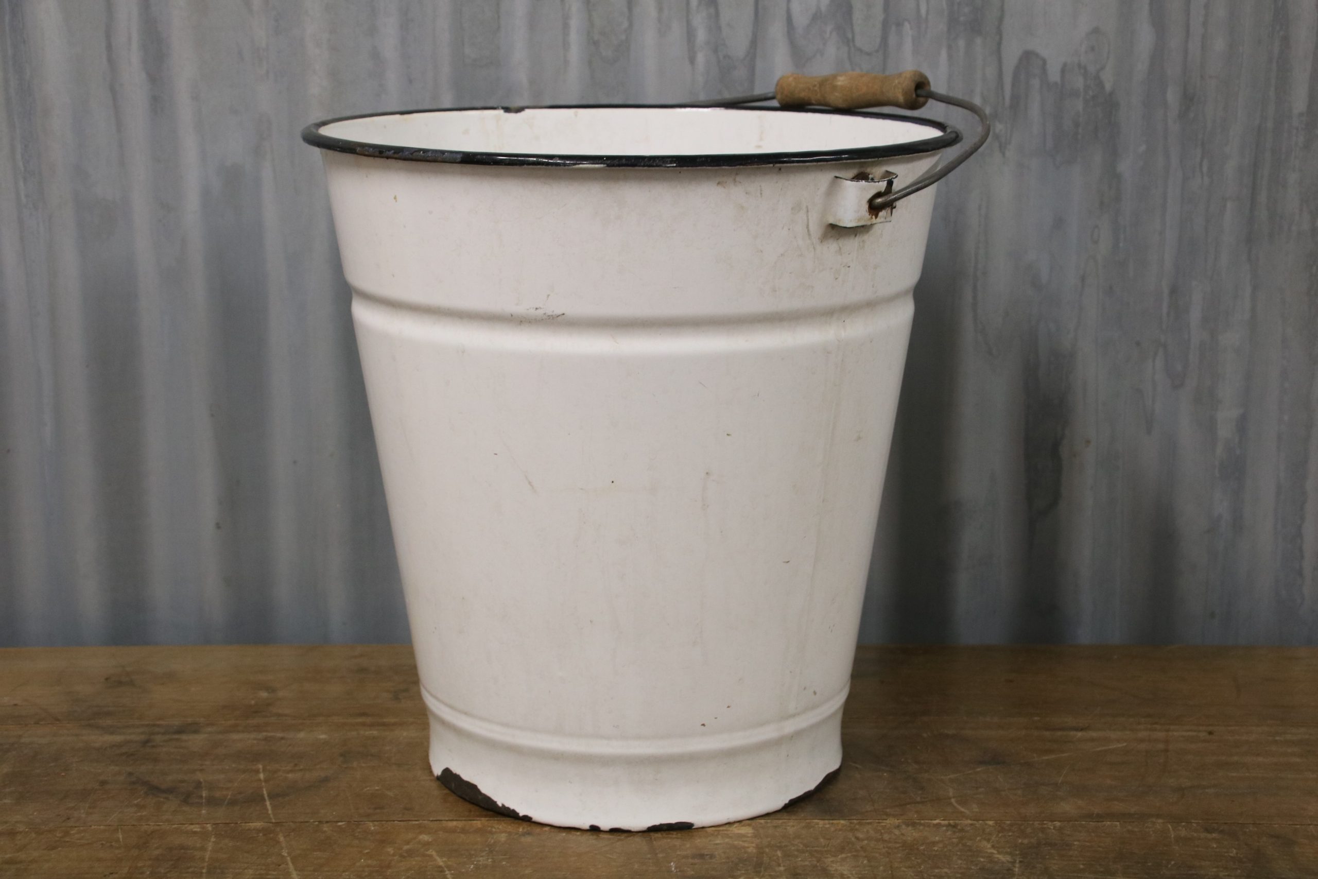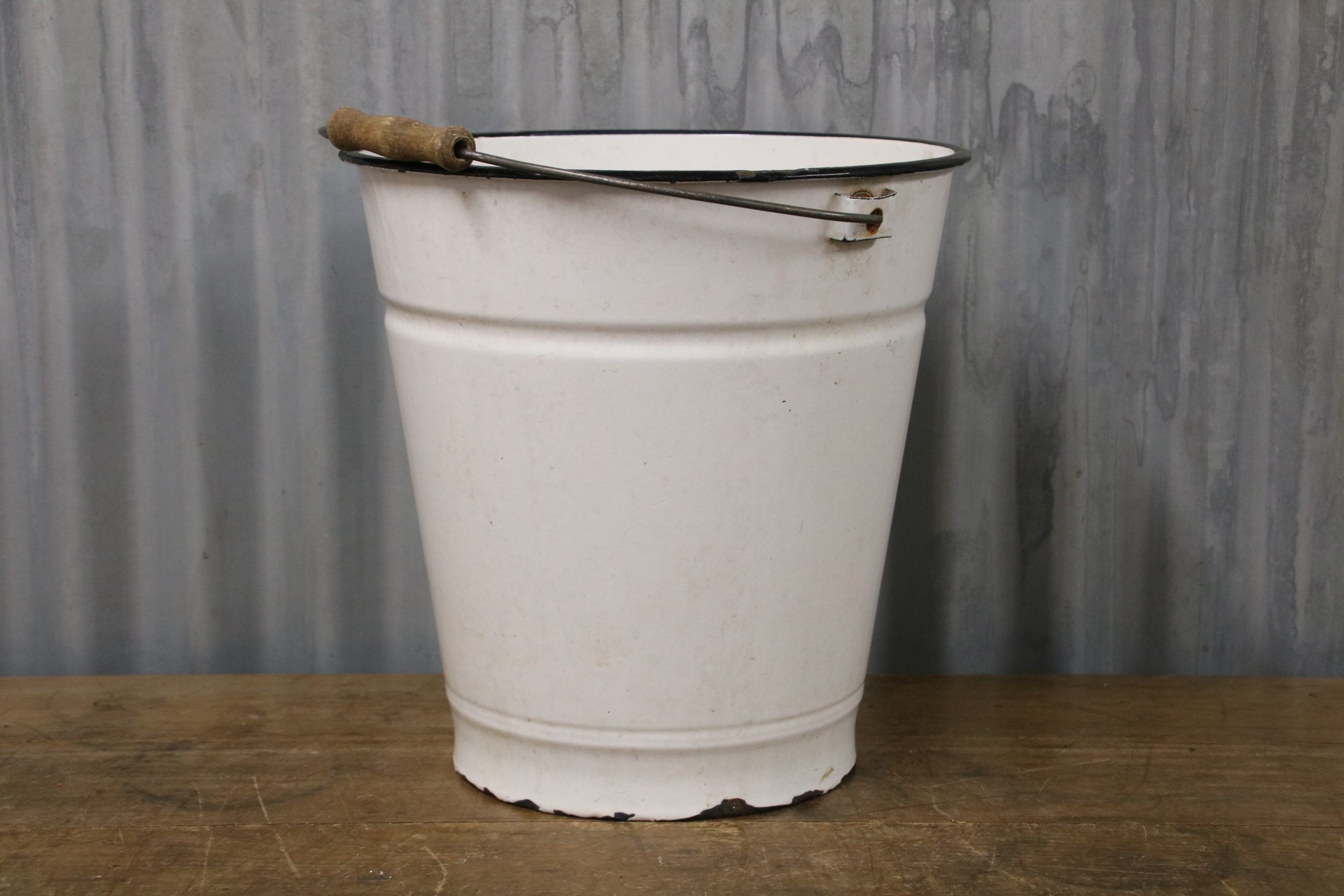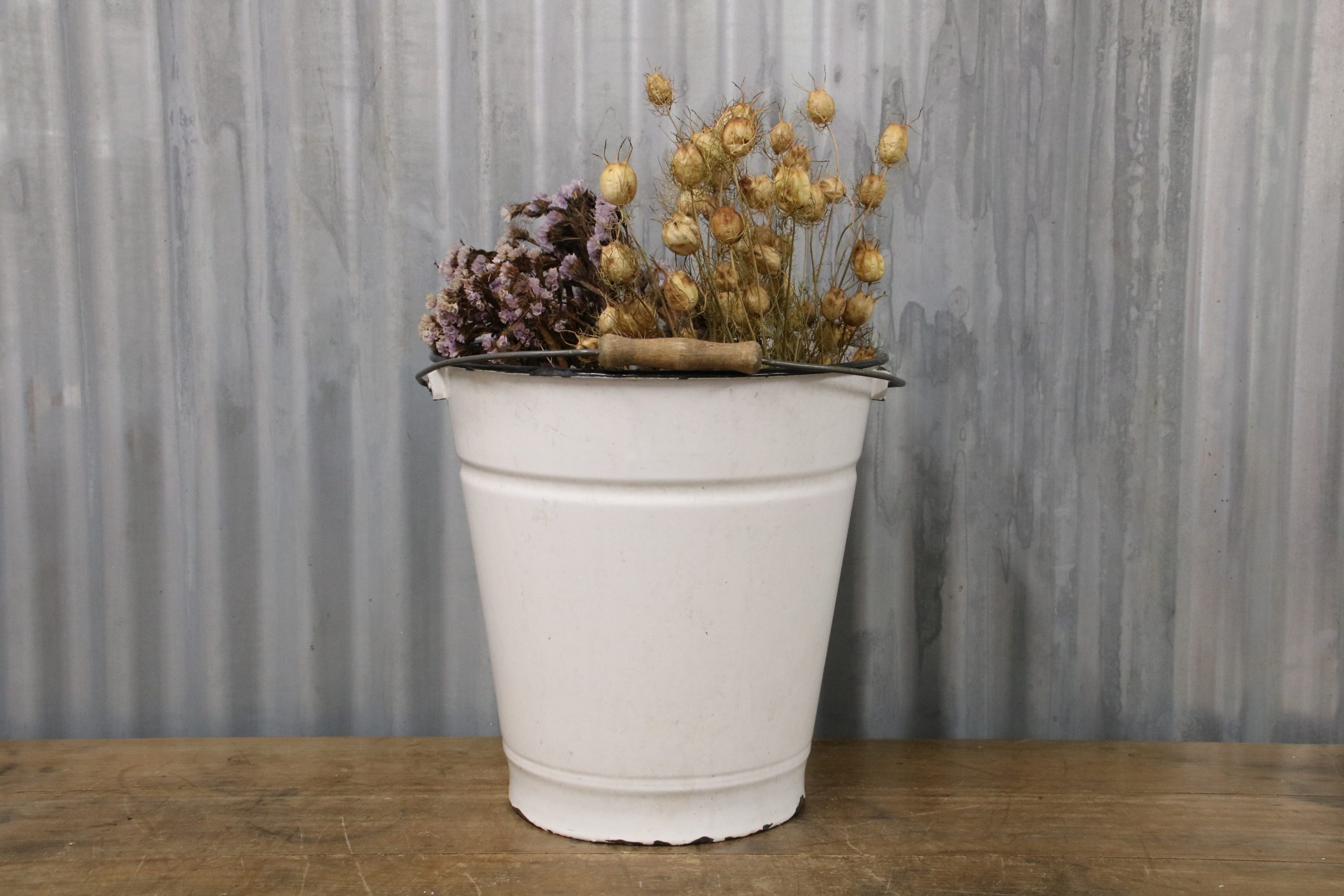 A beautiful white vintage enamel bucket, perfect for planting up or using to collect homegrown cut flowers in the garden.