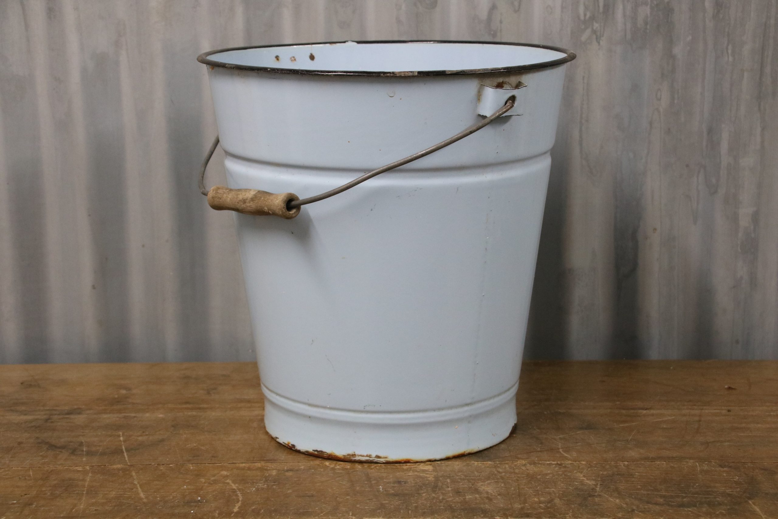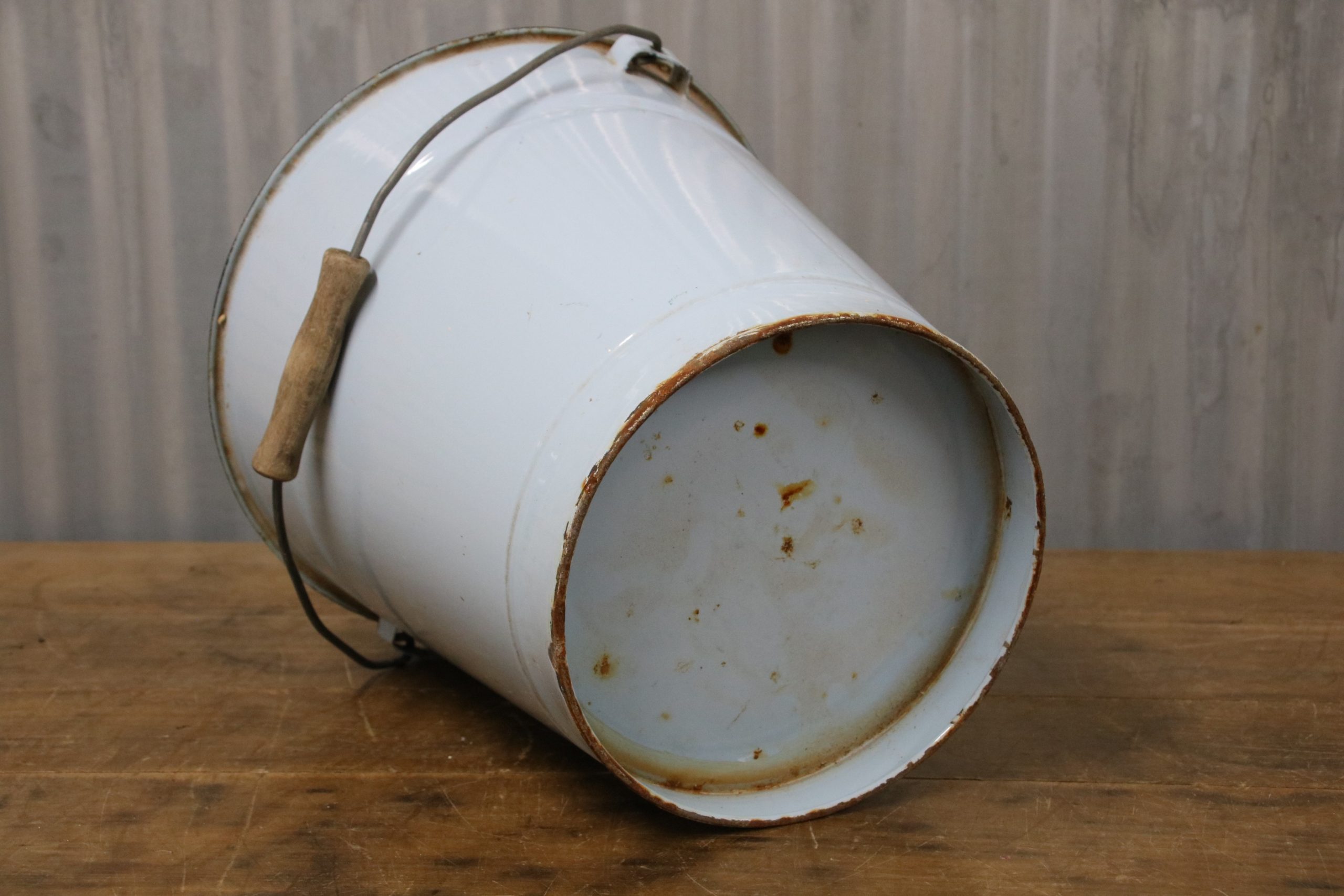The bucket is in very good condition with a few stains, marks and some chips. The bucket has a wooden handle and some orange stains inside.