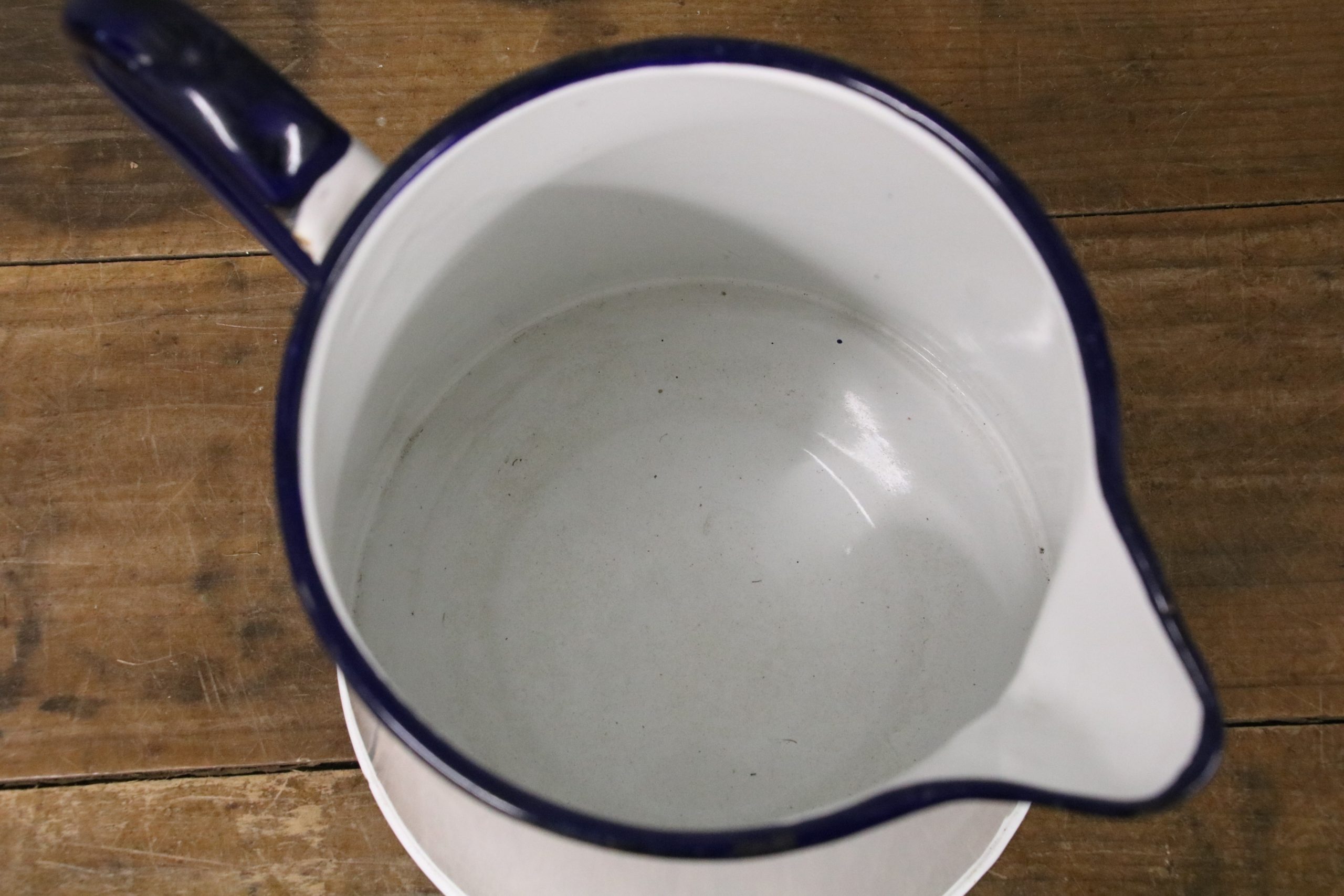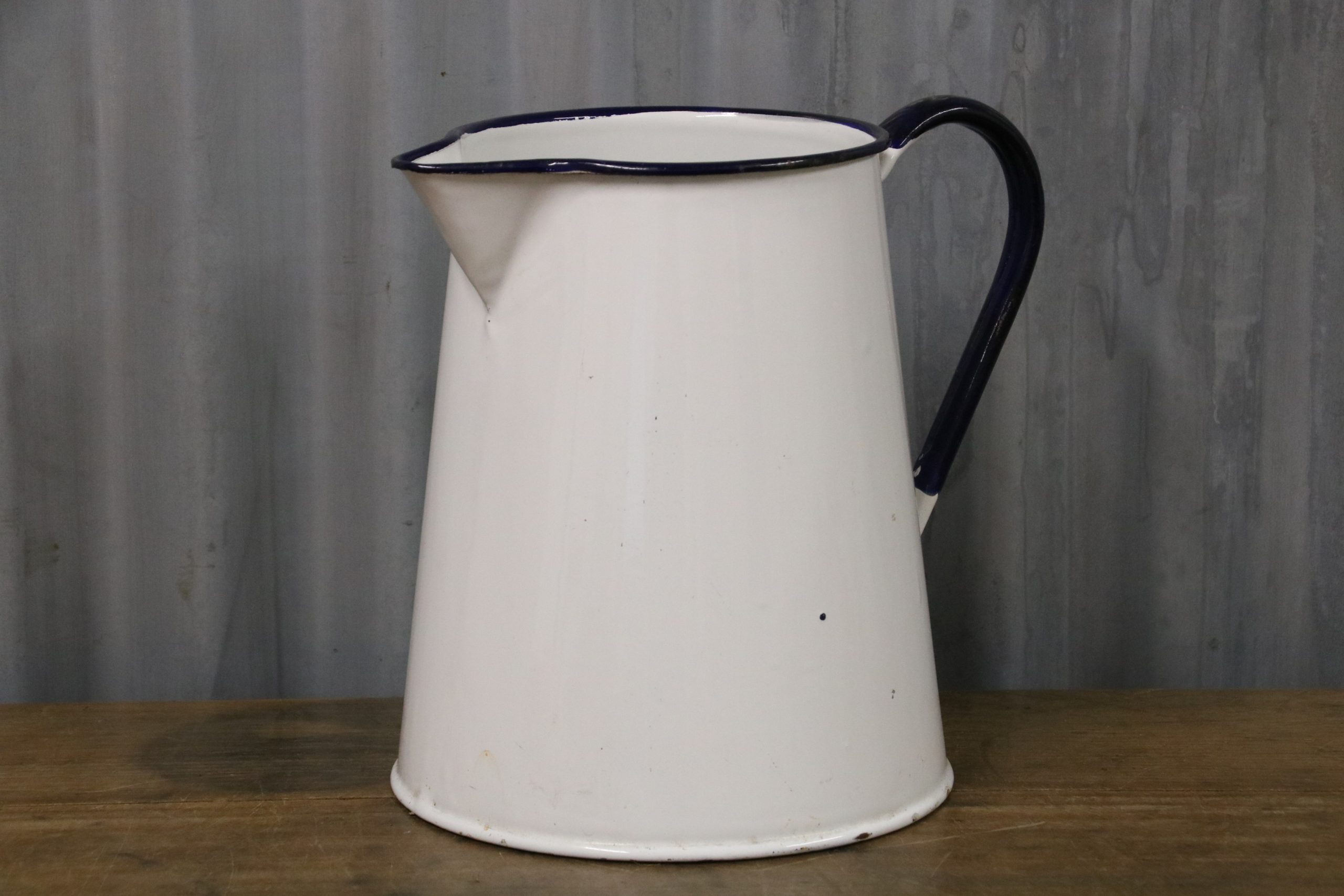 A lovely large white enamel jug, perfect for displaying homegrown cut flowers inside.