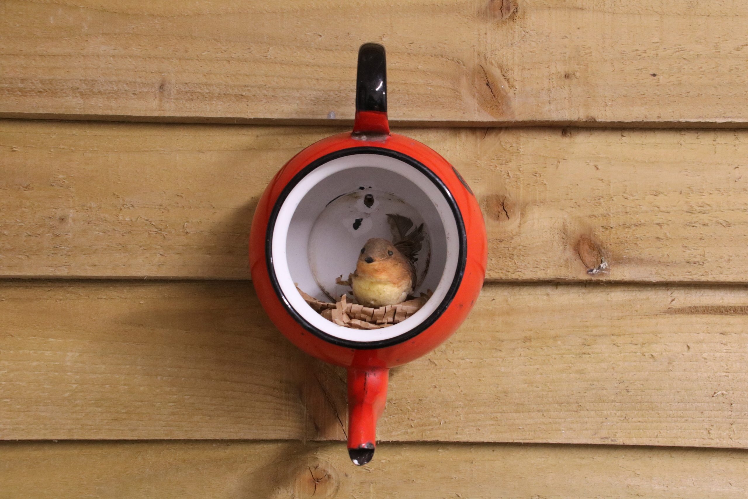 A vintage red enamel teapot which has been upcycled into a bird nest. Could also be used as a garden planter too!
