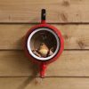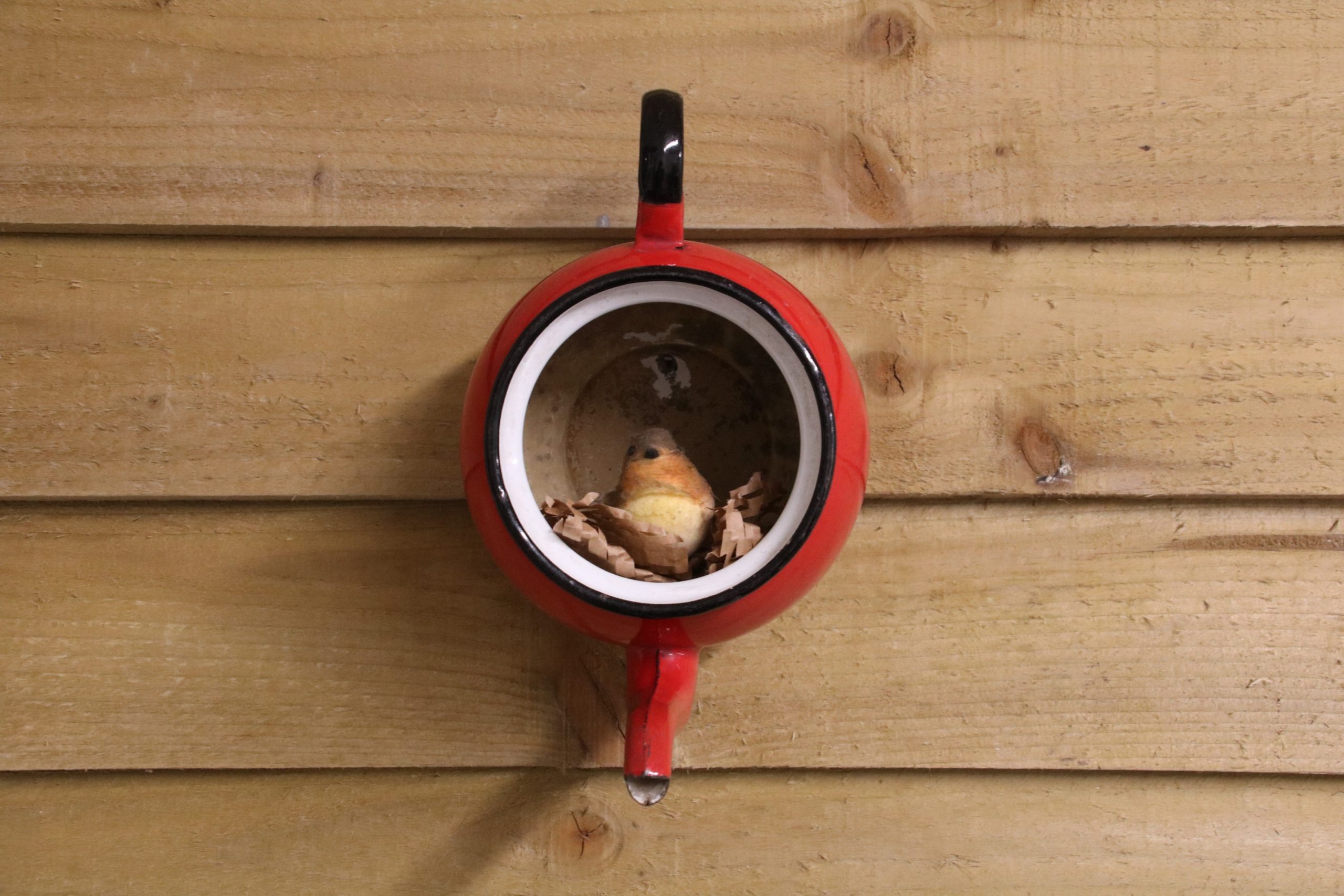 A vintage red enamel teapot which has been upcycled into a bird nest. Could also be used as a garden planter too!