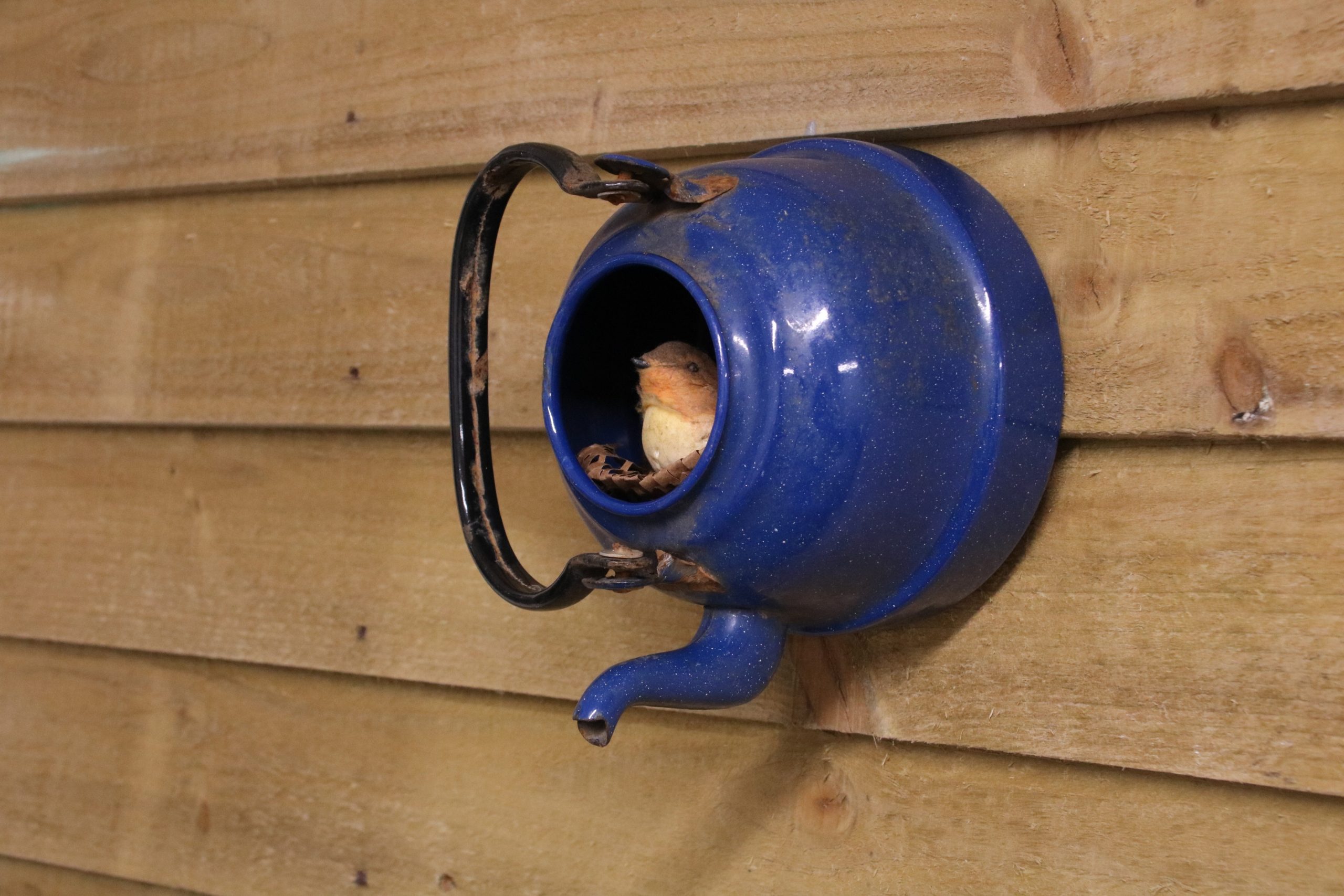 A vintage blue enamel teapot which has been upcycled into a bird nest. Could also be used as a garden planter too!
