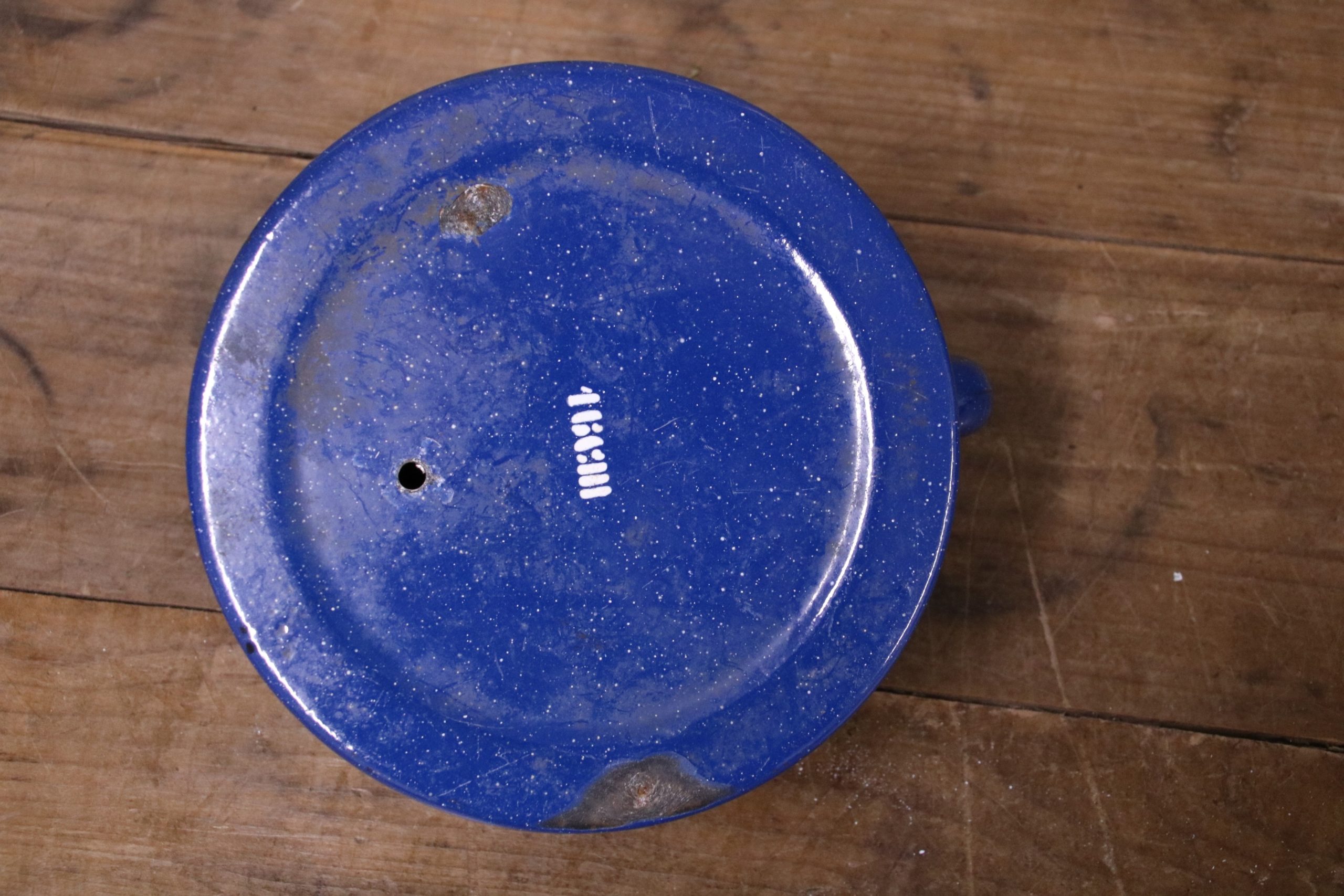The teapot is in very good, used condition with a few marks, stains and some chips on the enamel inside and out. It has a hole drilled into the back so it can be hung onto the wall, shed or tree. It has a folding handle.