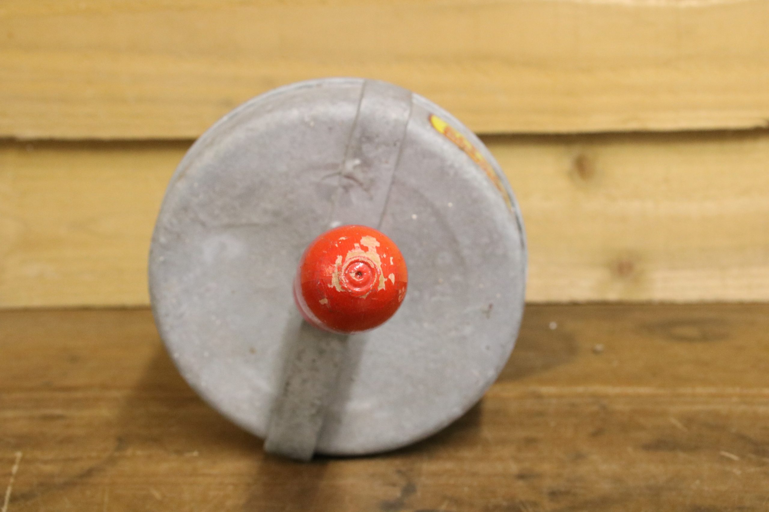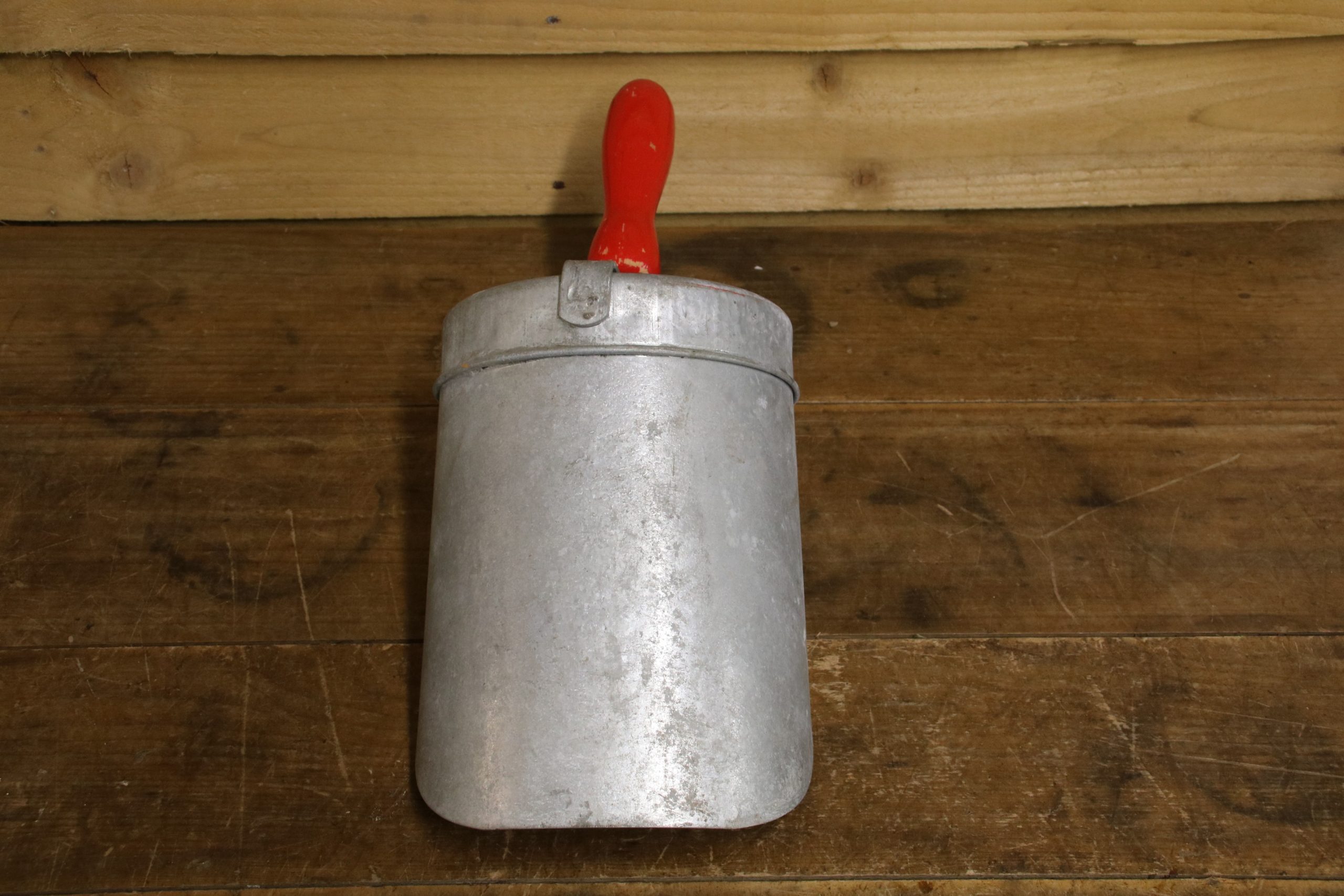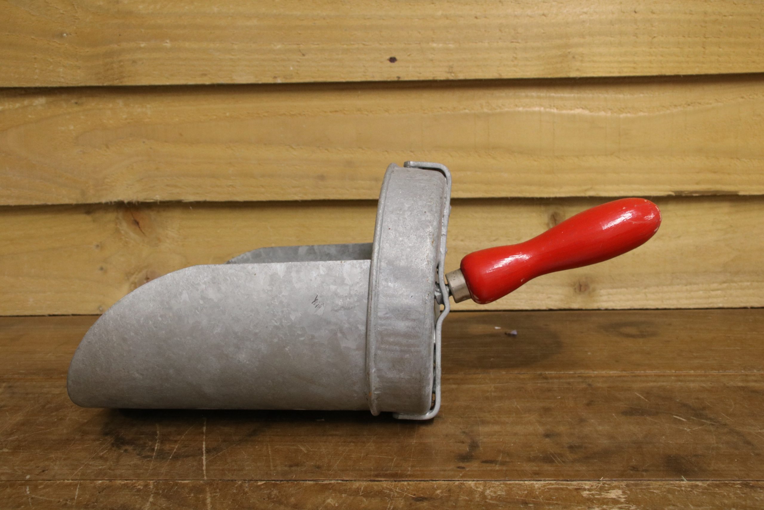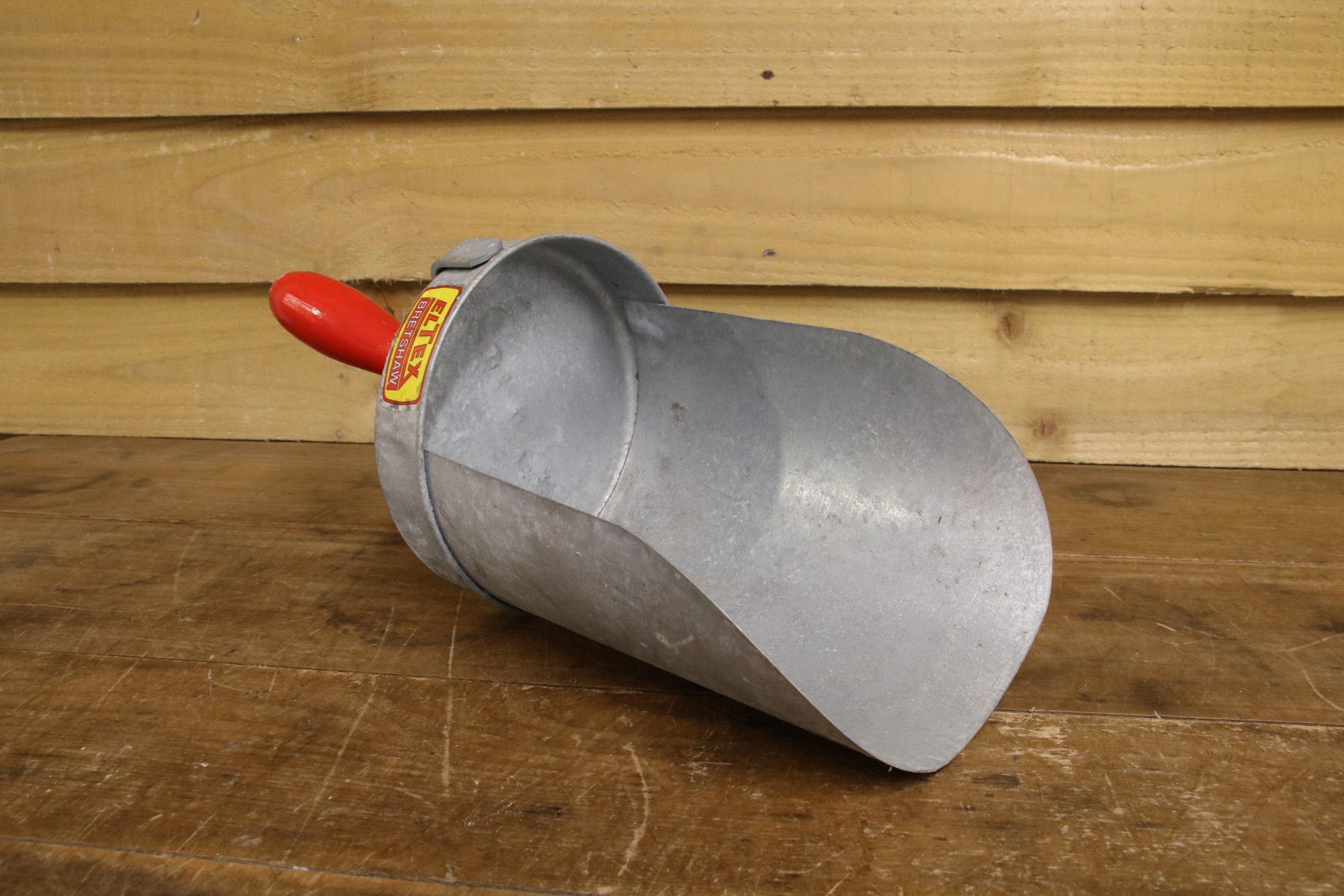 The scoop is in very good condition. It has a distressed red wooden handle and a manufacturer sticker which reads ‘Eltex Bretshaw.’
