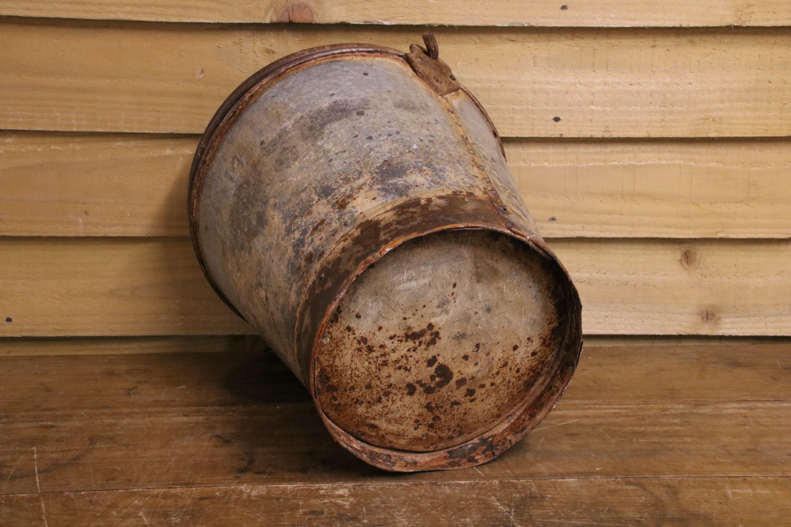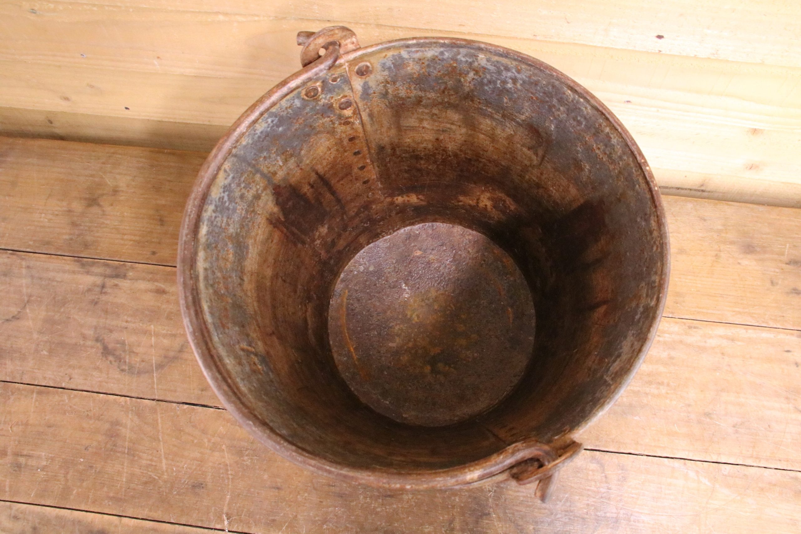 The bucket is in very good, used condition with a few marks, dings and stains due to age. It has one handle and rivets down the side seams. There are some stains inside.