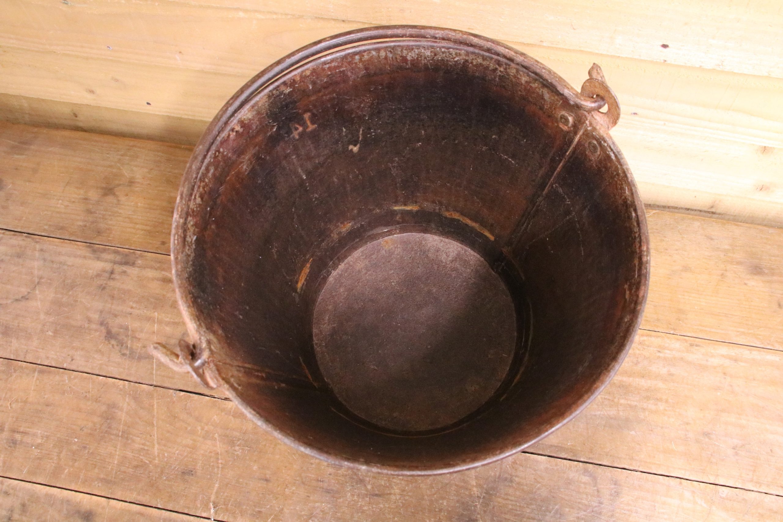 The bucket is in very good, used condition with a few marks, dings and stains due to age. It has one handle and there are some stains inside.
