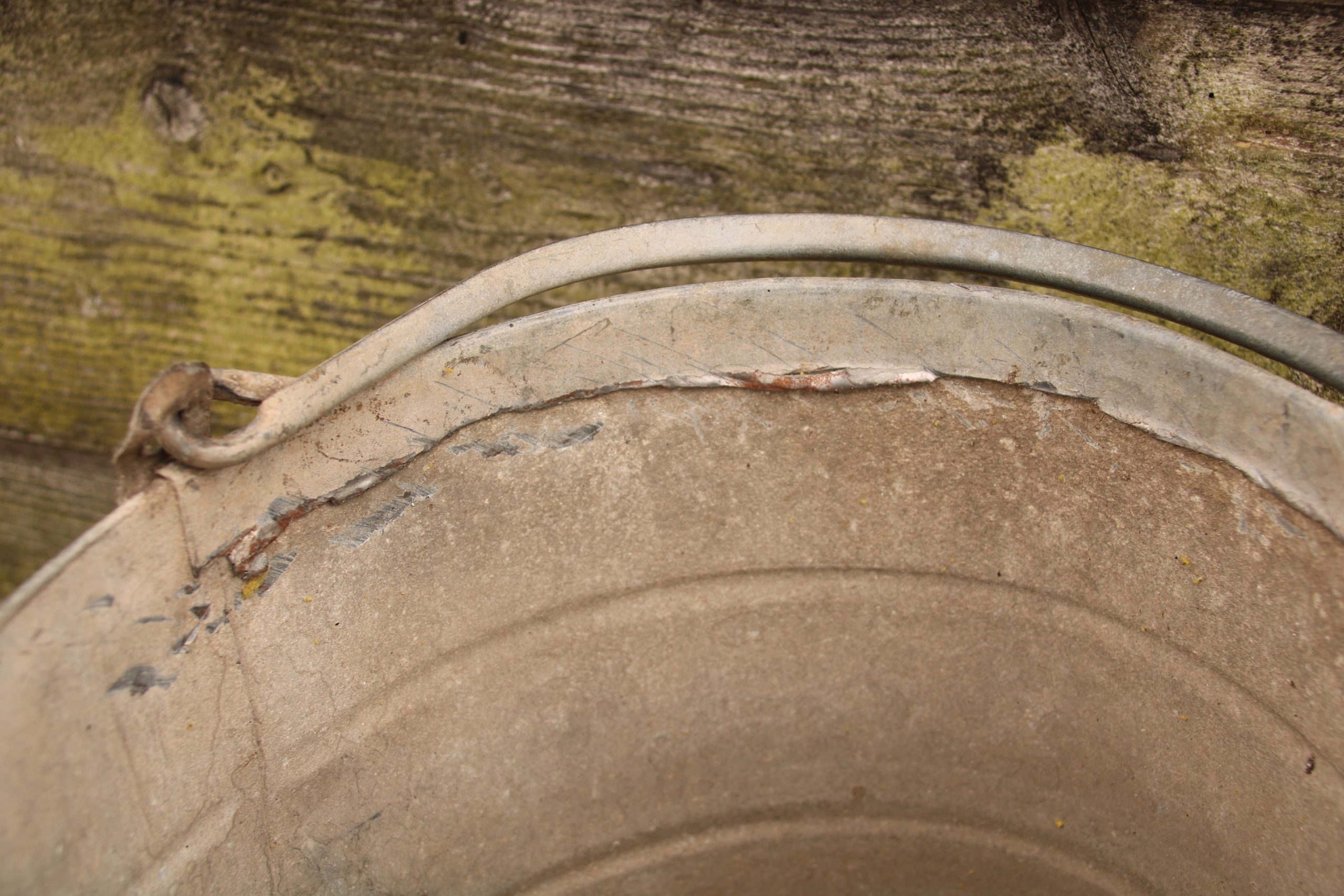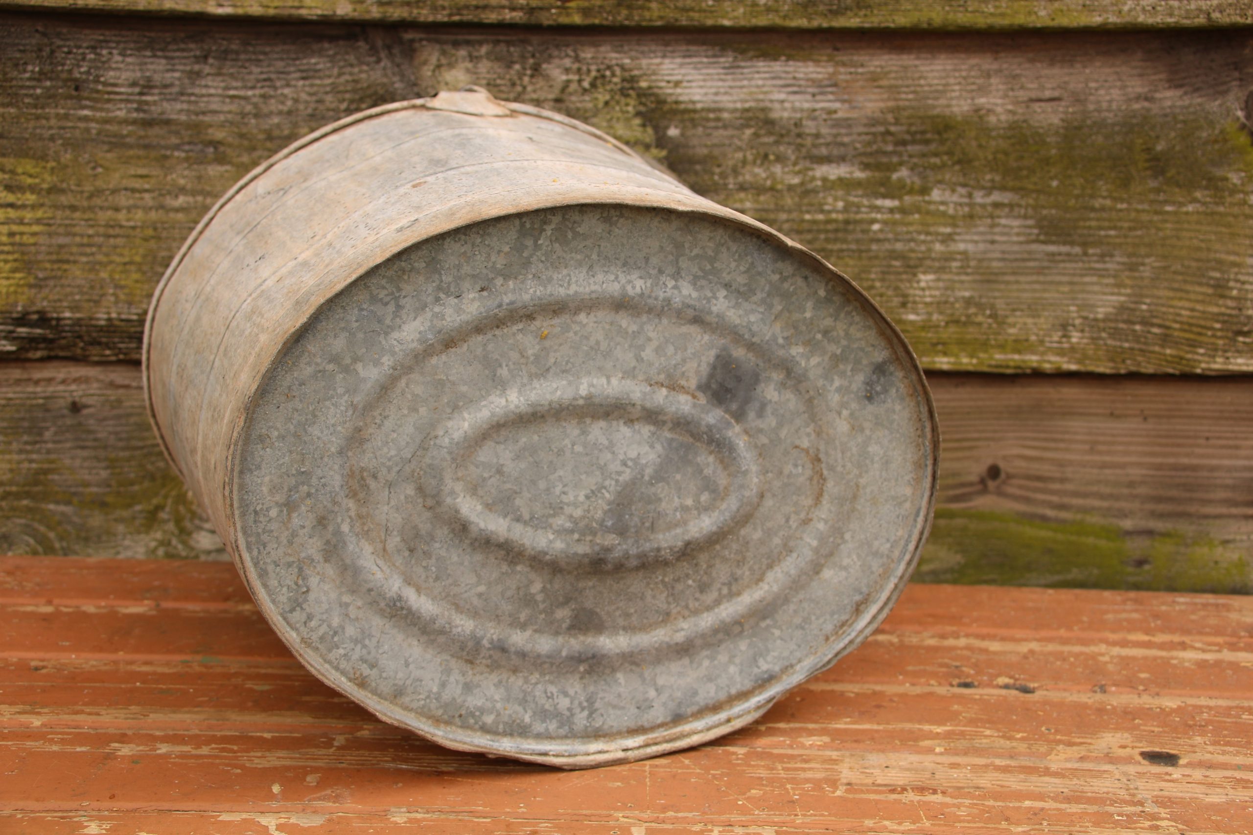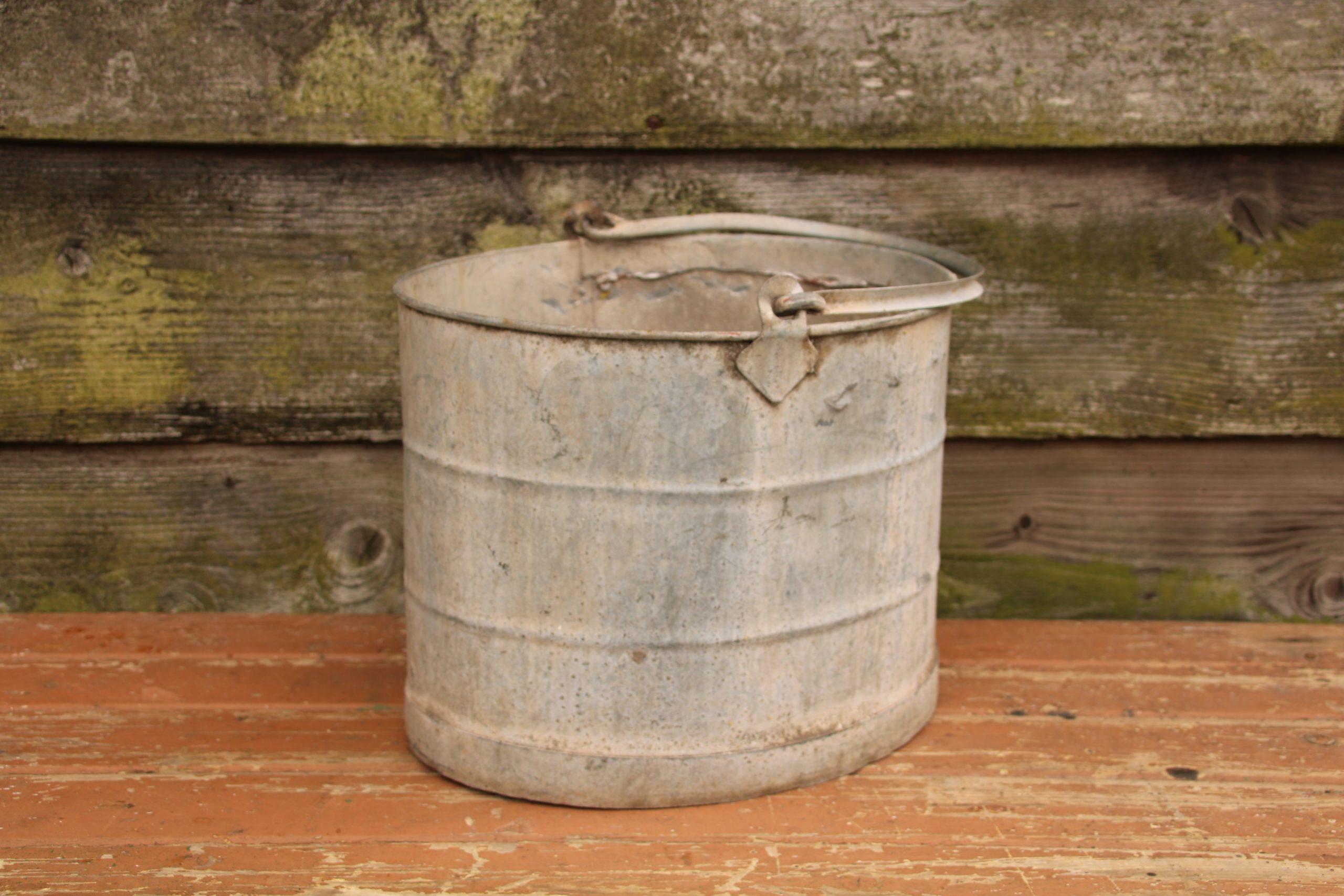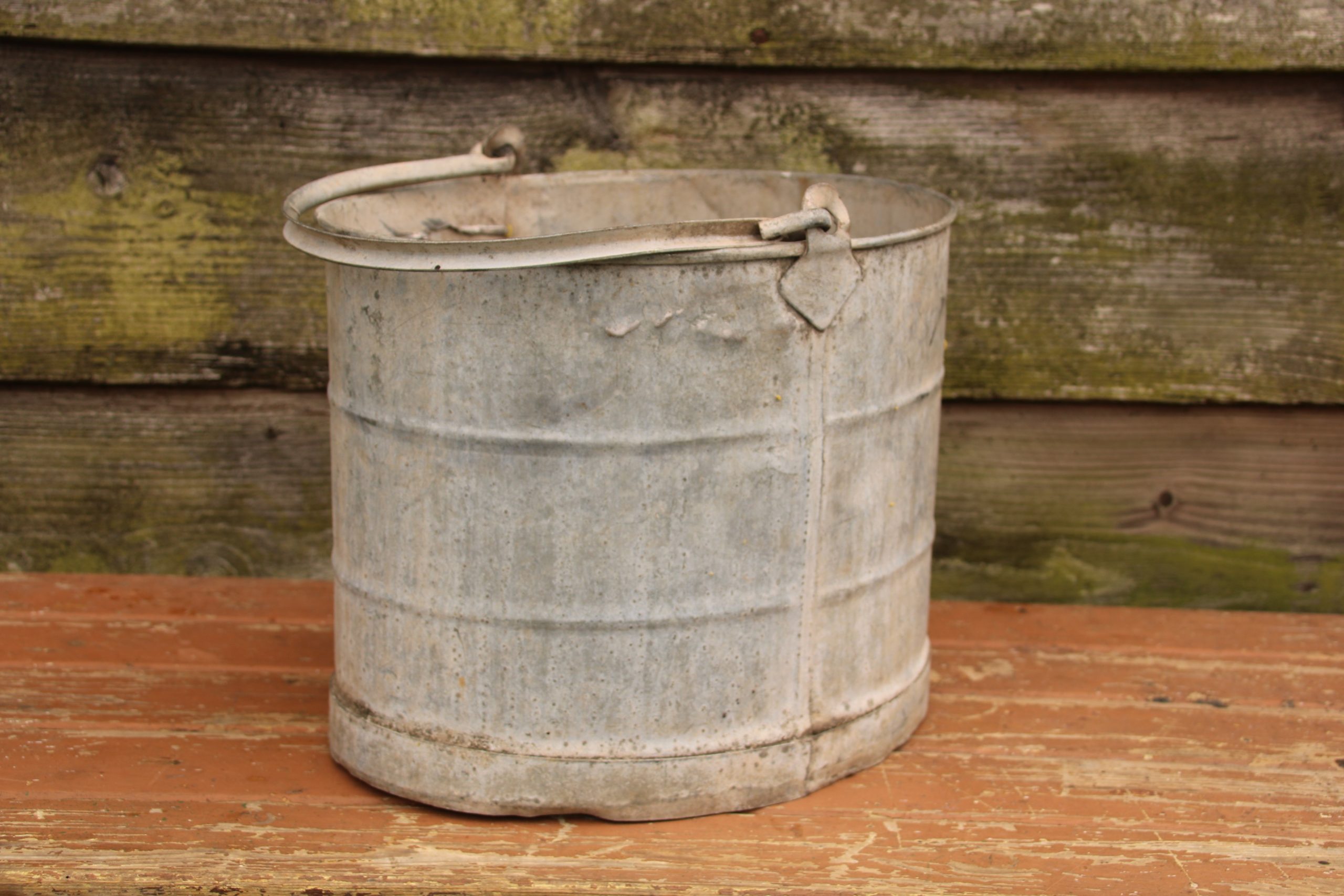 A vintage galvanised mop bucket which has had the inner workings removed to upcycle into a quirky garden planter.