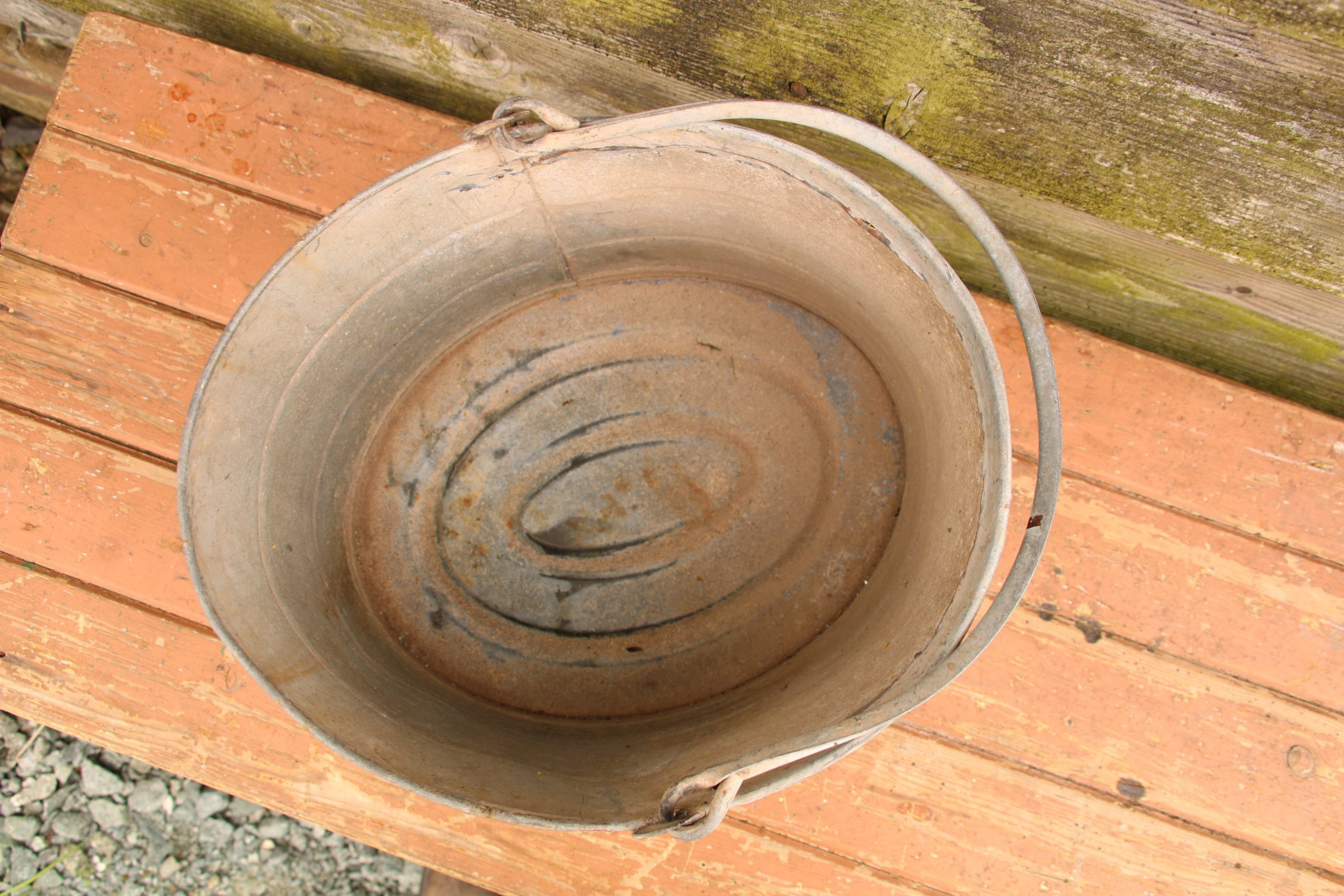 The bucket is in good, used condition with a few marks, dents and stains due to age. There is a mark inside where the metal inner used to be to drain the mop and it has one handle.