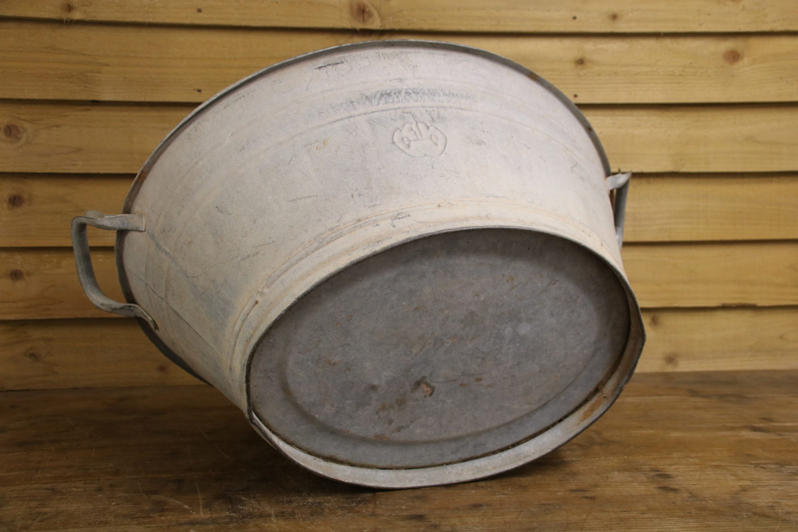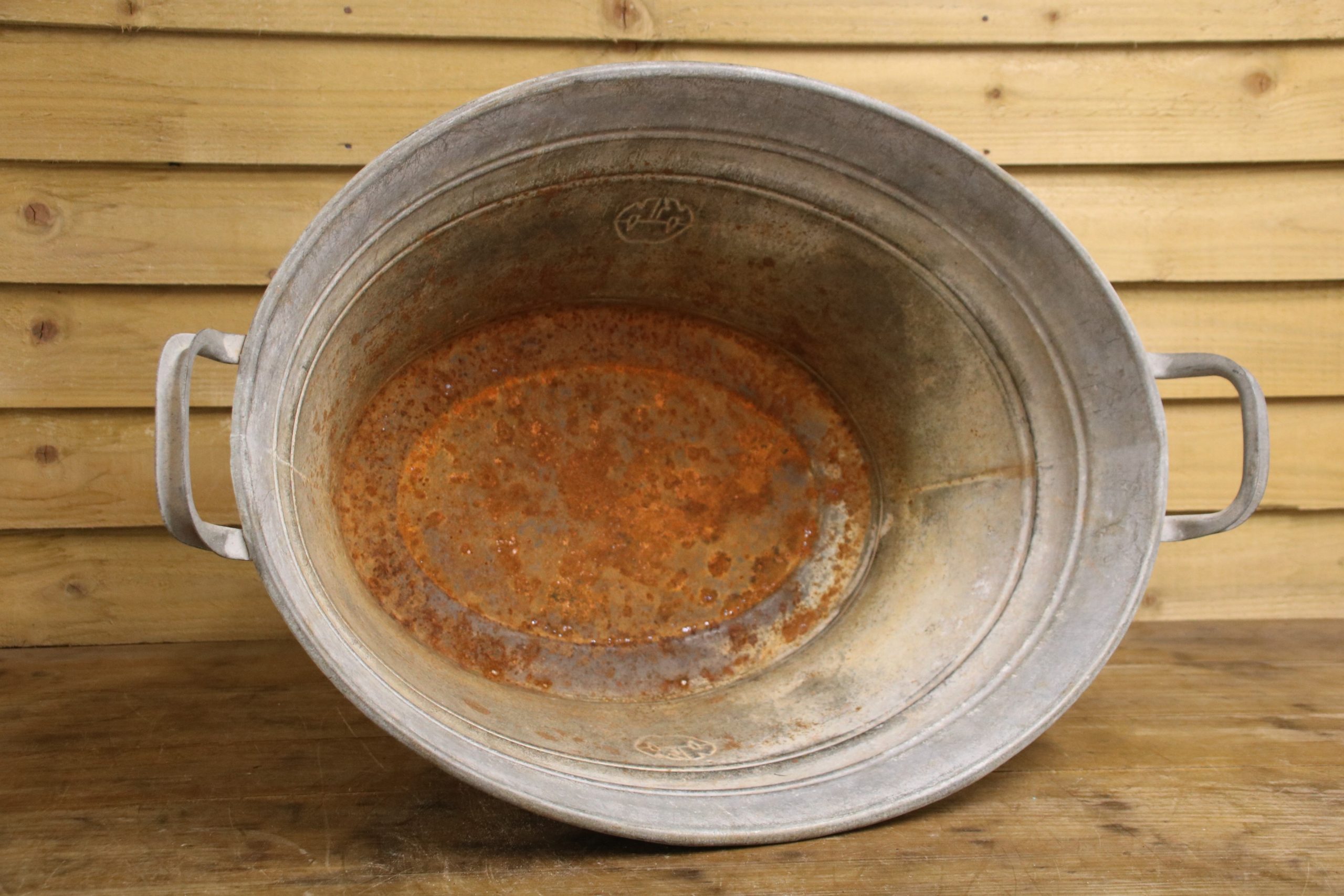 The tub is in very good condition with a few marks and stains due to age. It has two handles and there is some top rust inside.