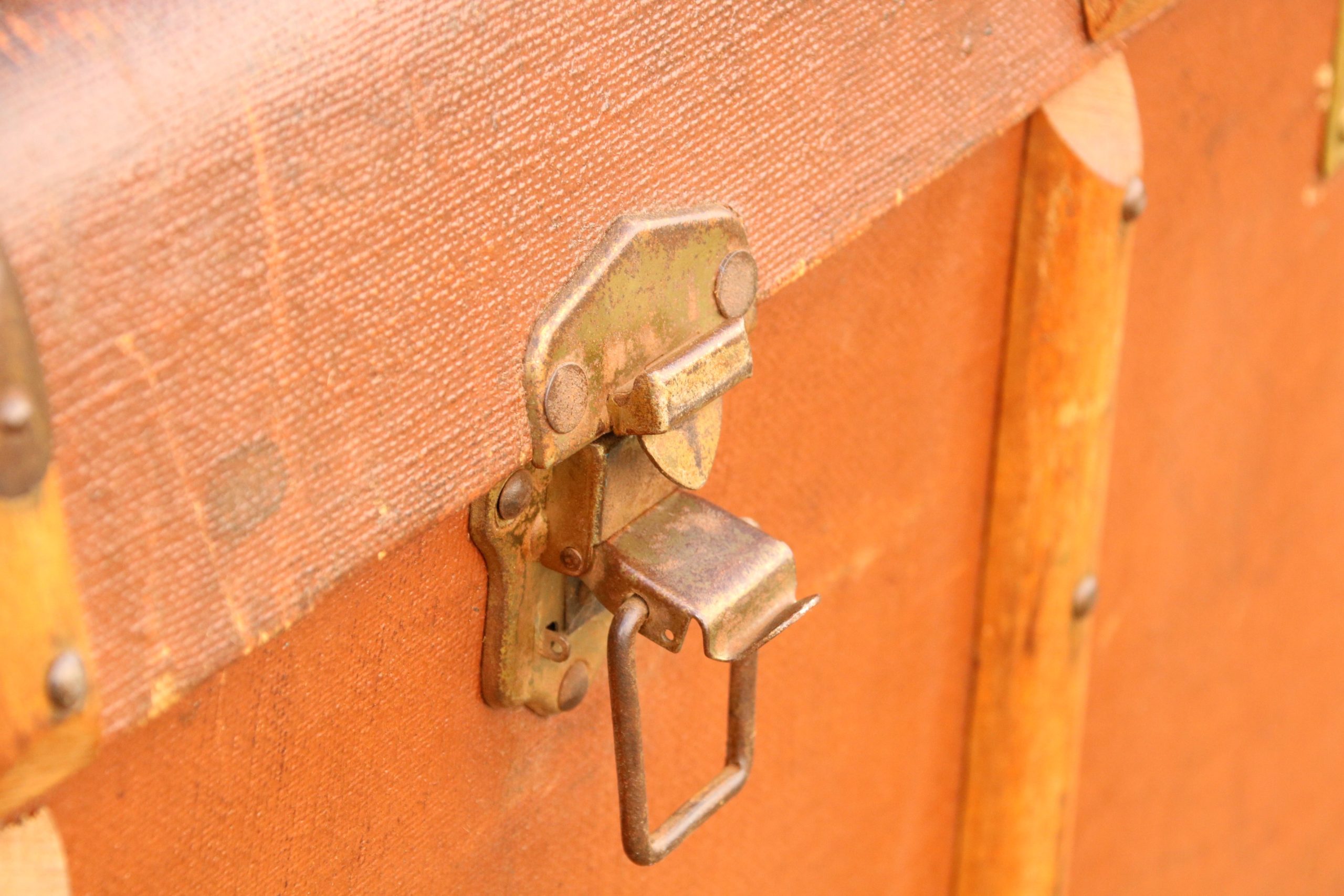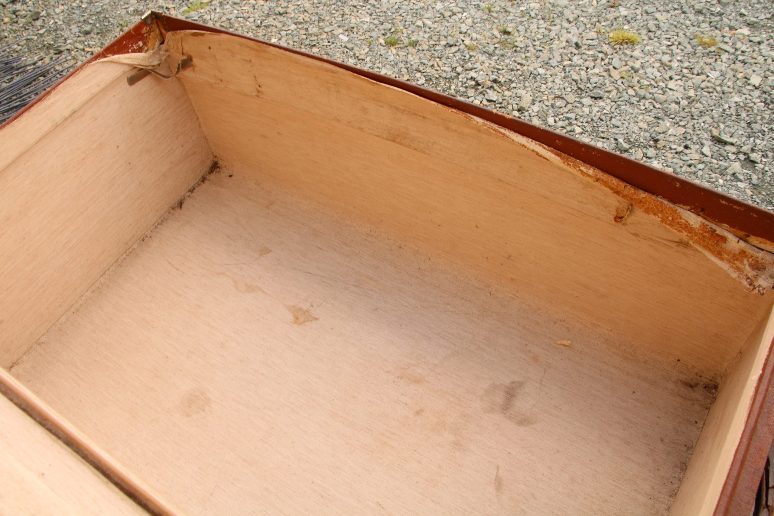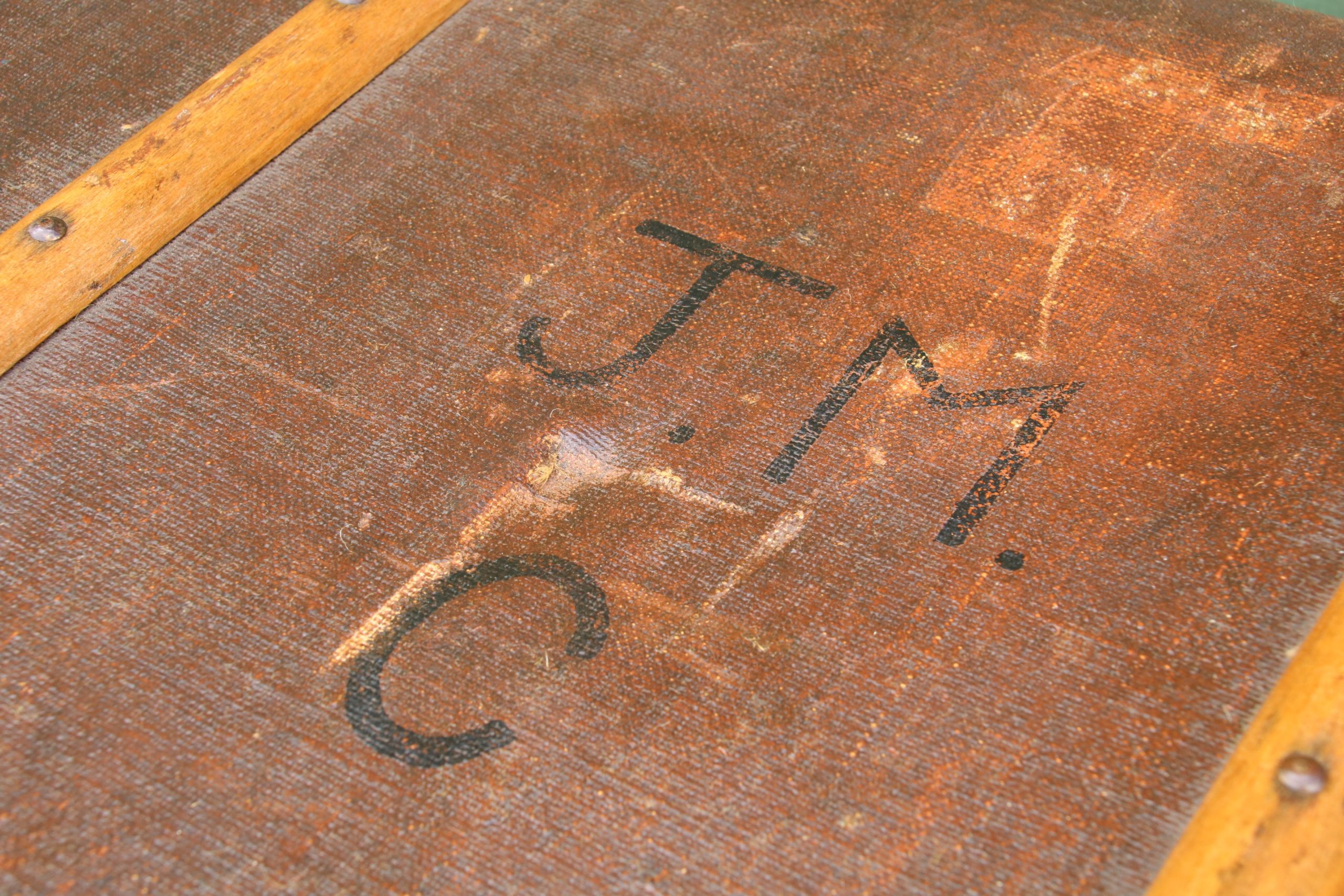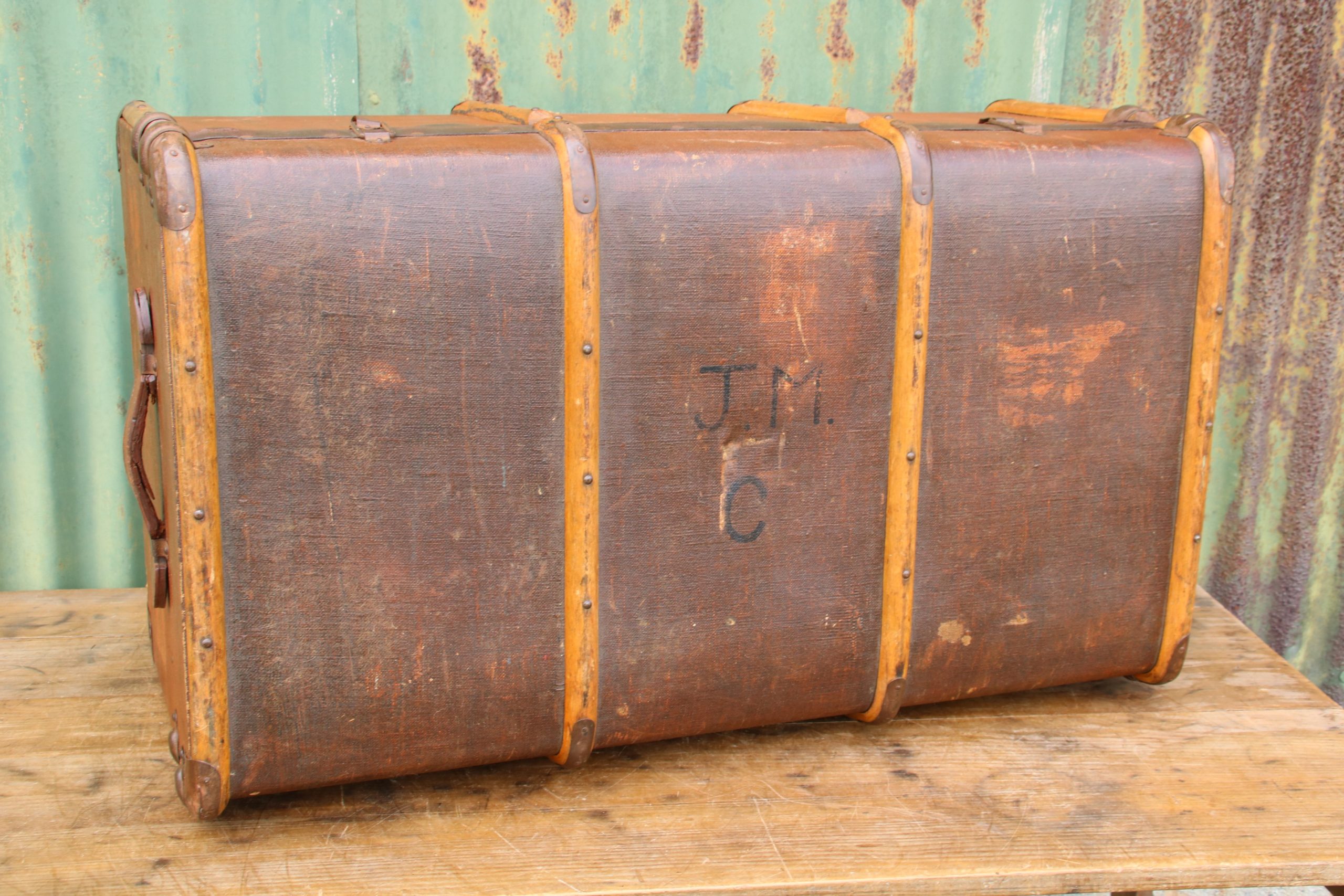 The trunk is in very good condition with a few marks, stains and scratches due to age. It has a beautiful distressed and tatty look to it with lots of character. It has two handles, one clasp and 2 locks, no key is included so it cannot be securely locked but can be opened and closed. The locks are a little stiff and hard to close due to the lid being bowed outwards slightly.