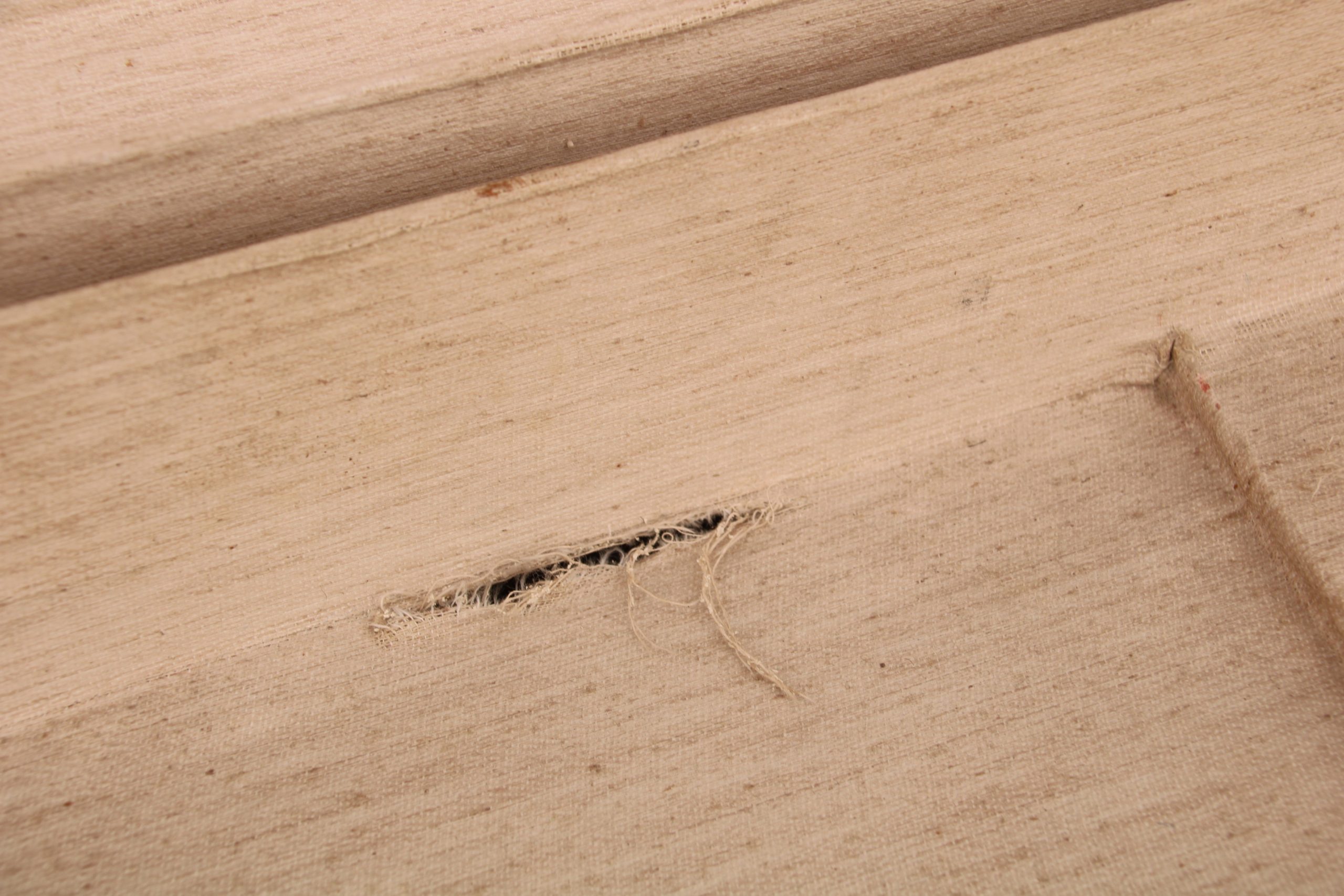 The inside is lined with fabric and has a few tears and stains. It comes with a removable tray which has a tear on it.