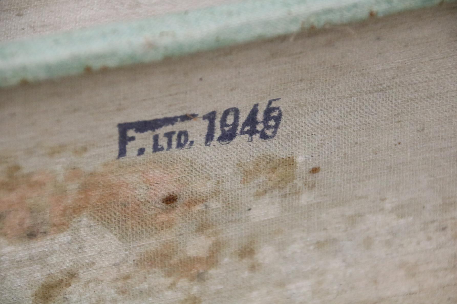The inside is lined with fabric, with a few stains and marks, a stamp reads ‘F Ltd 1949’.