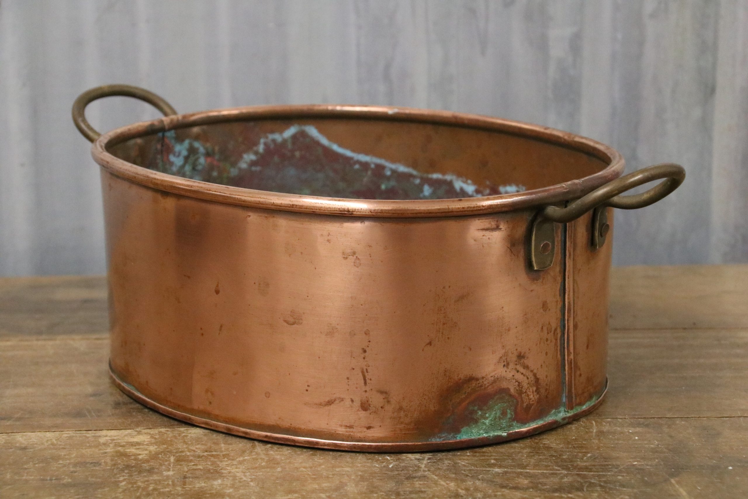 The tub is in very good, used condition with a few marks, stains and some small dents due to age. It has 2 handles and some stains inside too. There are signs of verdigris on the container.