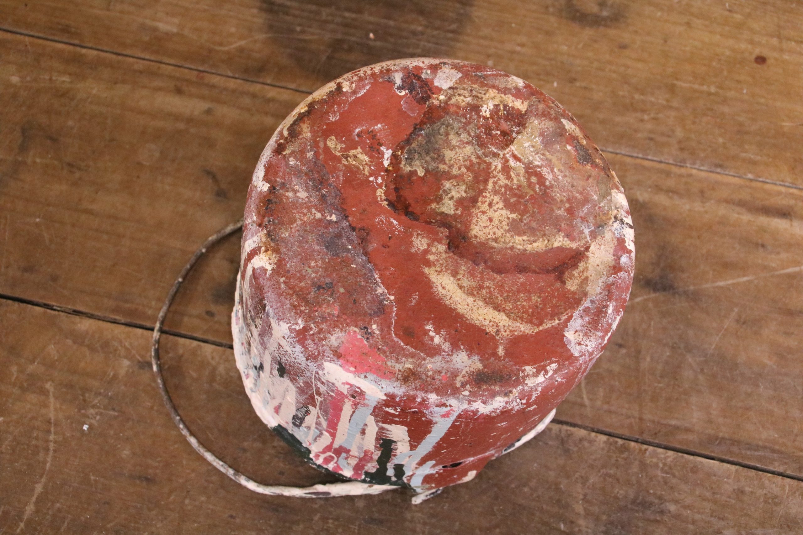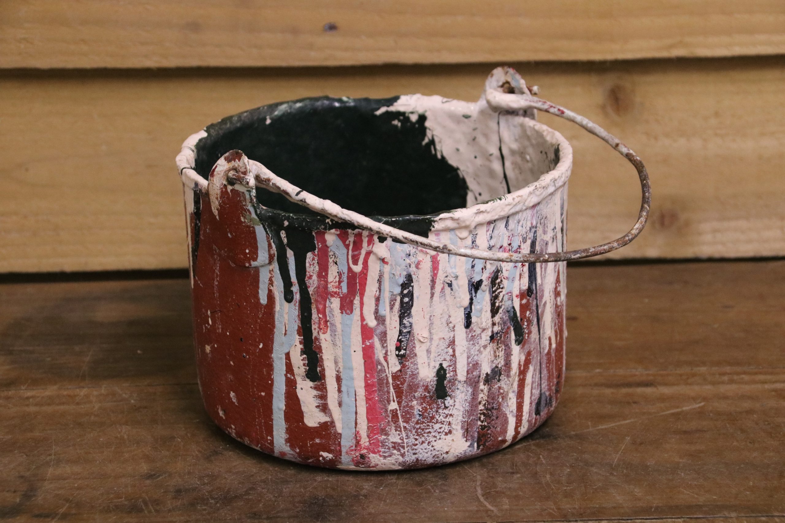 A lovely little vintage paint pot covered with thick layers of original paint.