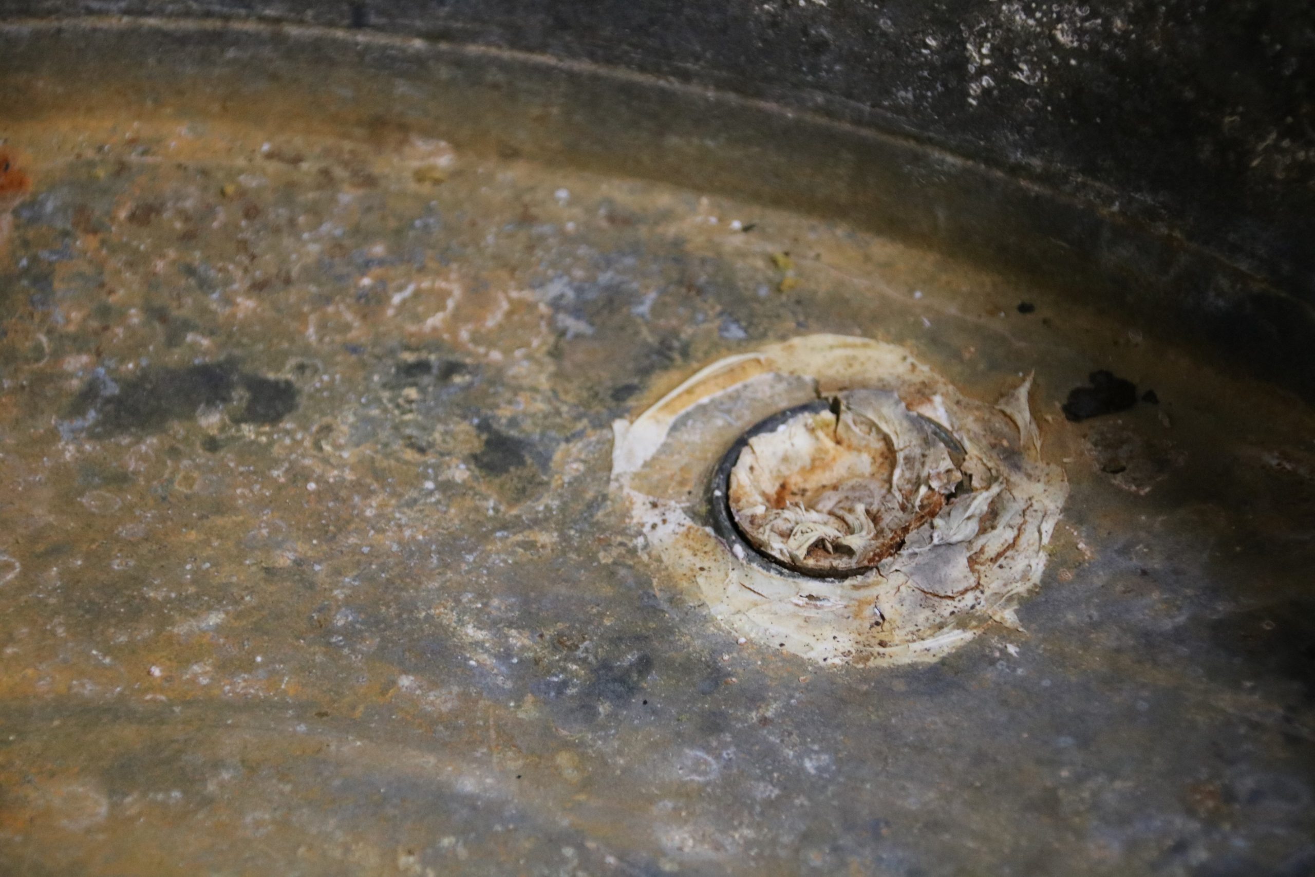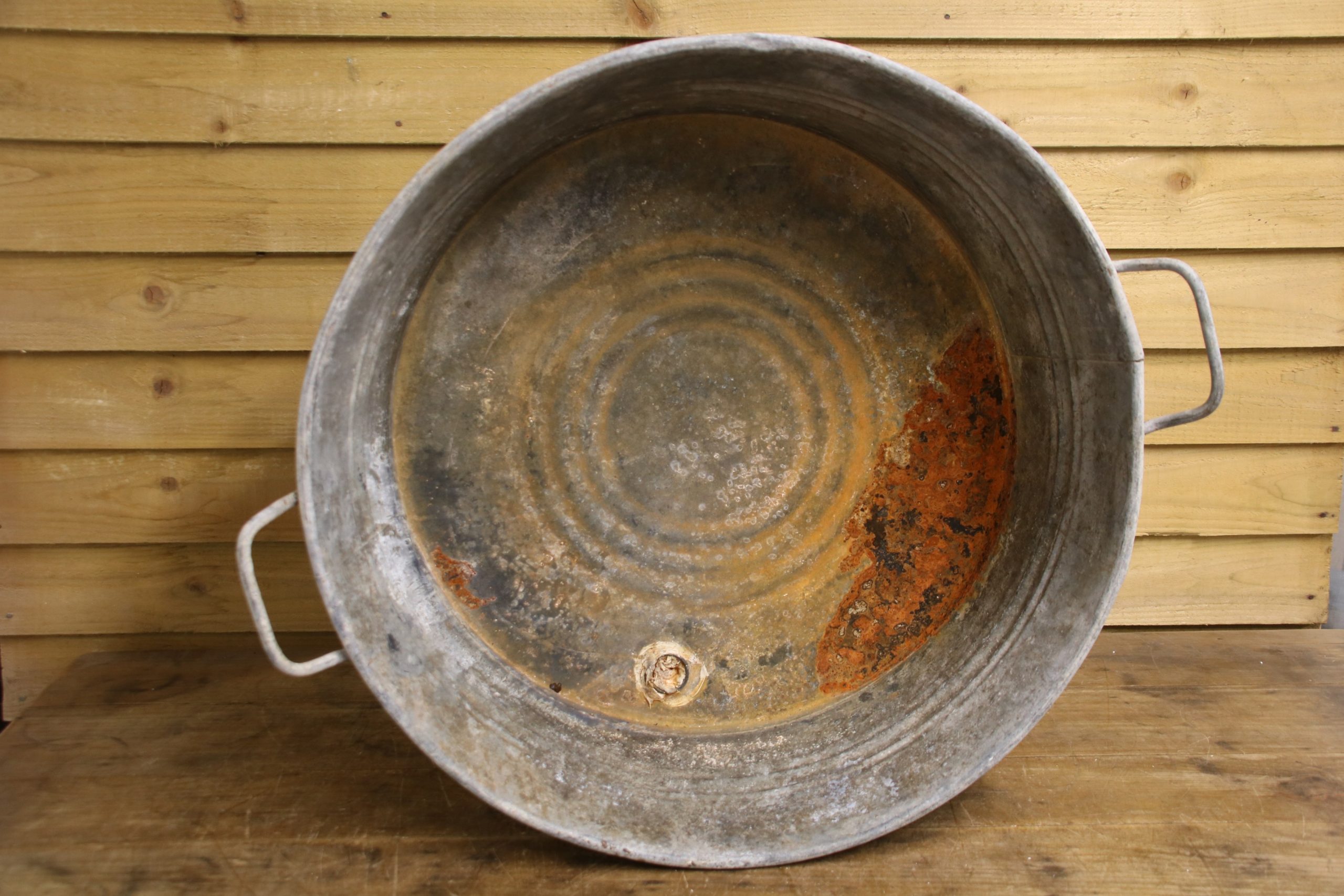The tub is in a well used condition with a few marks, stains and dents due to age. It has a lot of character! It has two handles and signs of top rust inside. The drainage plug hole has previously been filled with silicone.