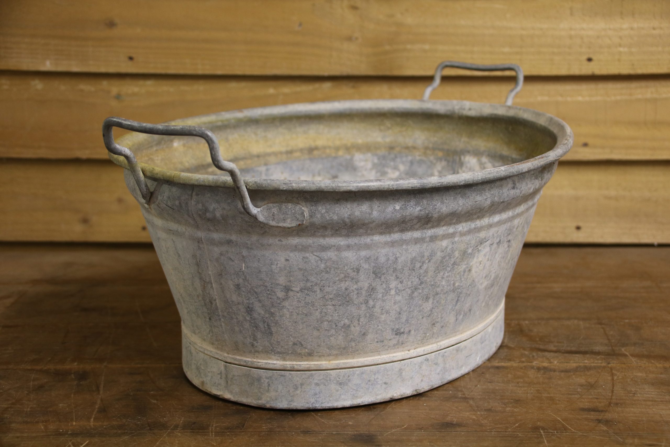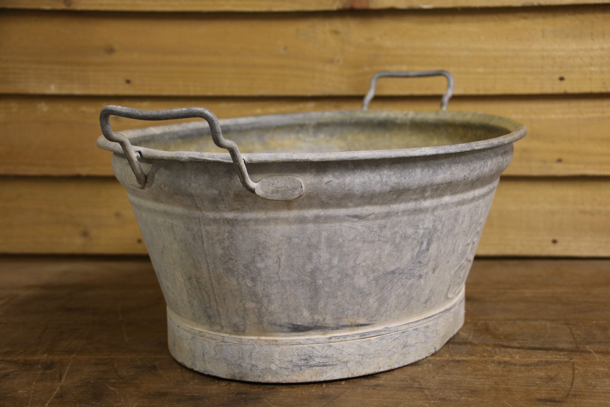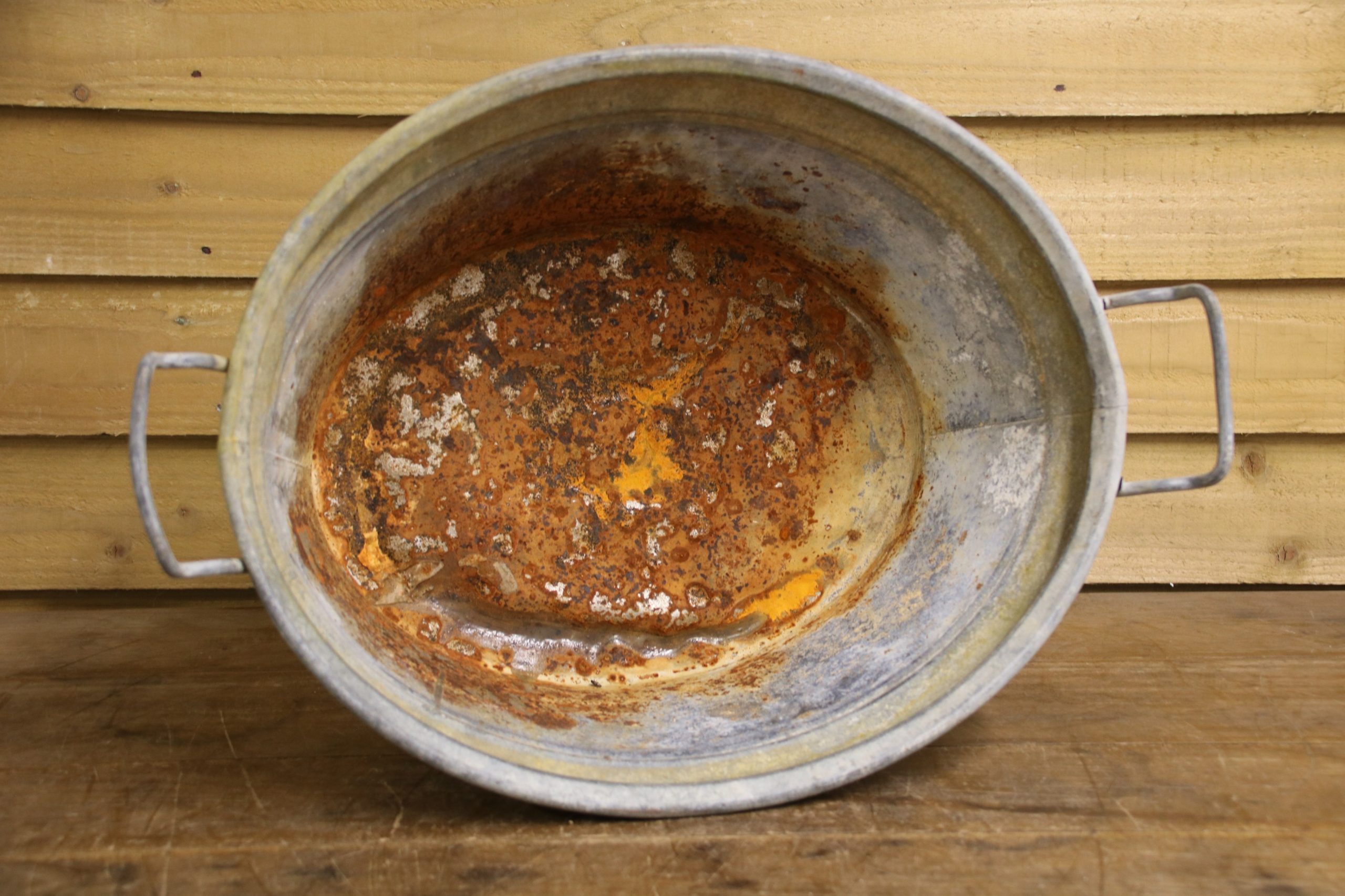 The tub is in good condition with a few marks and stains due to age. The bottom has quite a few dents and there are signs of top rust inside but it remains solid. It has two handles, one of which has come away from the top rim but is still a solid handle.