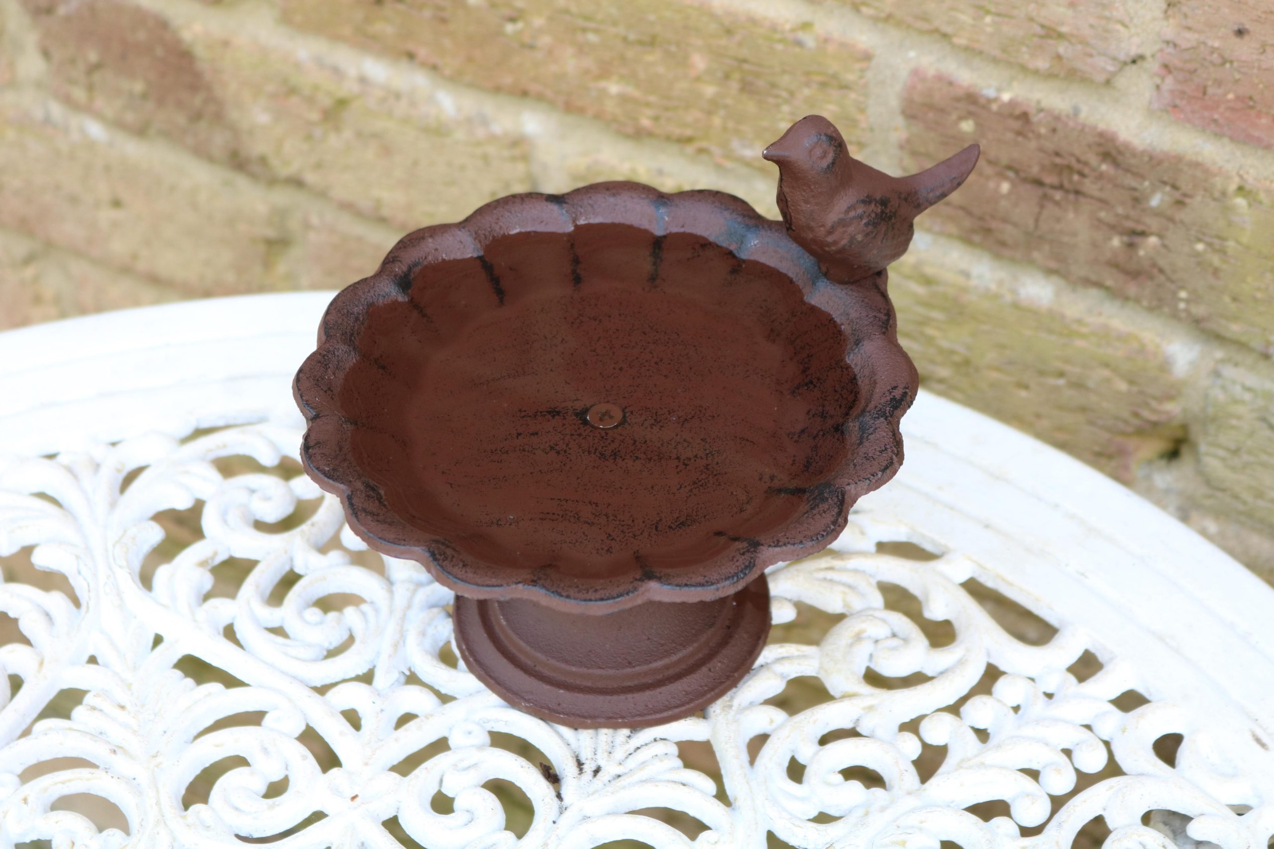 A beautiful small cast bird bath with an ornamental bird sitting on the edge. Can be used for water or bird seed.