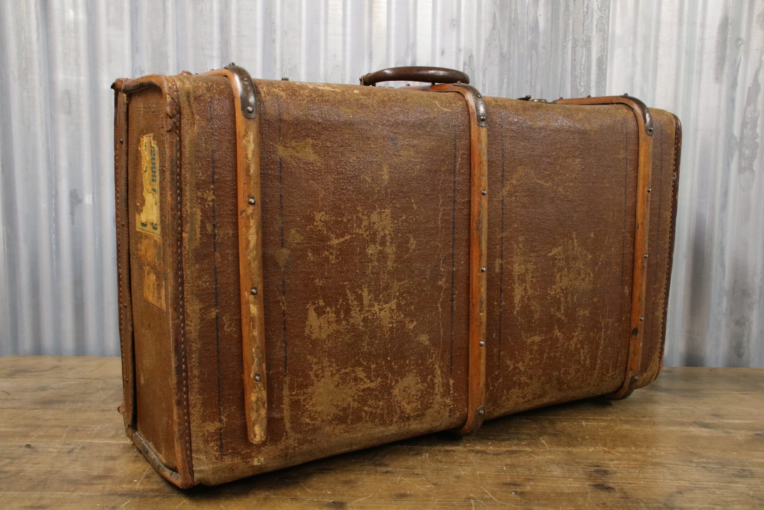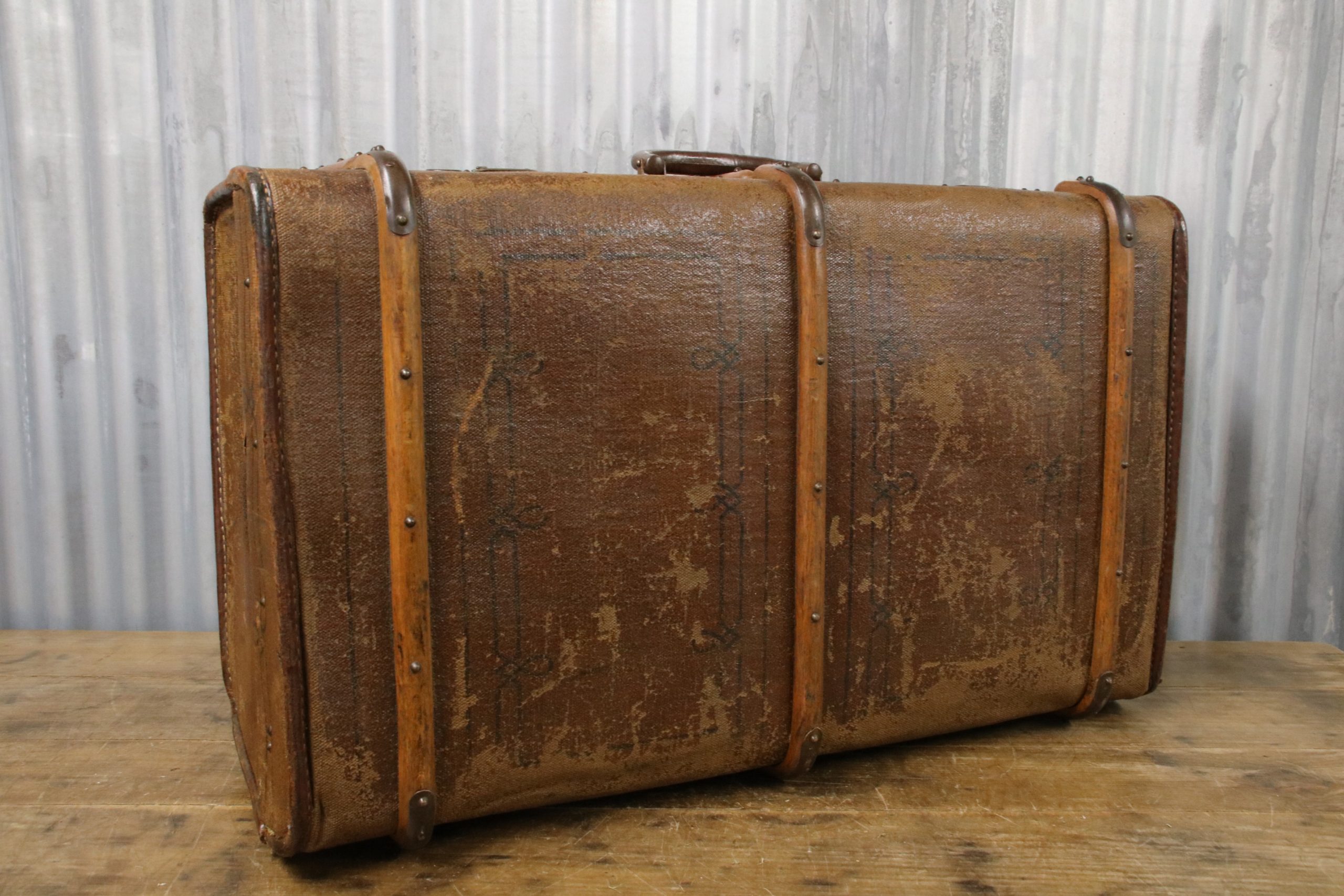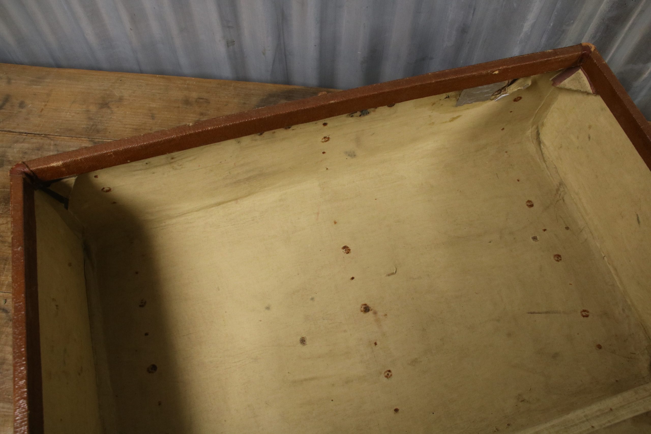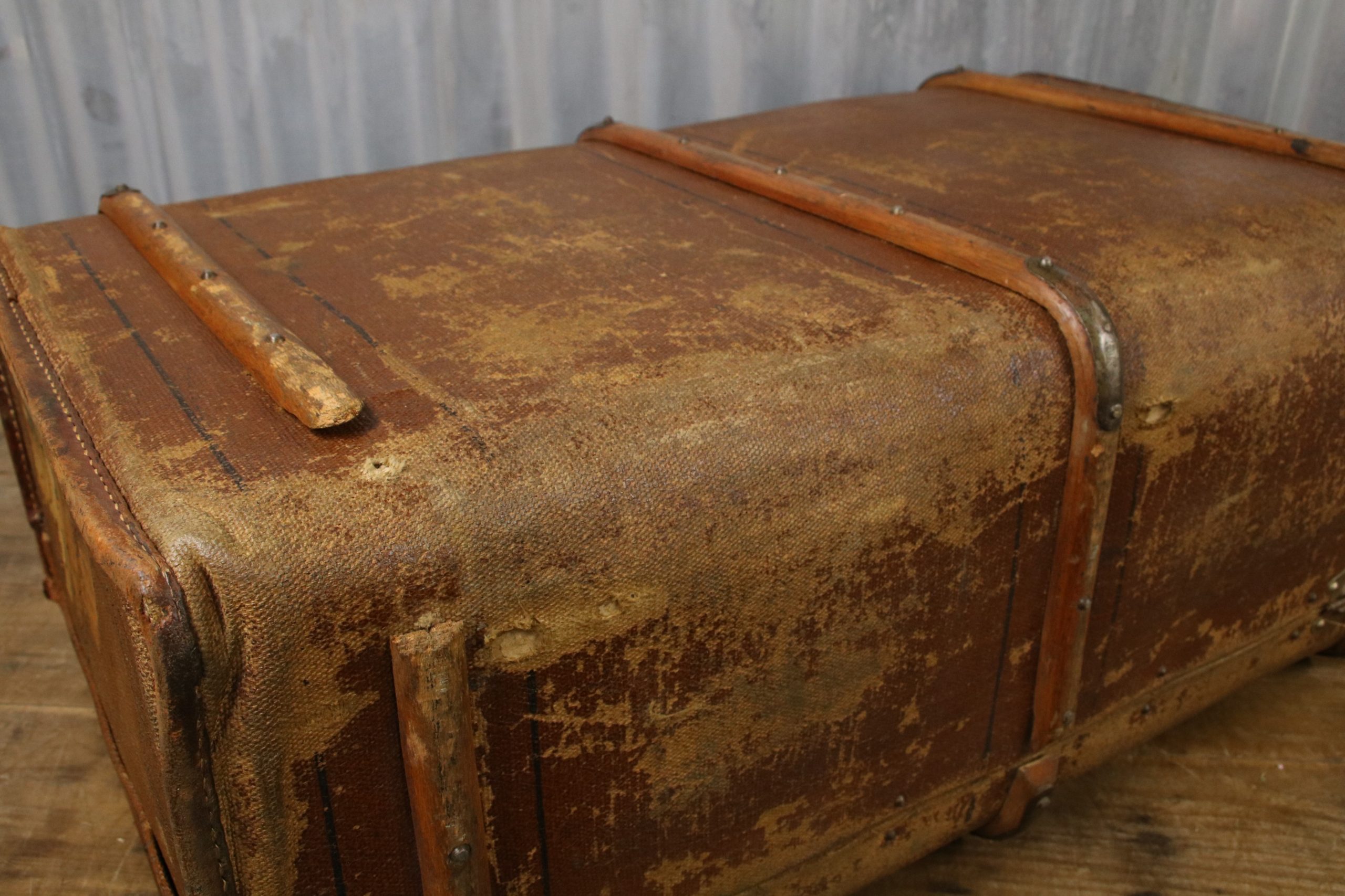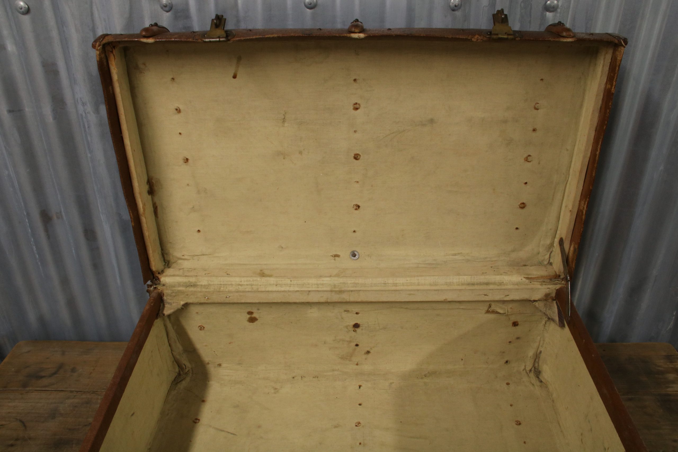 The trunk is in good condition with a few marks, stains and scratches due to age. It shows signs of use with worn patches, and there is a piece of wooden bar missing on the back corner. It has one handle and 2 locks, no key is included so it cannot be securely locked but can be opened and closed. There are also some original label sticker remnants on the trunk.