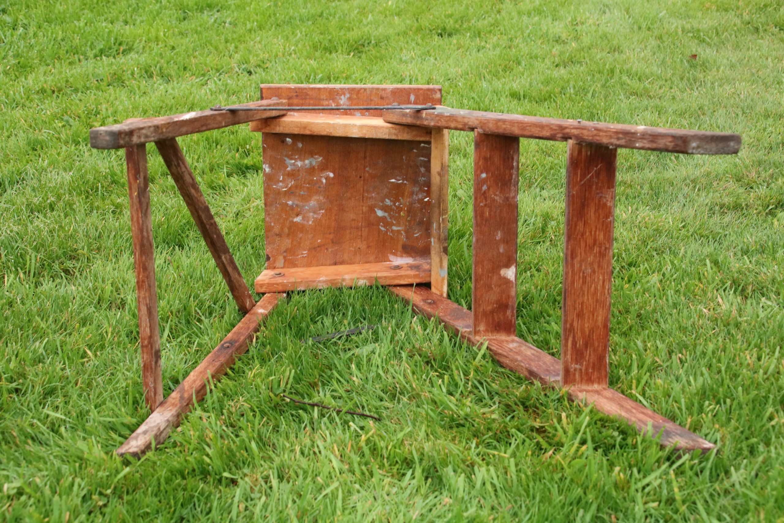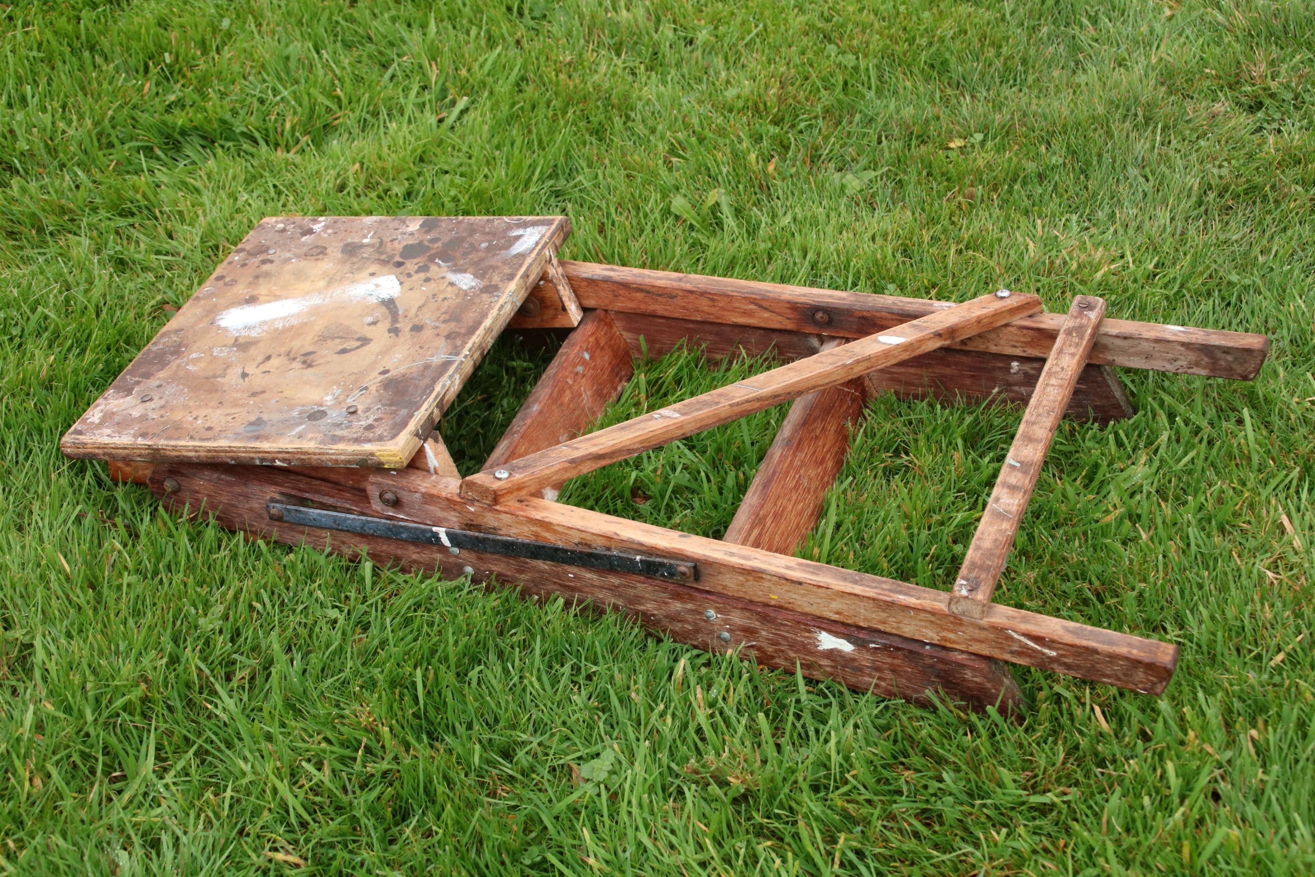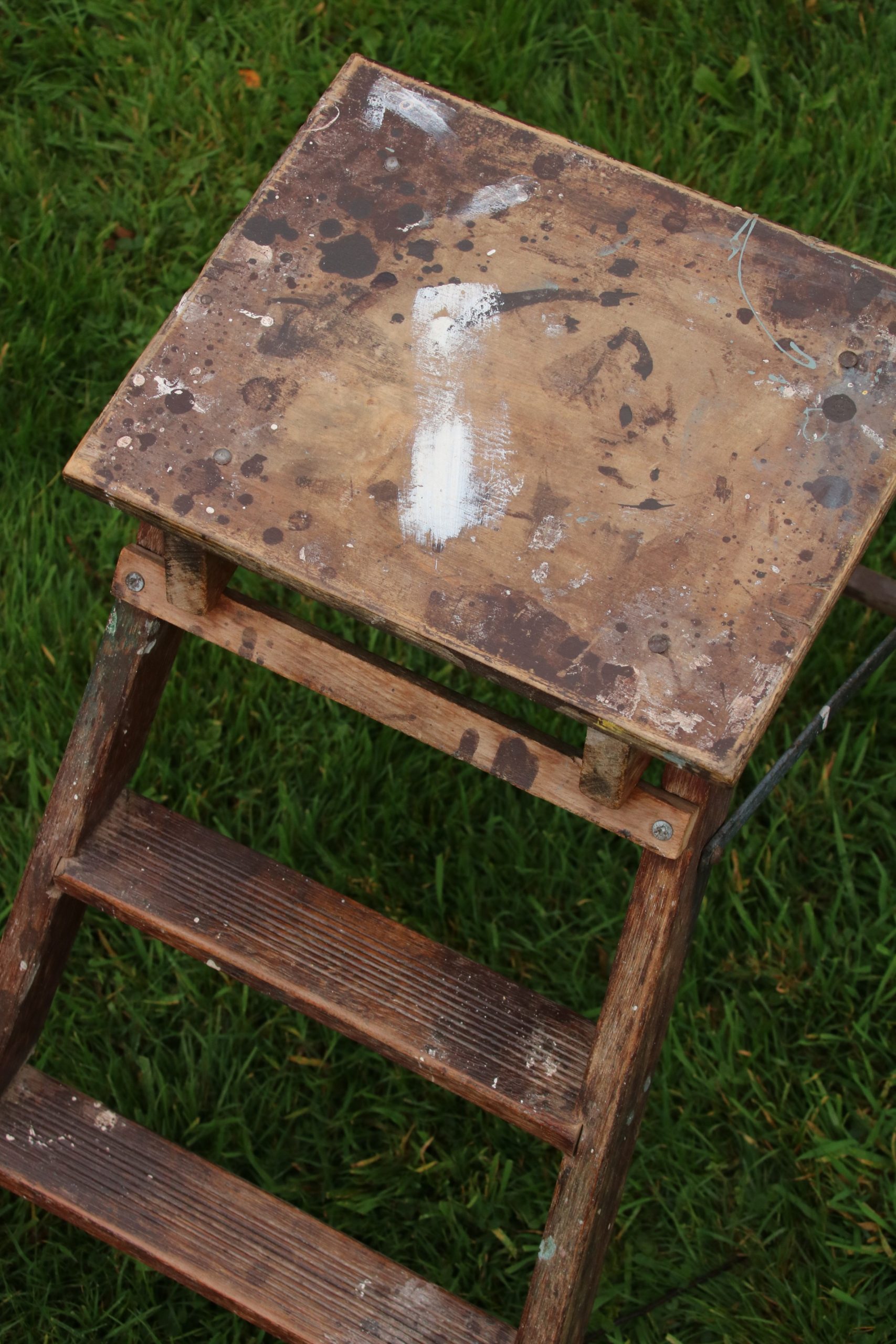 The ladder is in very good, used condition with some original paint splatters and marks. It has been waxed and folds down for storage. The top front bar has new screws in it.