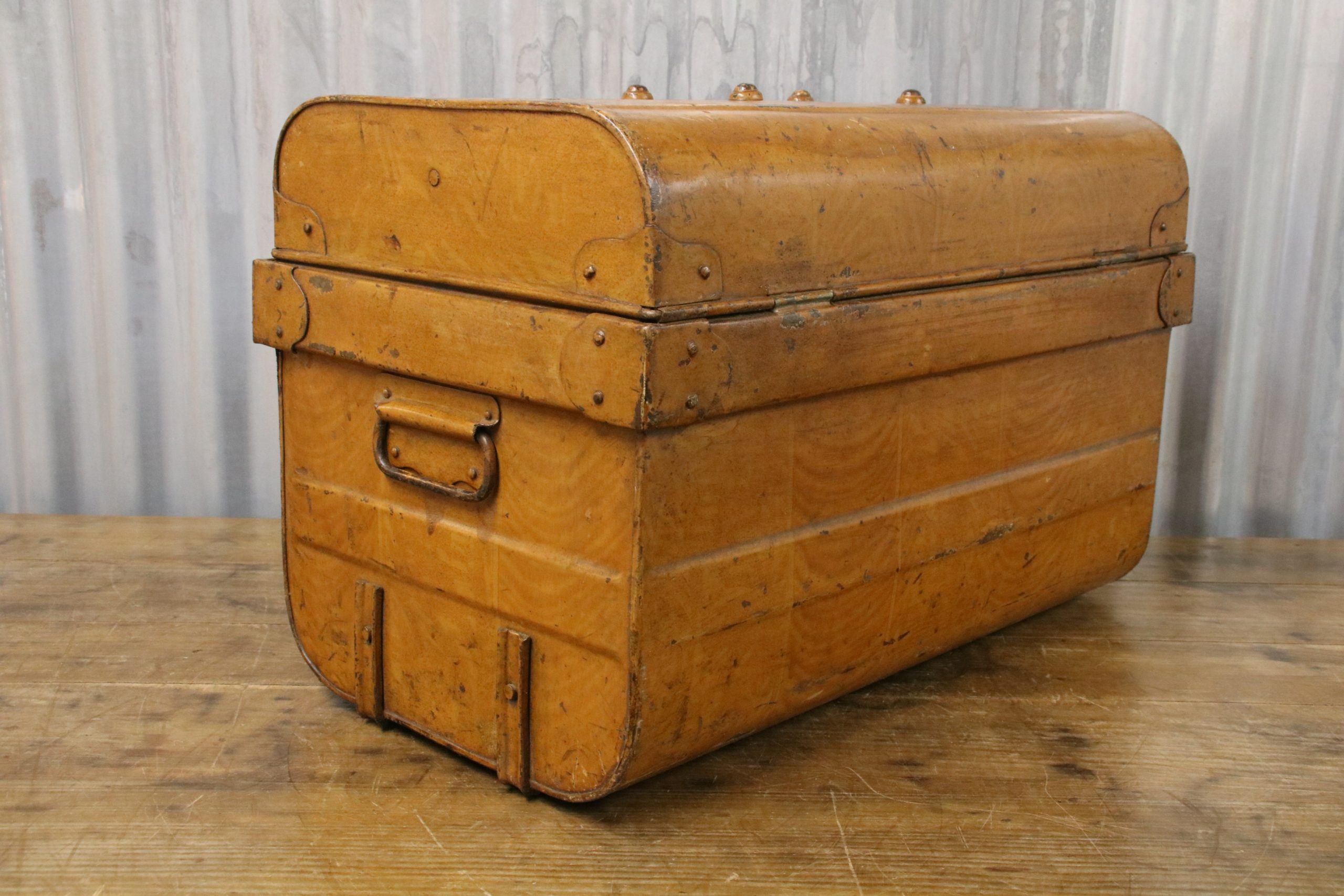 A very industrial, brown tin trunk. Perfect for storage or can be used as a small coffee table.