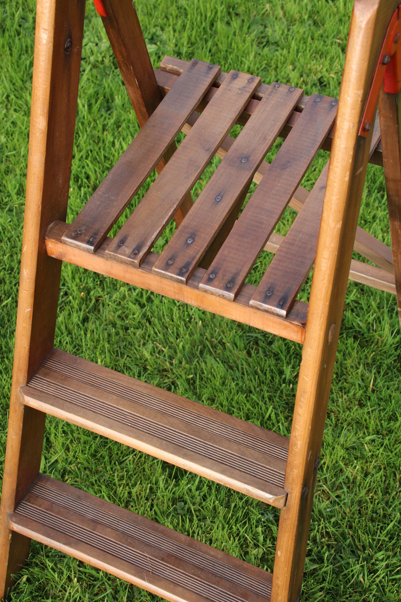The ladder is in very good, used condition with a few marks due to age. It has red painted metal hinges.