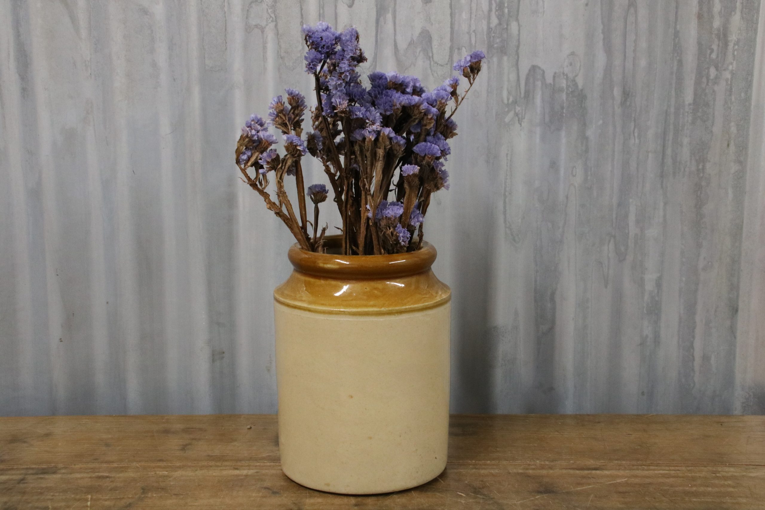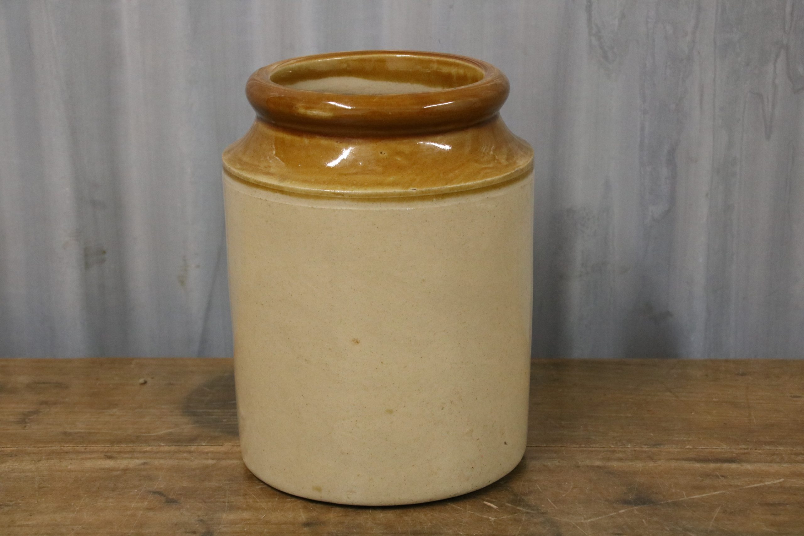 A rustic stoneware jar, originally used to store food but they would make beautiful vases for the country home. Simply fill with homegrown flowers or use to store kitchen utensils inside.