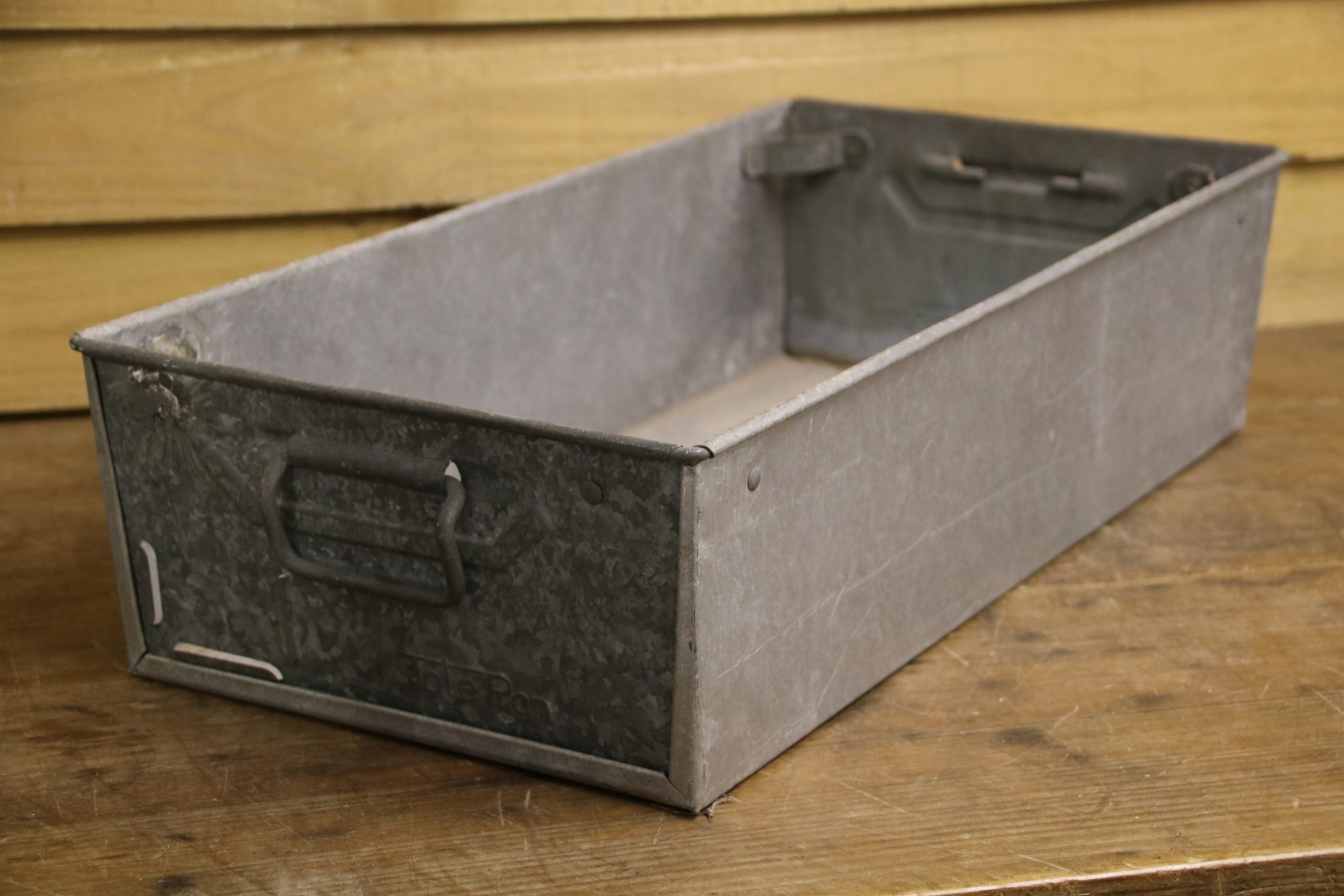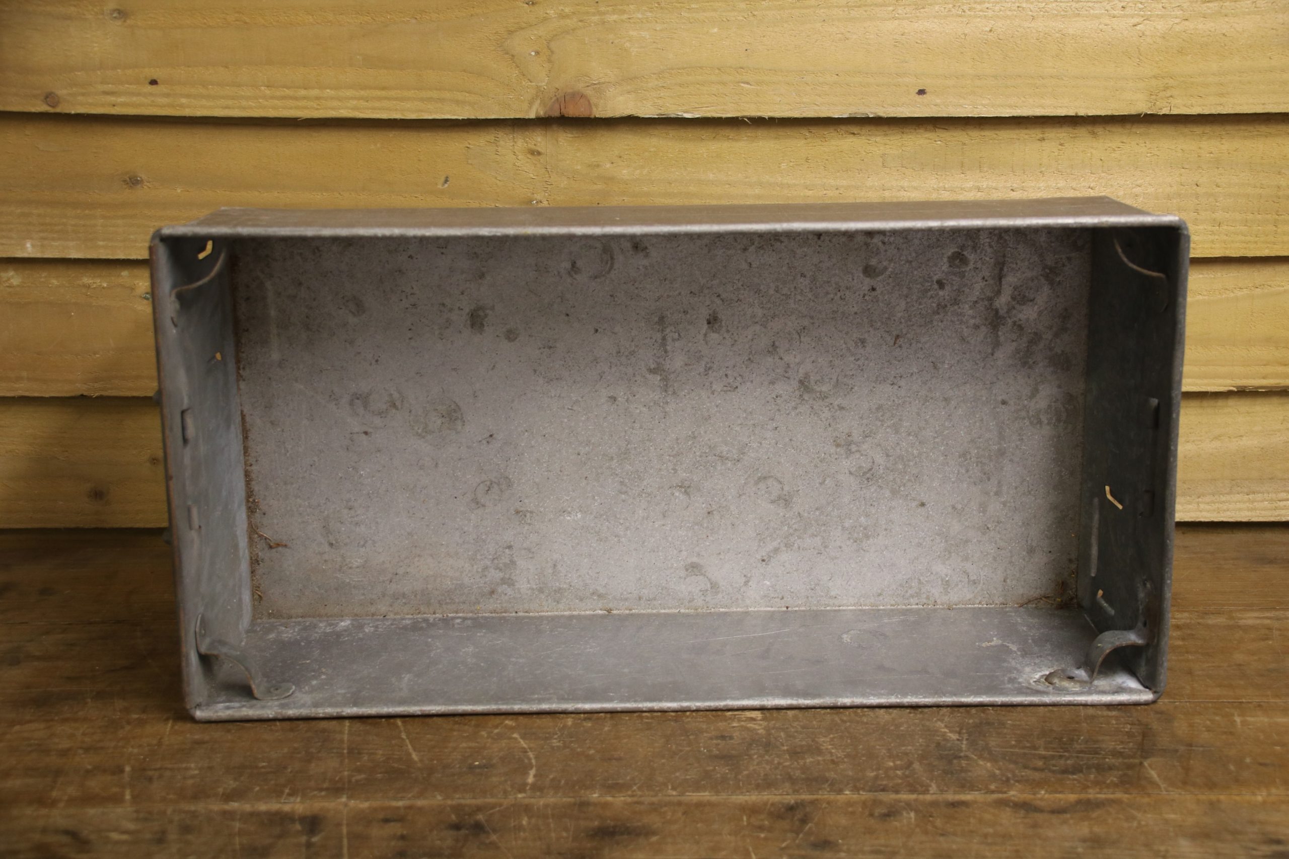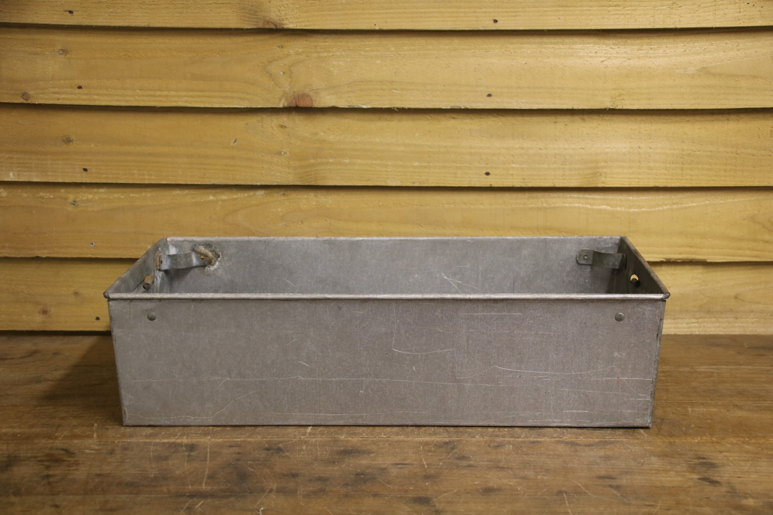 An industrial metal tote bin, originally used in a factory to house parts but would look beautiful planted up in the garden. Use to sow seedlings inside or create a little alpine garden, the ideas are endless!