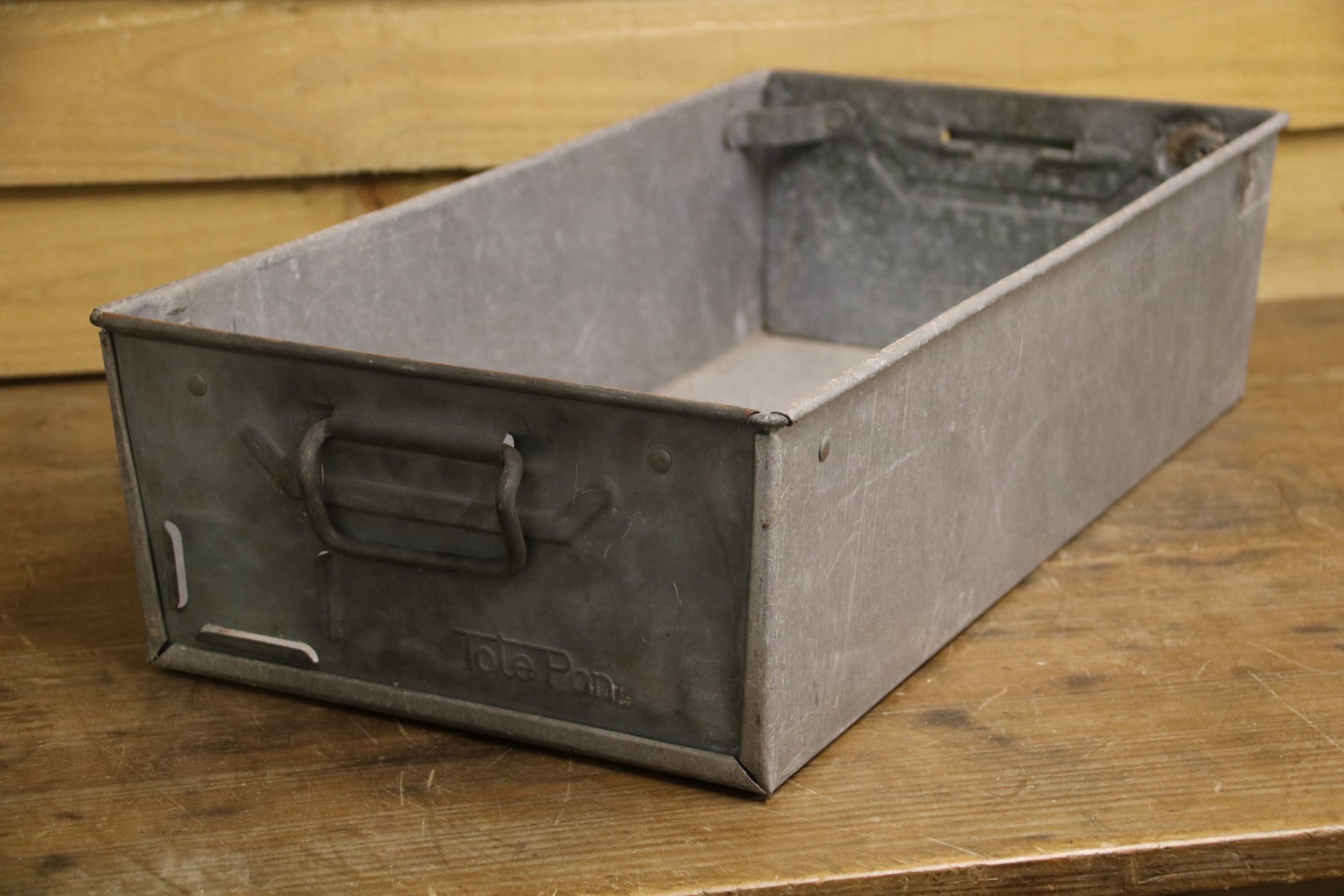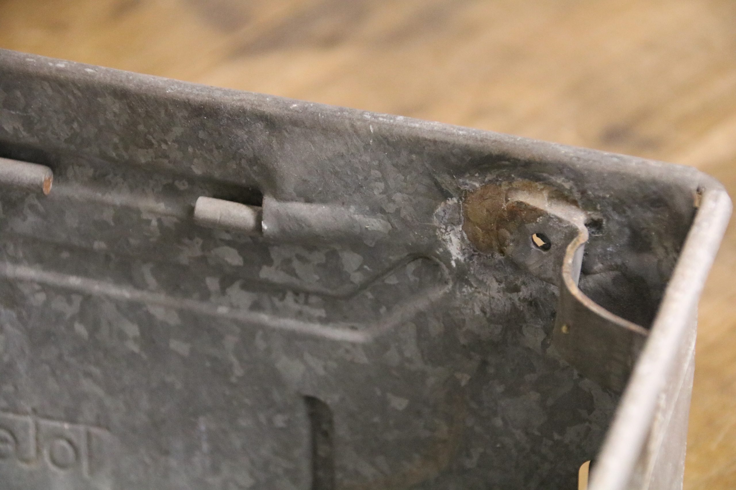 The tote bin is in good condition with a few marks and dents due to age. It has two handles and one of the stacking corner brackets has been welded back on.