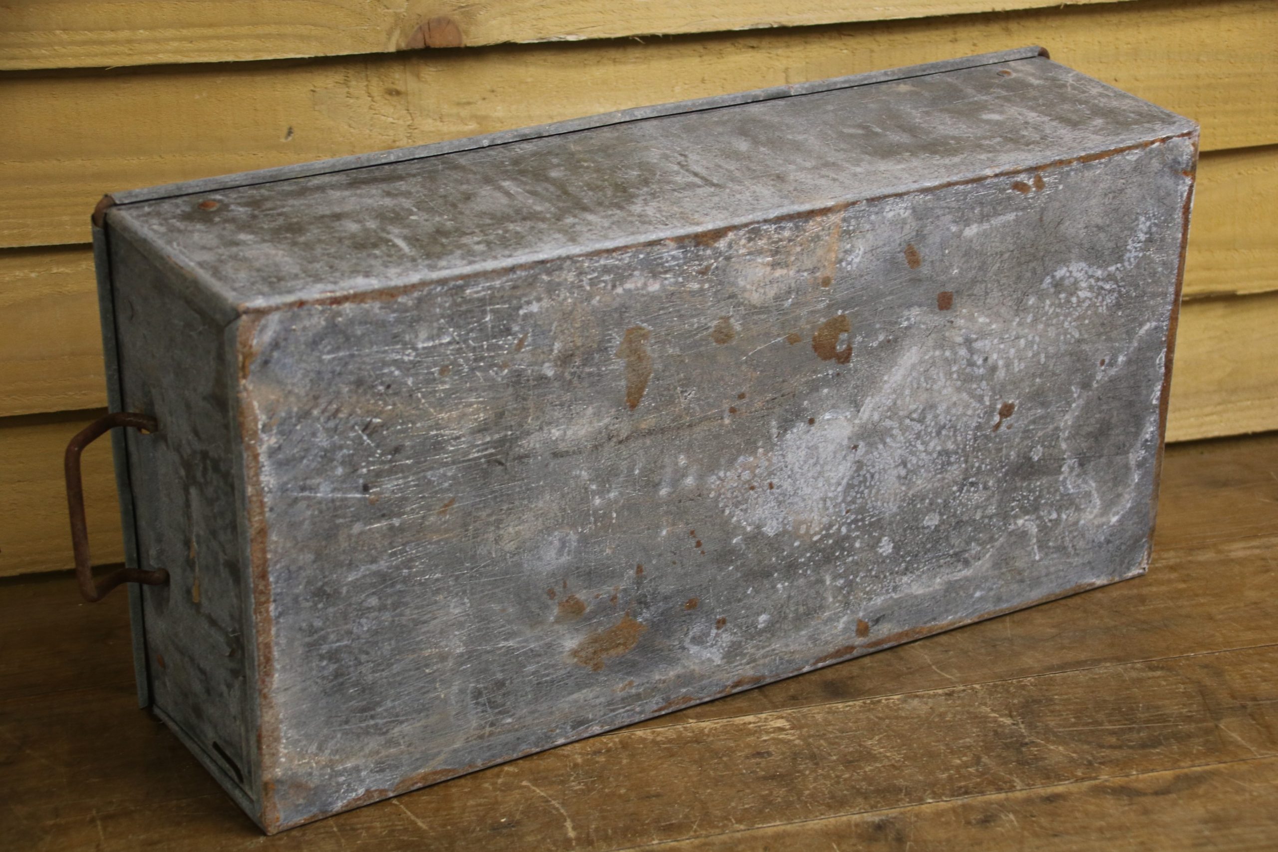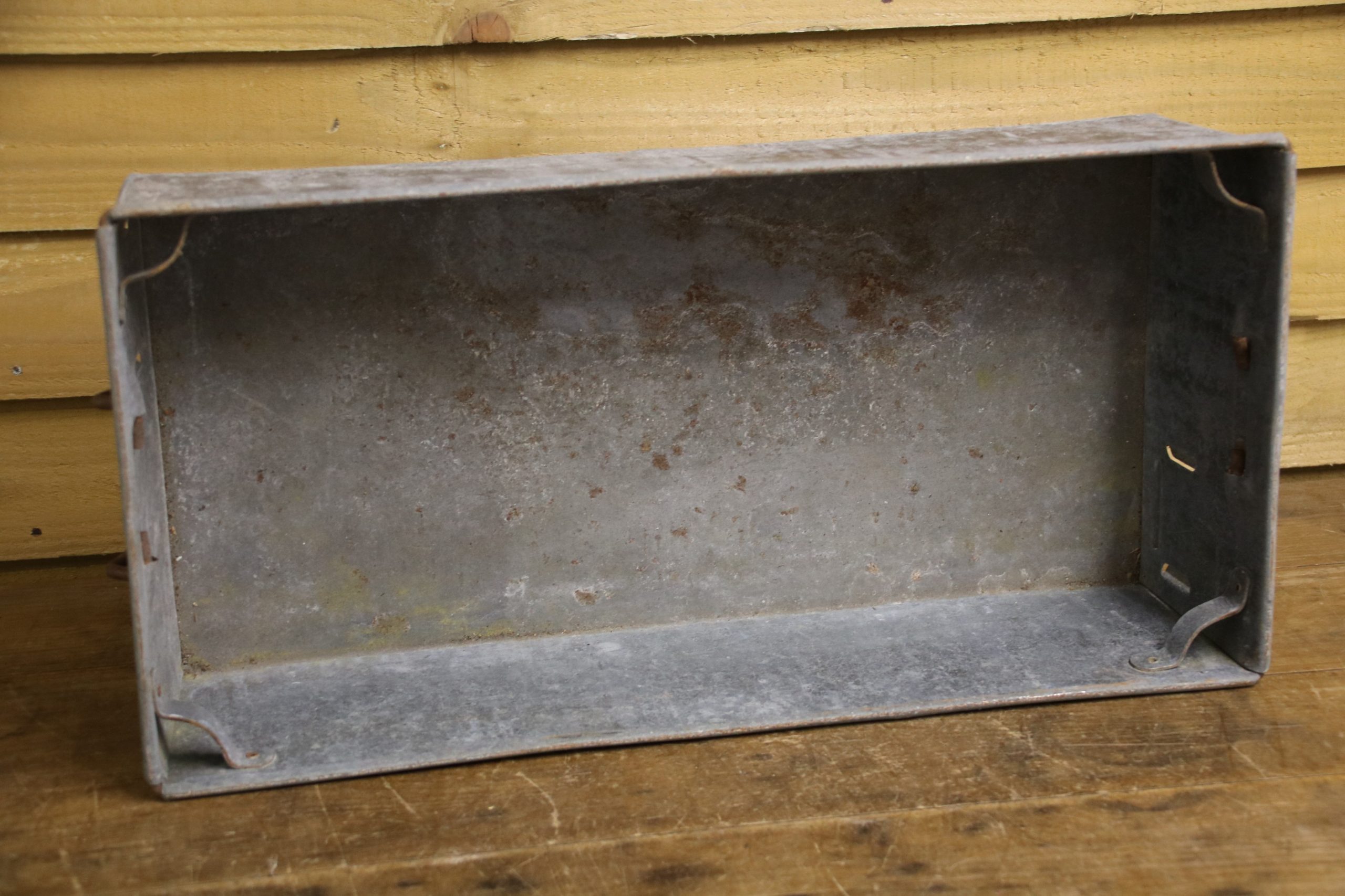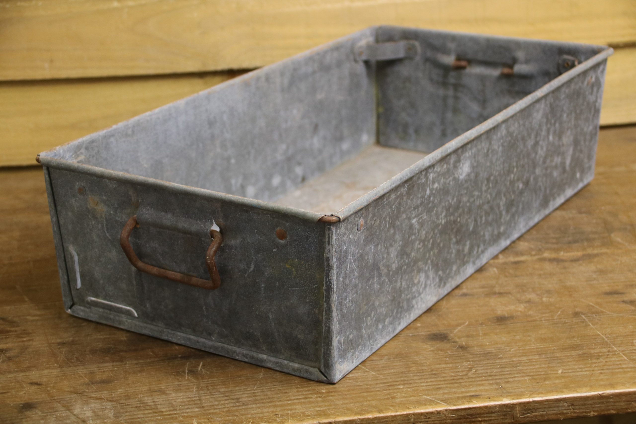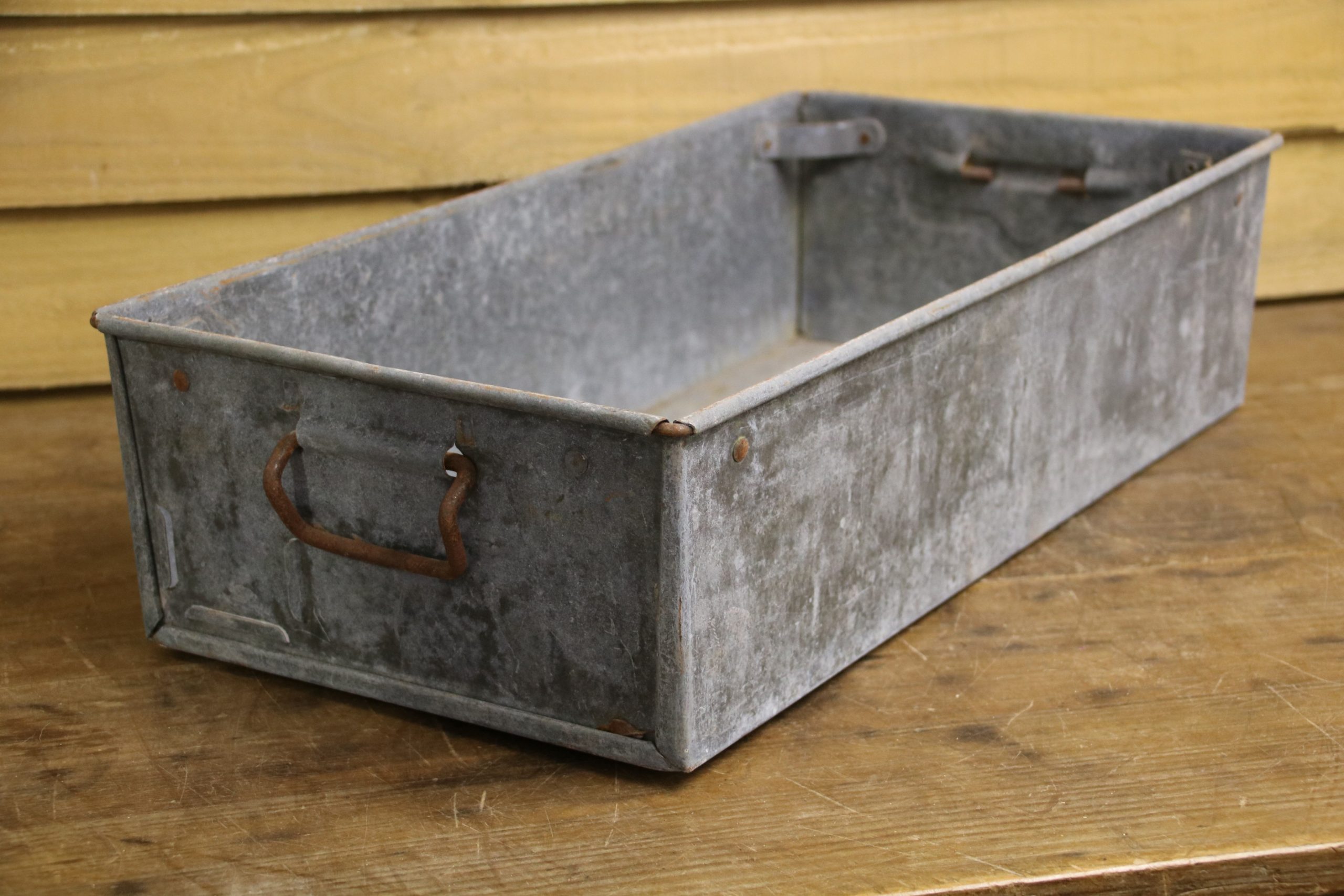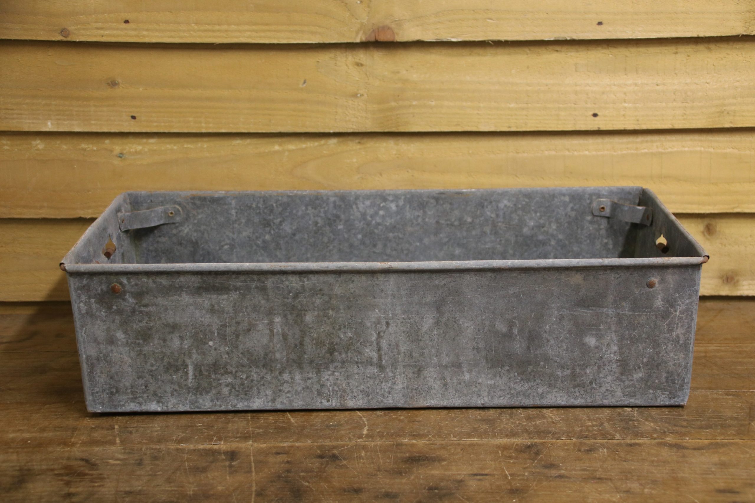 An industrial metal tote bin, originally used in a factory to house parts but would look beautiful planted up in the garden. Use to sow seedlings inside or create a little alpine garden, the ideas are endless!