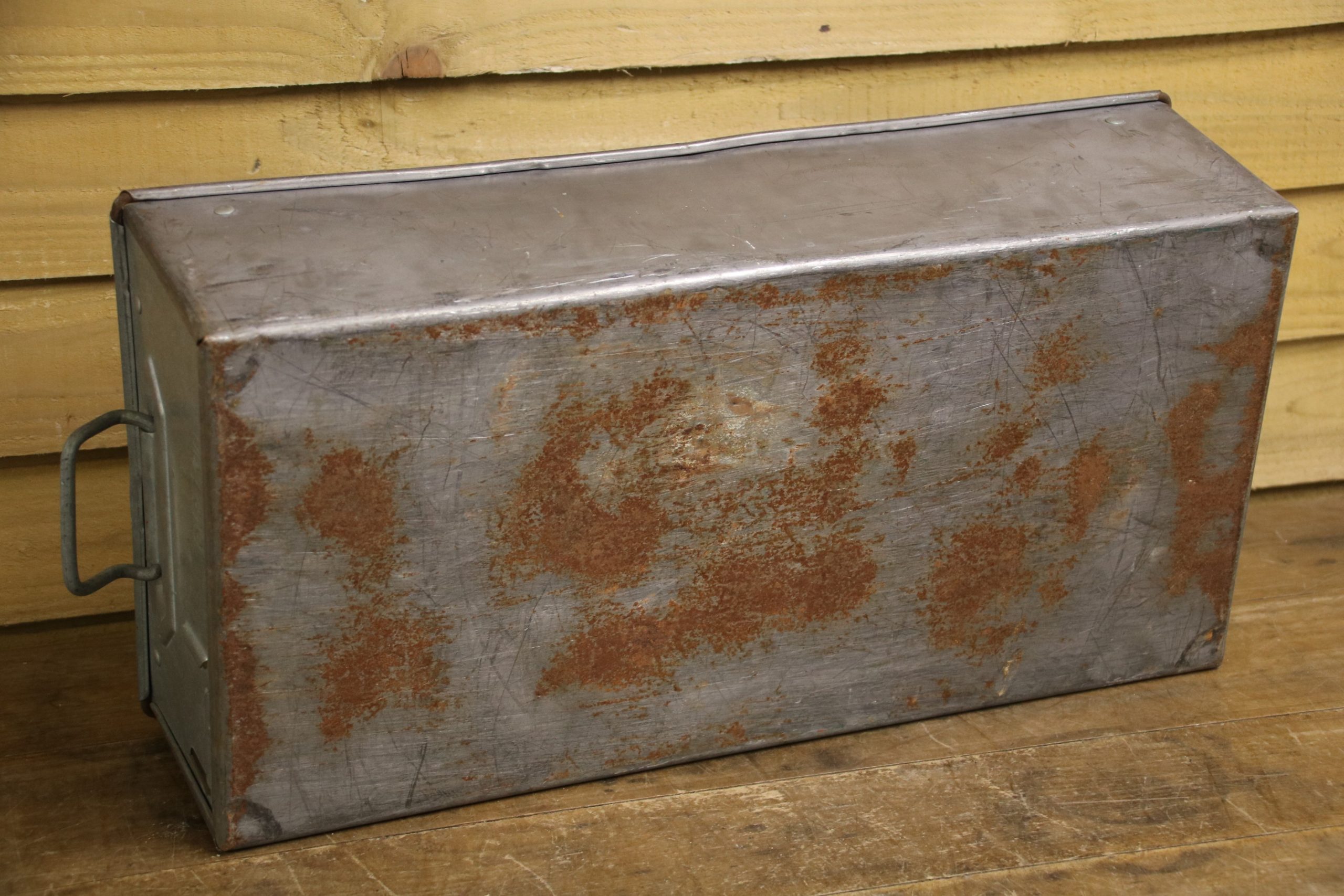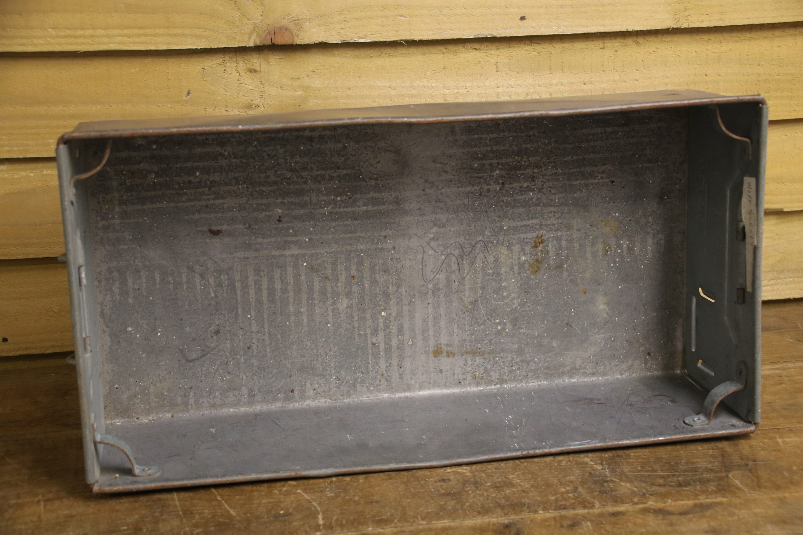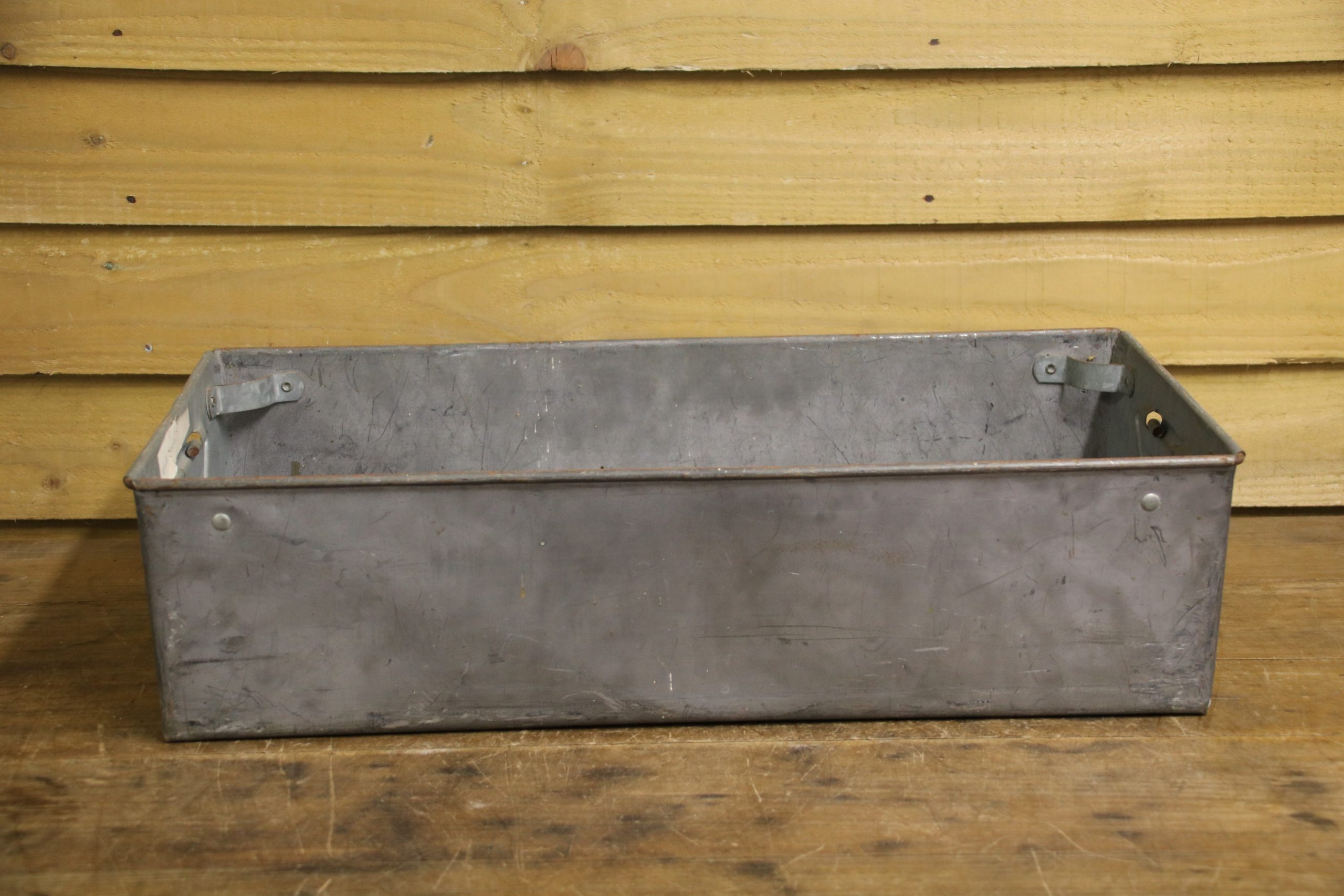 An industrial metal tote bin, originally used in a factory to house parts but would look beautiful planted up in the garden. Use to sow seedlings inside or create a little alpine garden, the ideas are endless!