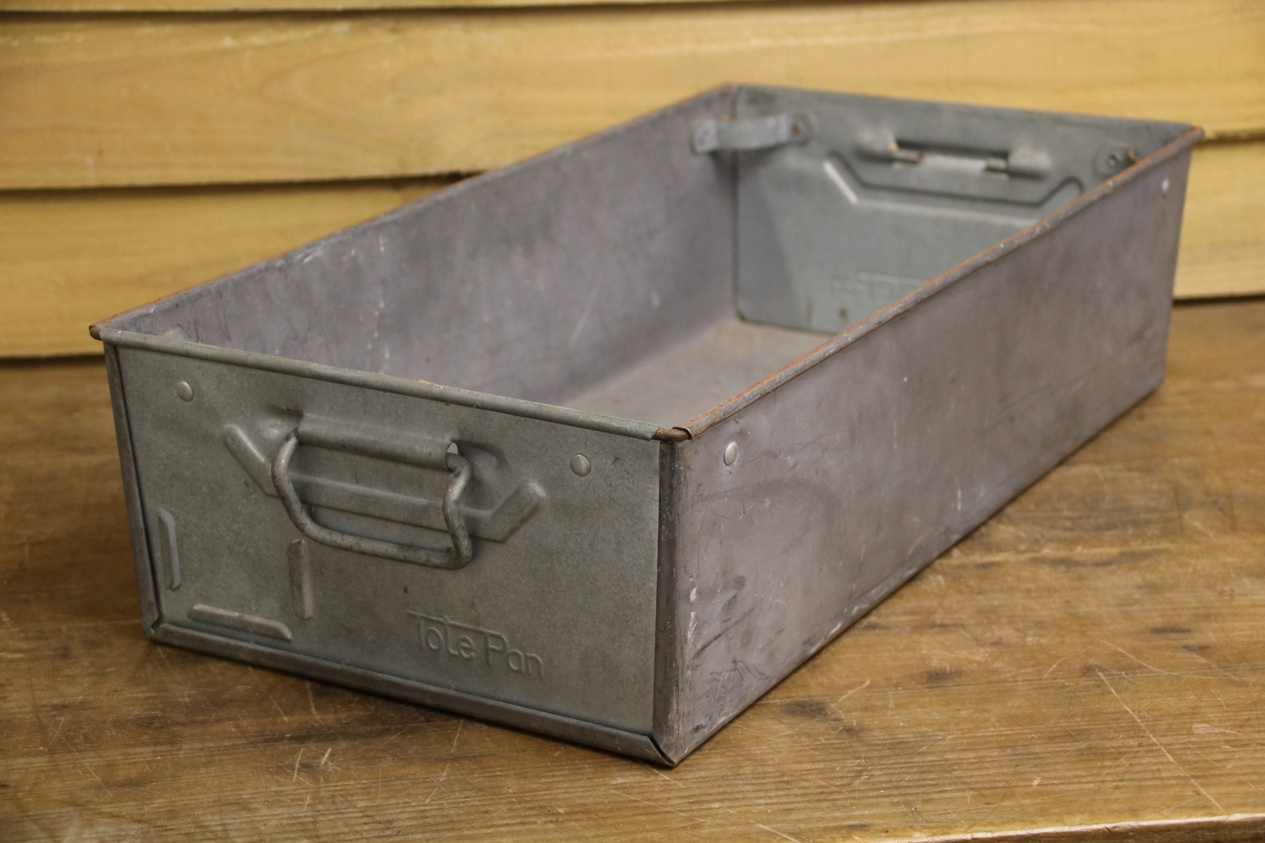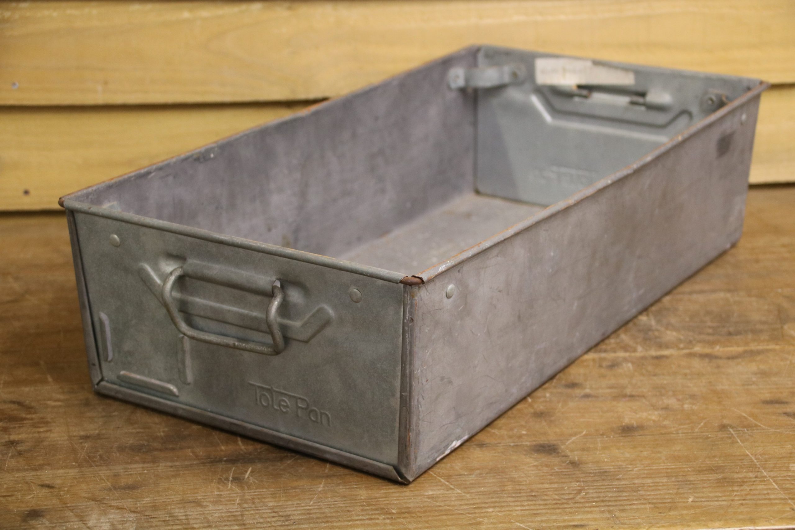 The tote bin is in very good condition with a few marks and dents due to age. It has two handles and some top rust on the bottom.