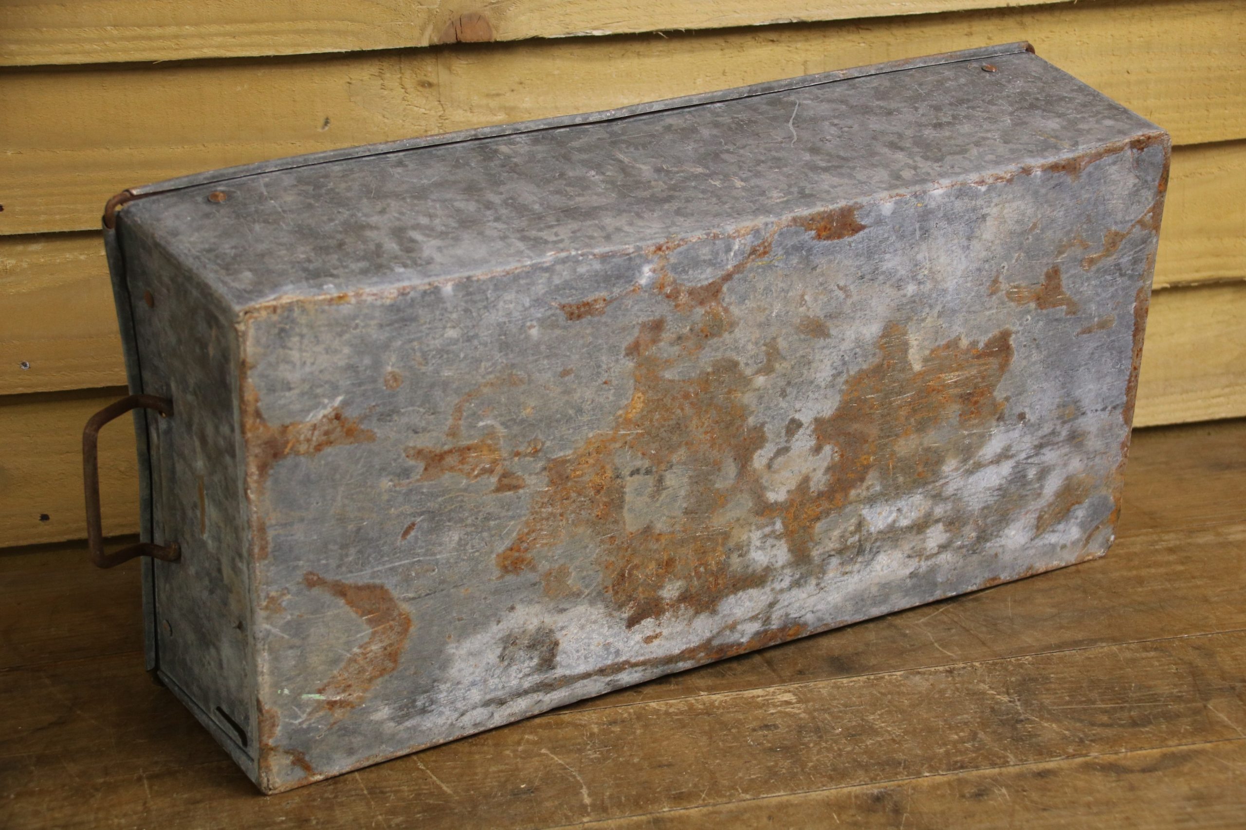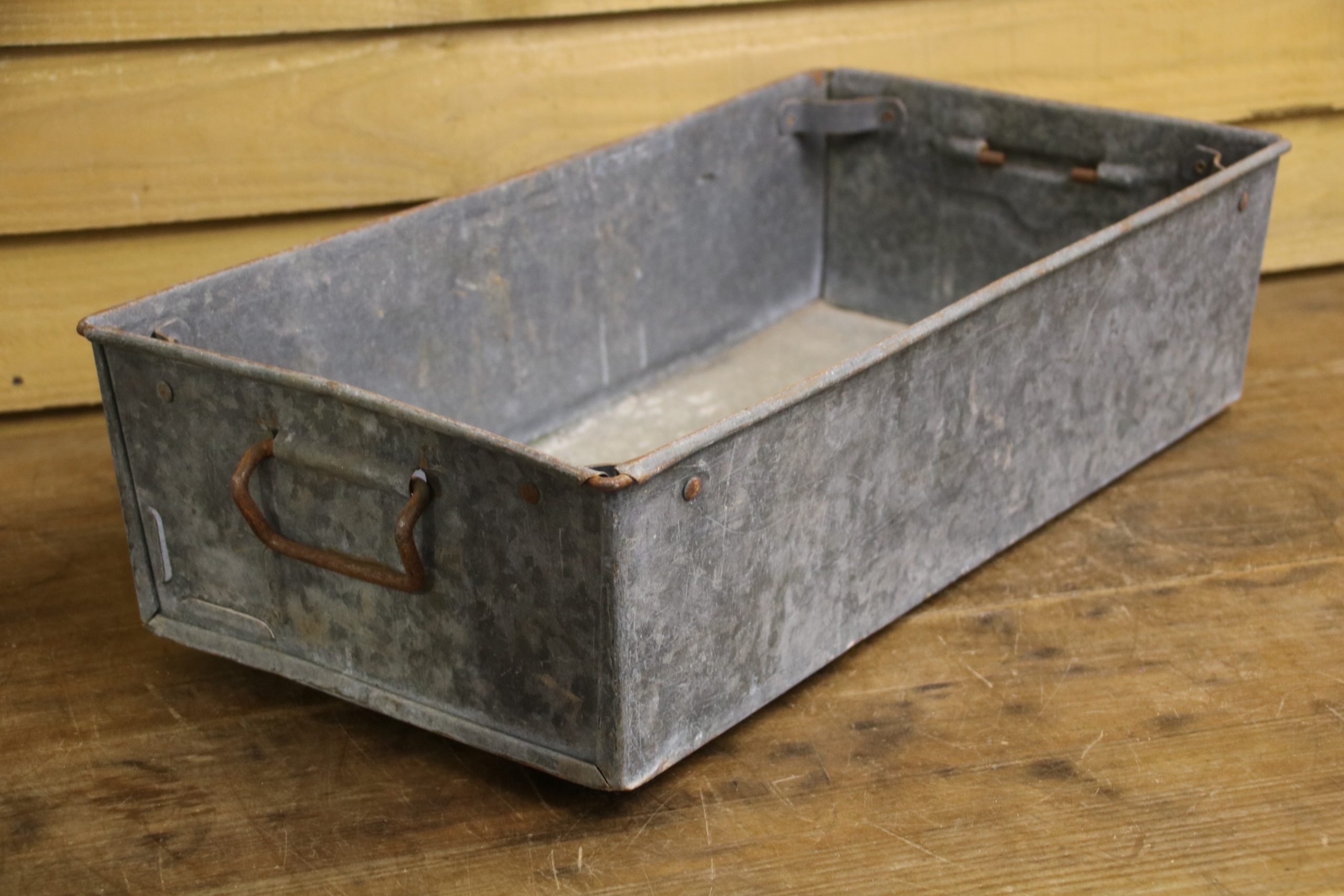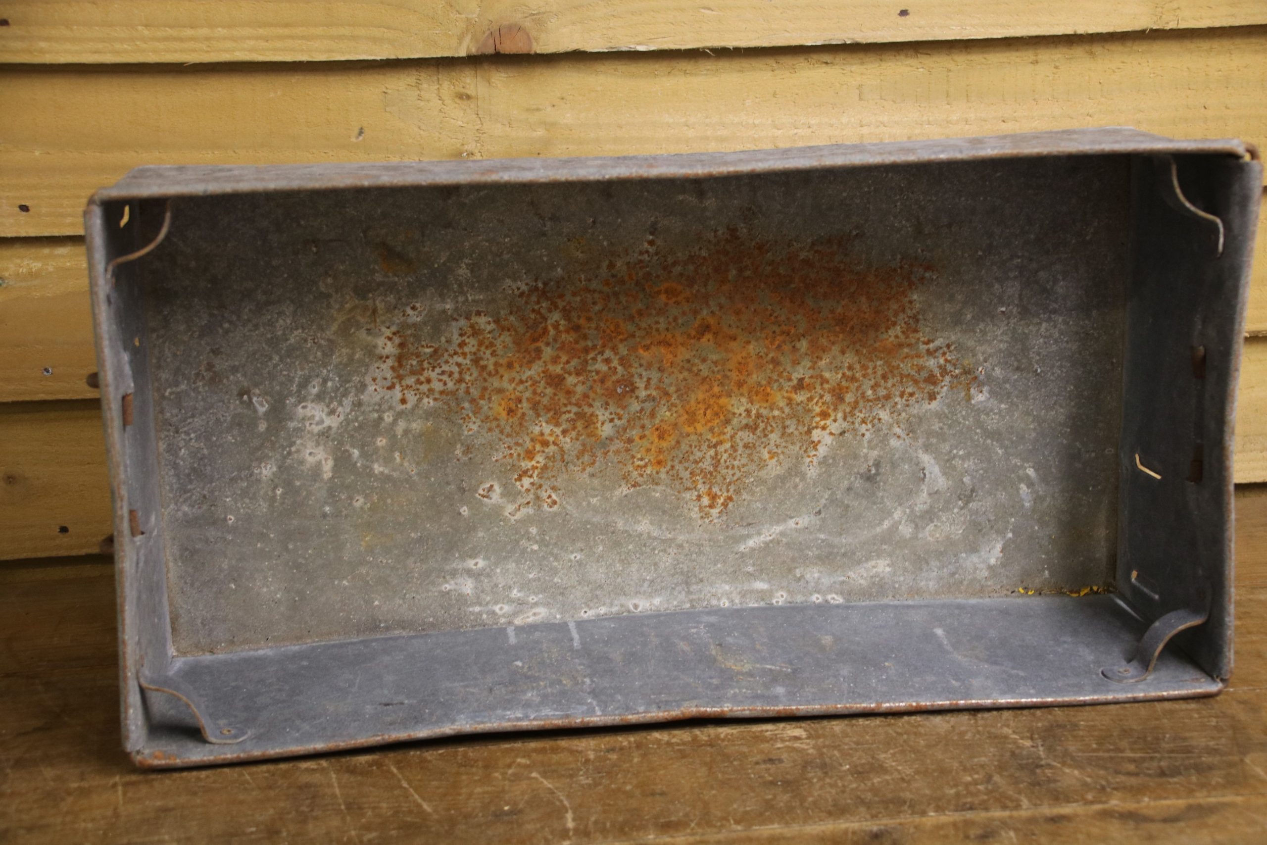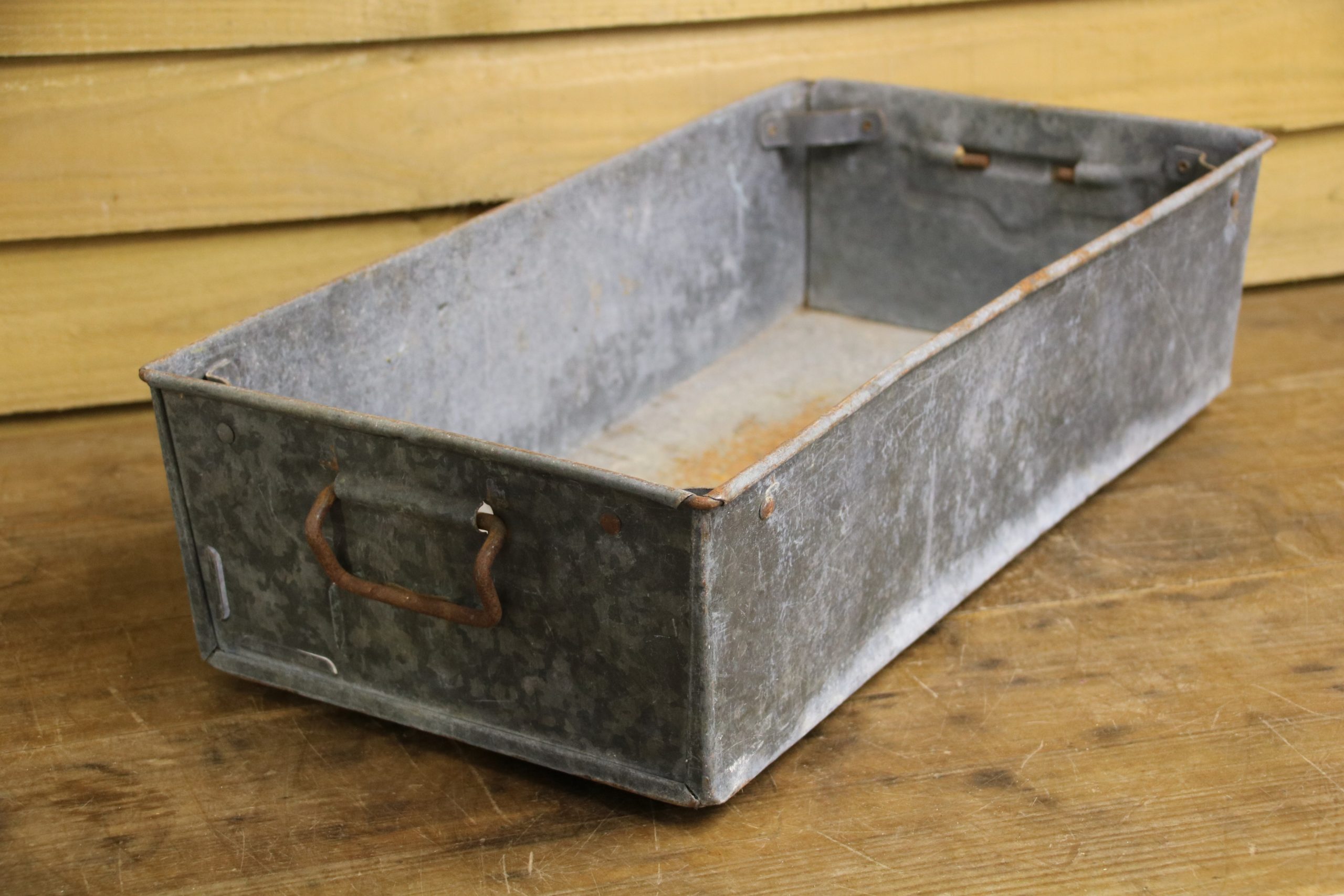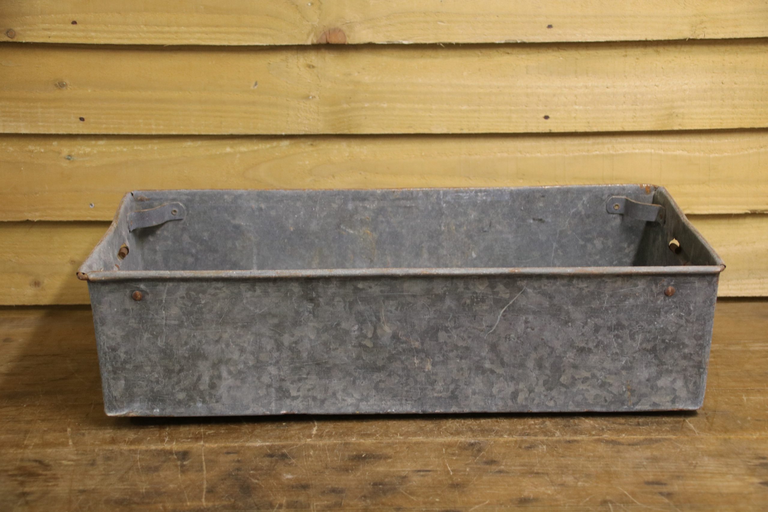 An industrial metal tote bin, originally used in a factory to house parts but would look beautiful planted up in the garden. Use to sow seedlings inside or create a little alpine garden, the ideas are endless!