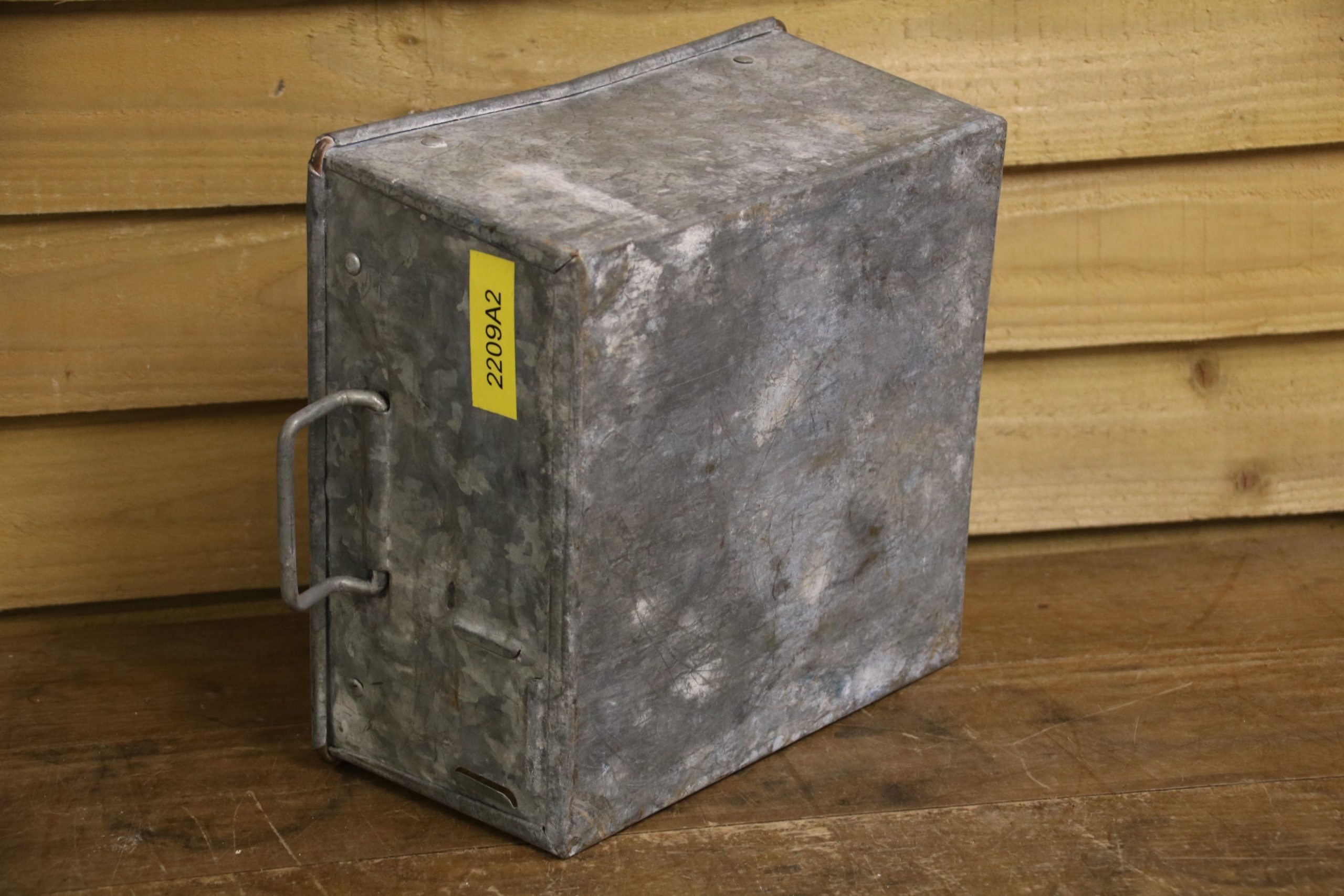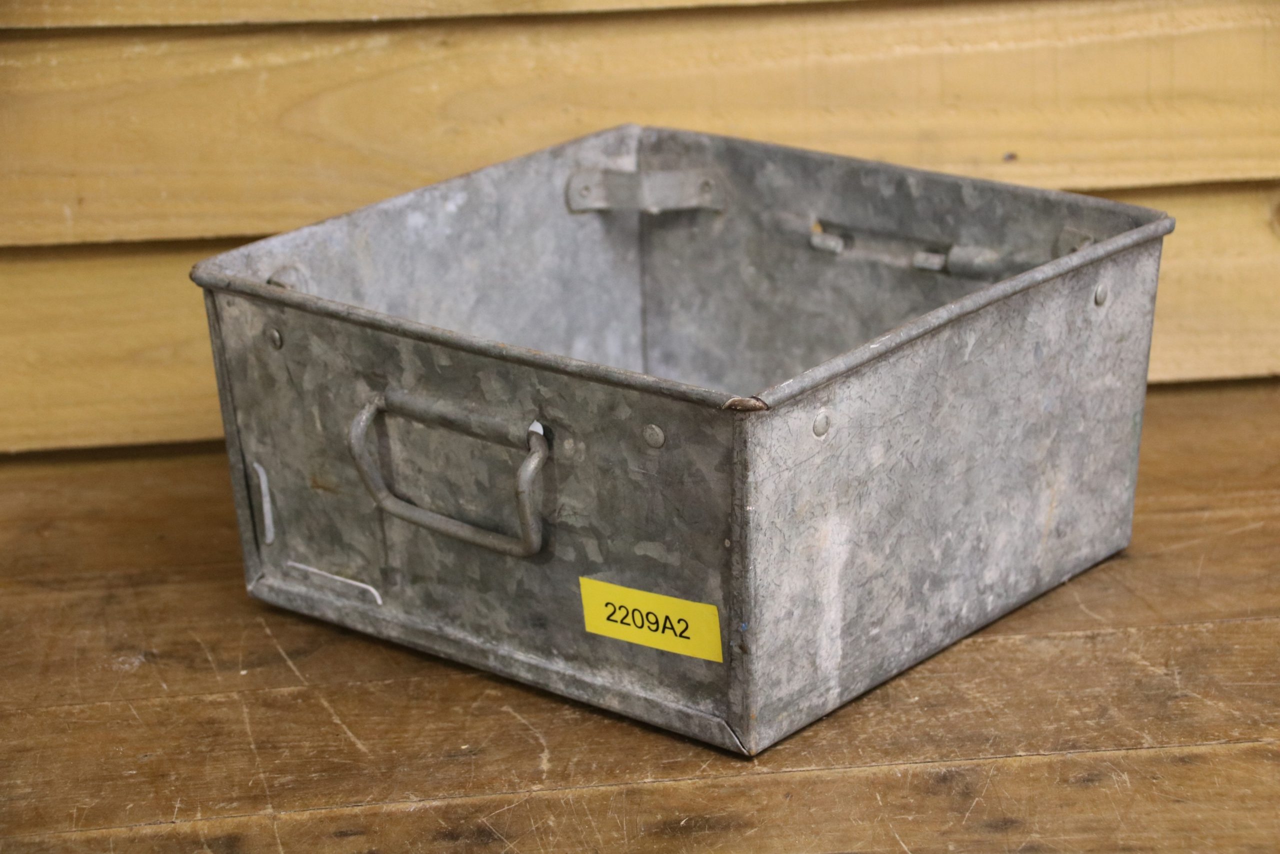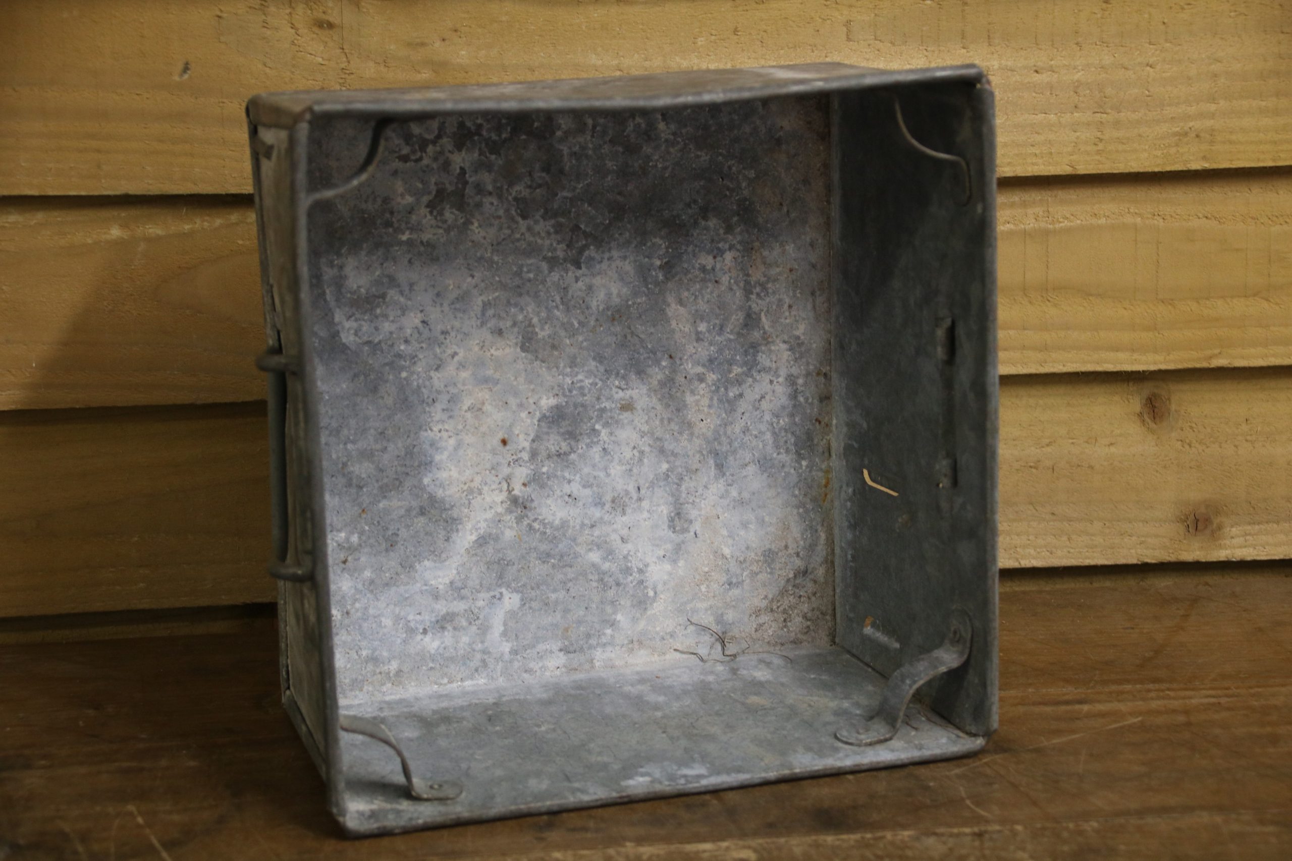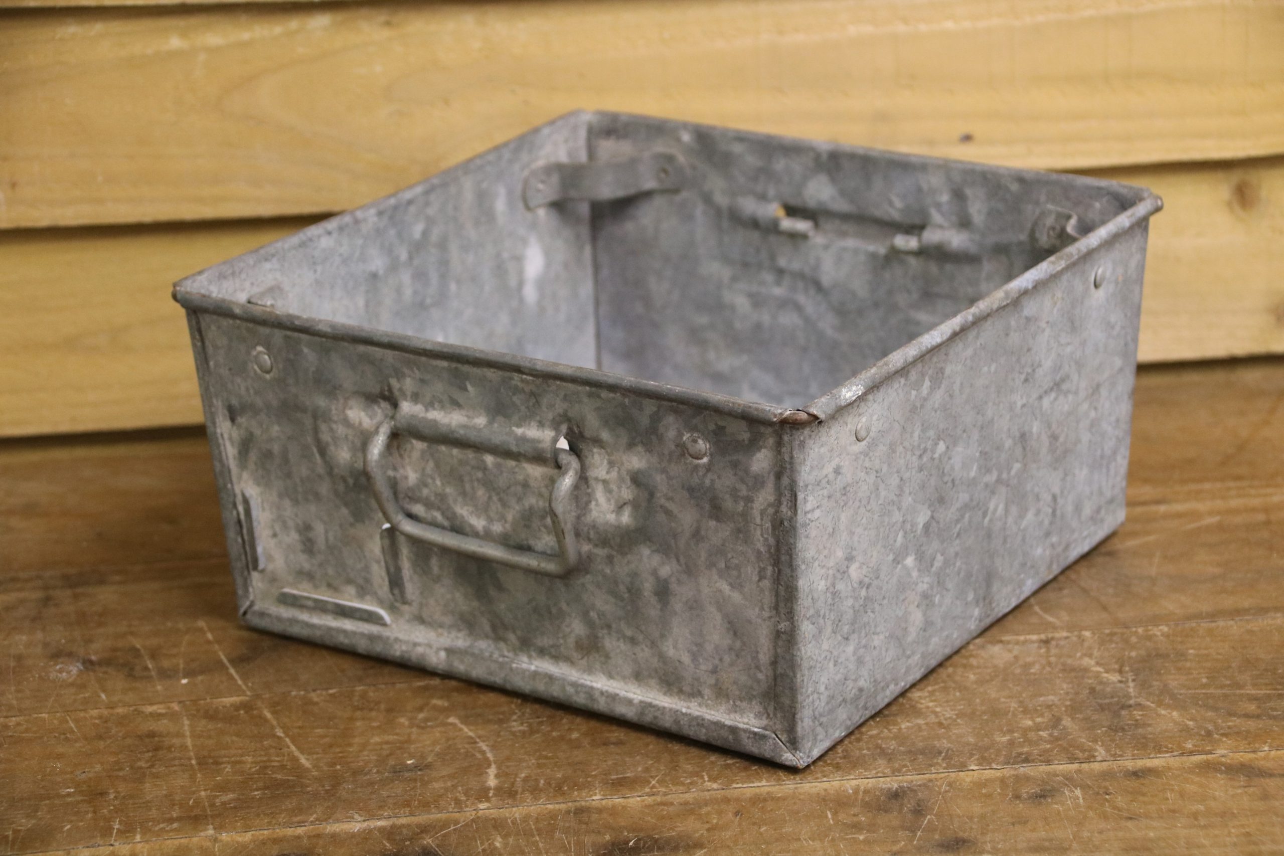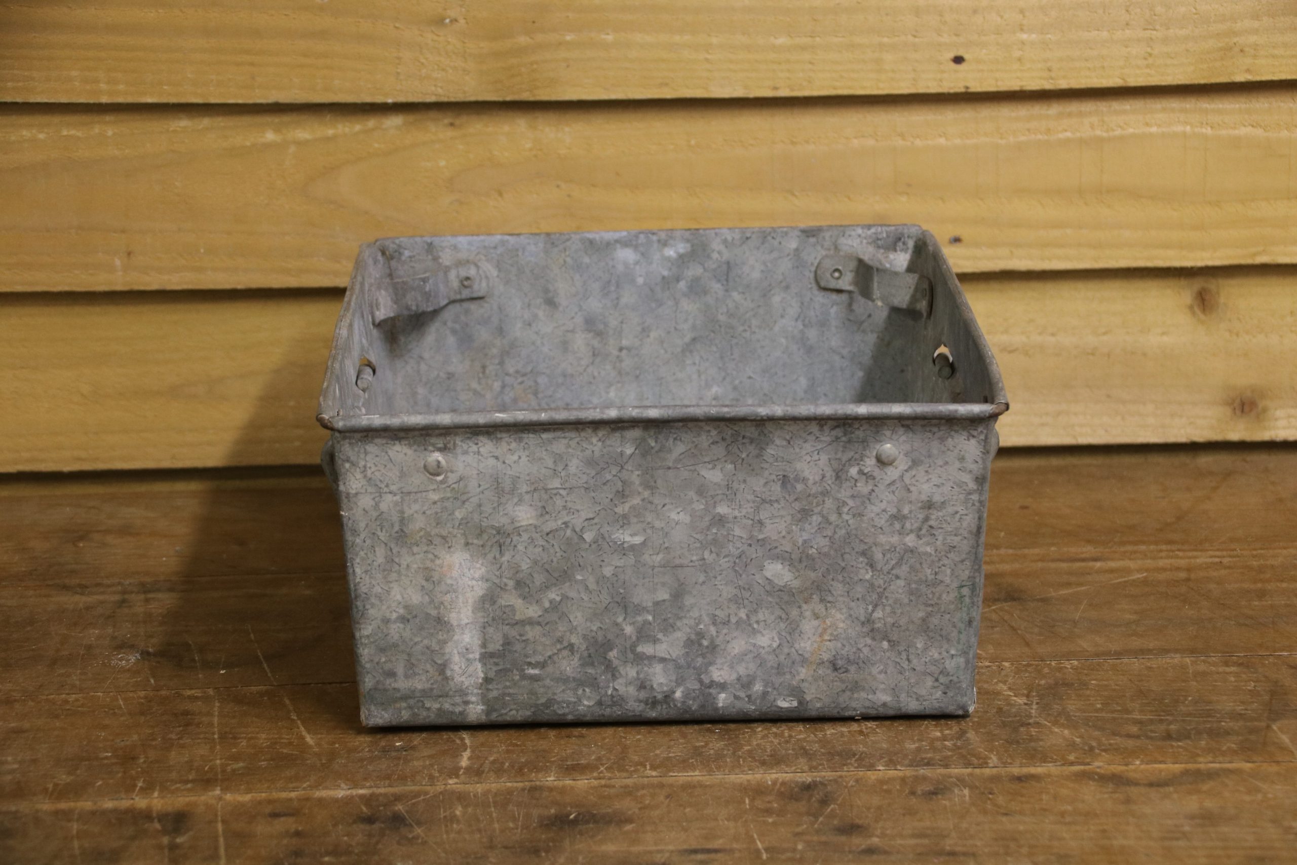 An industrial metal tote bin, originally used in a factory to house parts but would look beautiful planted up in the garden. Use to sow seedlings inside or create a little alpine garden, the ideas are endless!