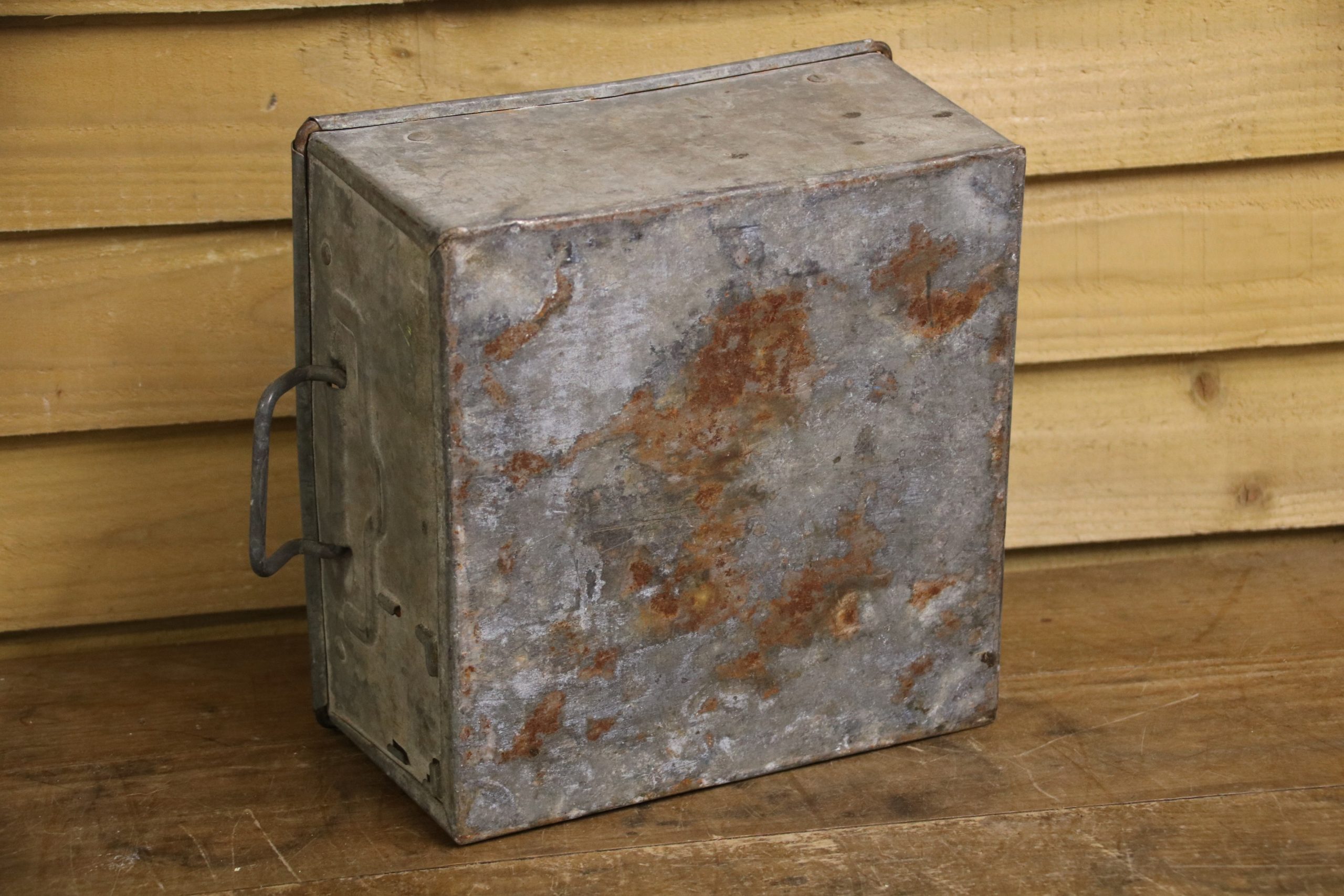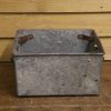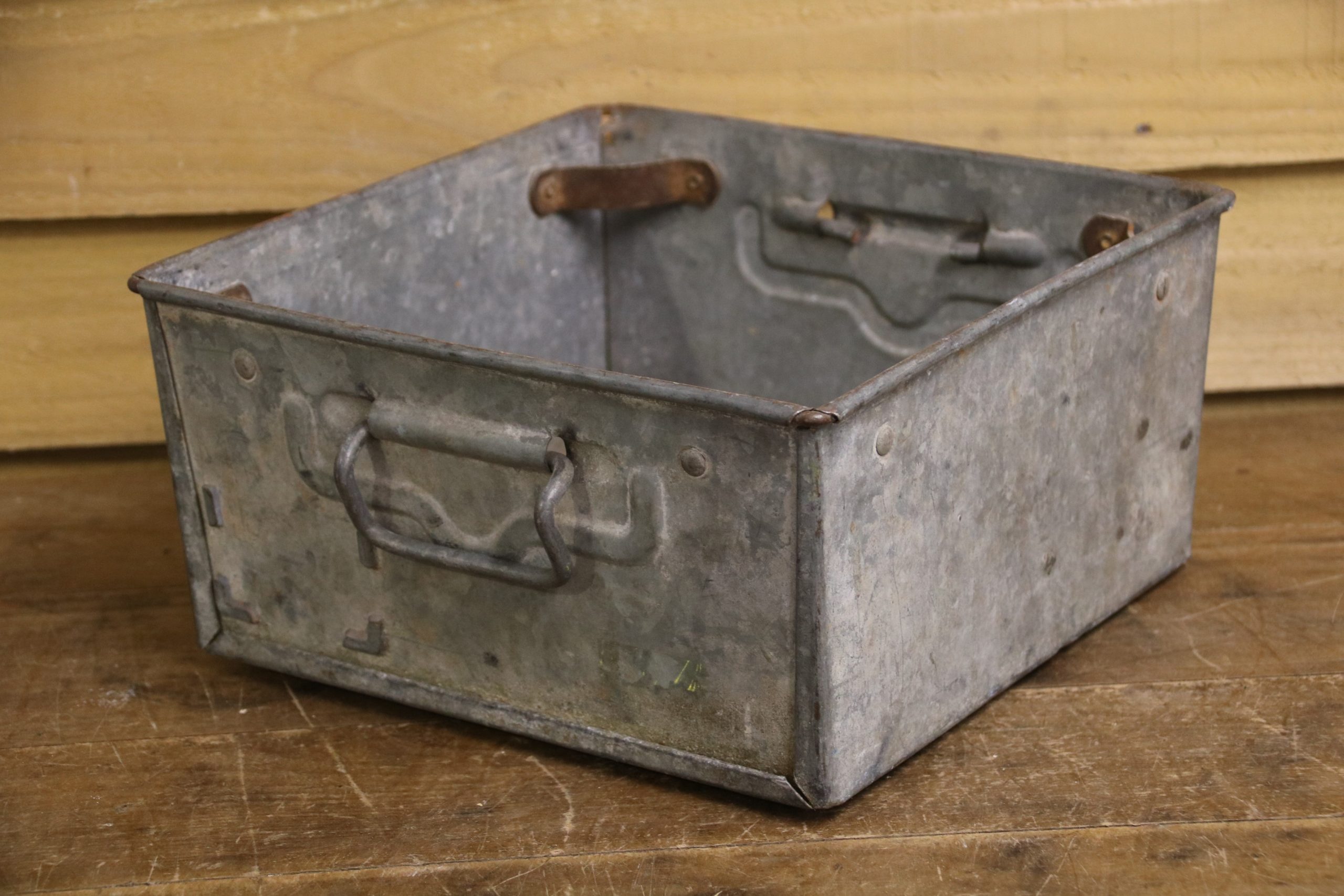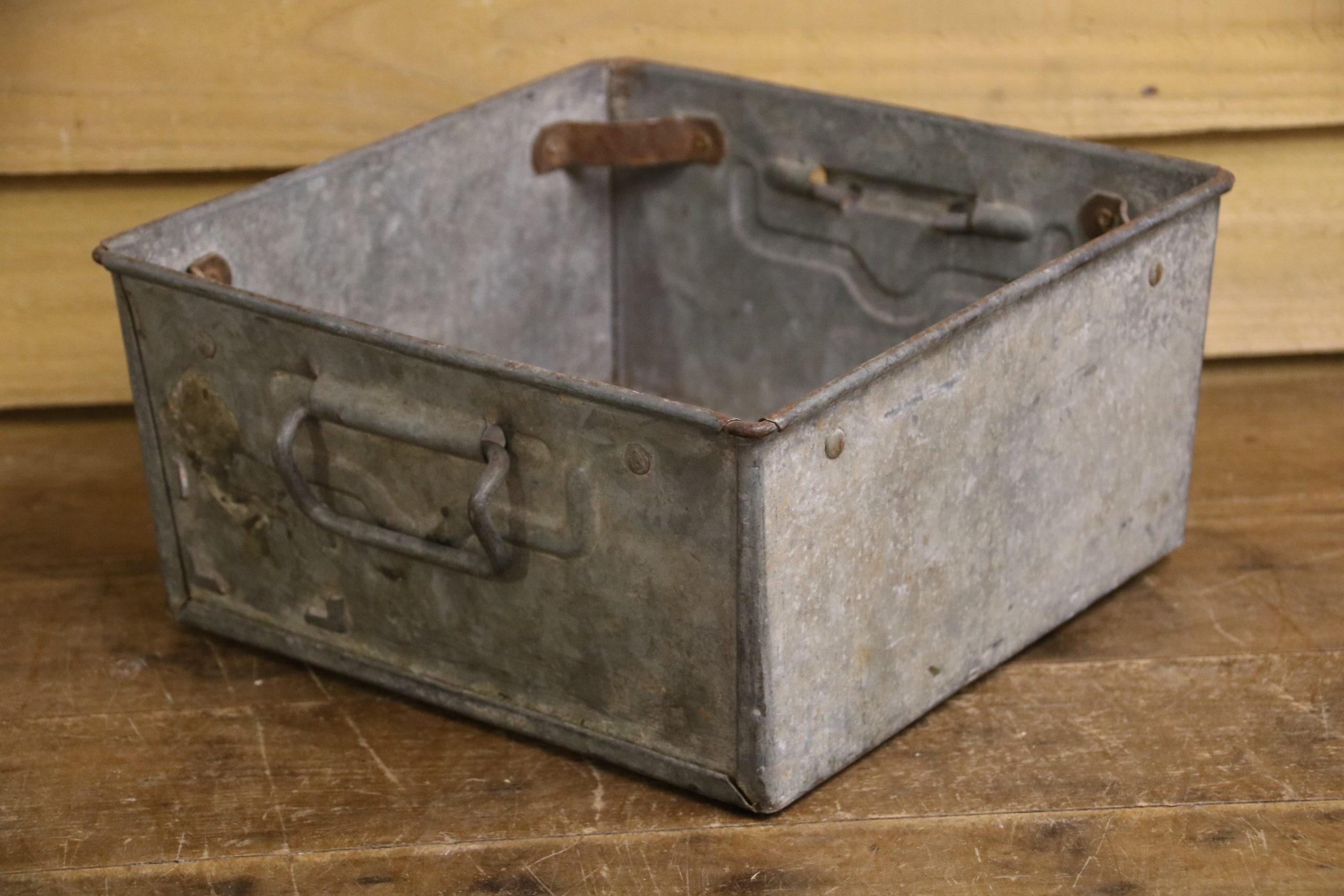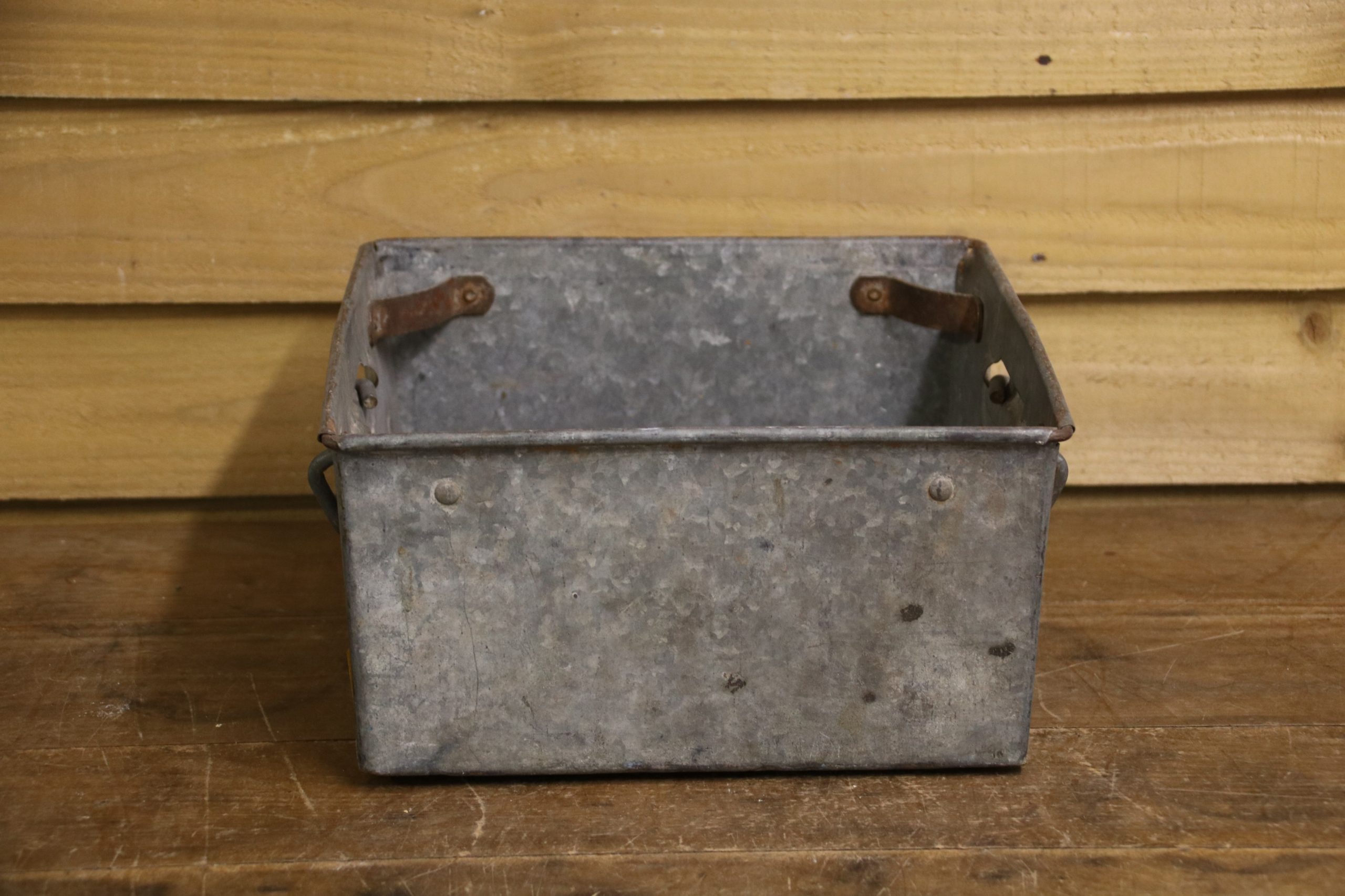 An industrial metal tote bin, originally used in a factory to house parts but would look beautiful planted up in the garden. Use to sow seedlings inside or create a little alpine garden, the ideas are endless!