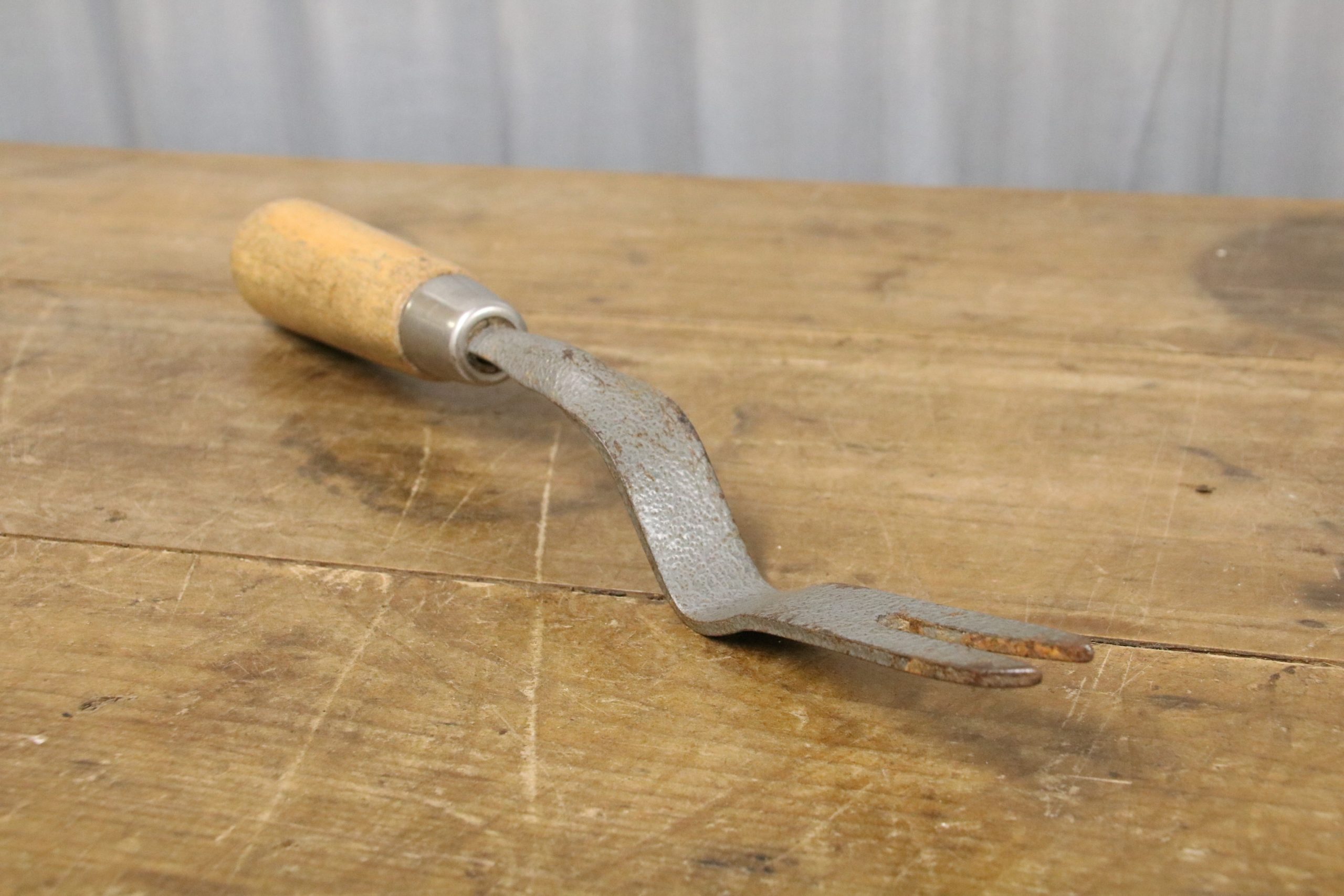 A vintage daisy puller in very good condition with a waxed wooden handle. The original grey paintwork is distressed.