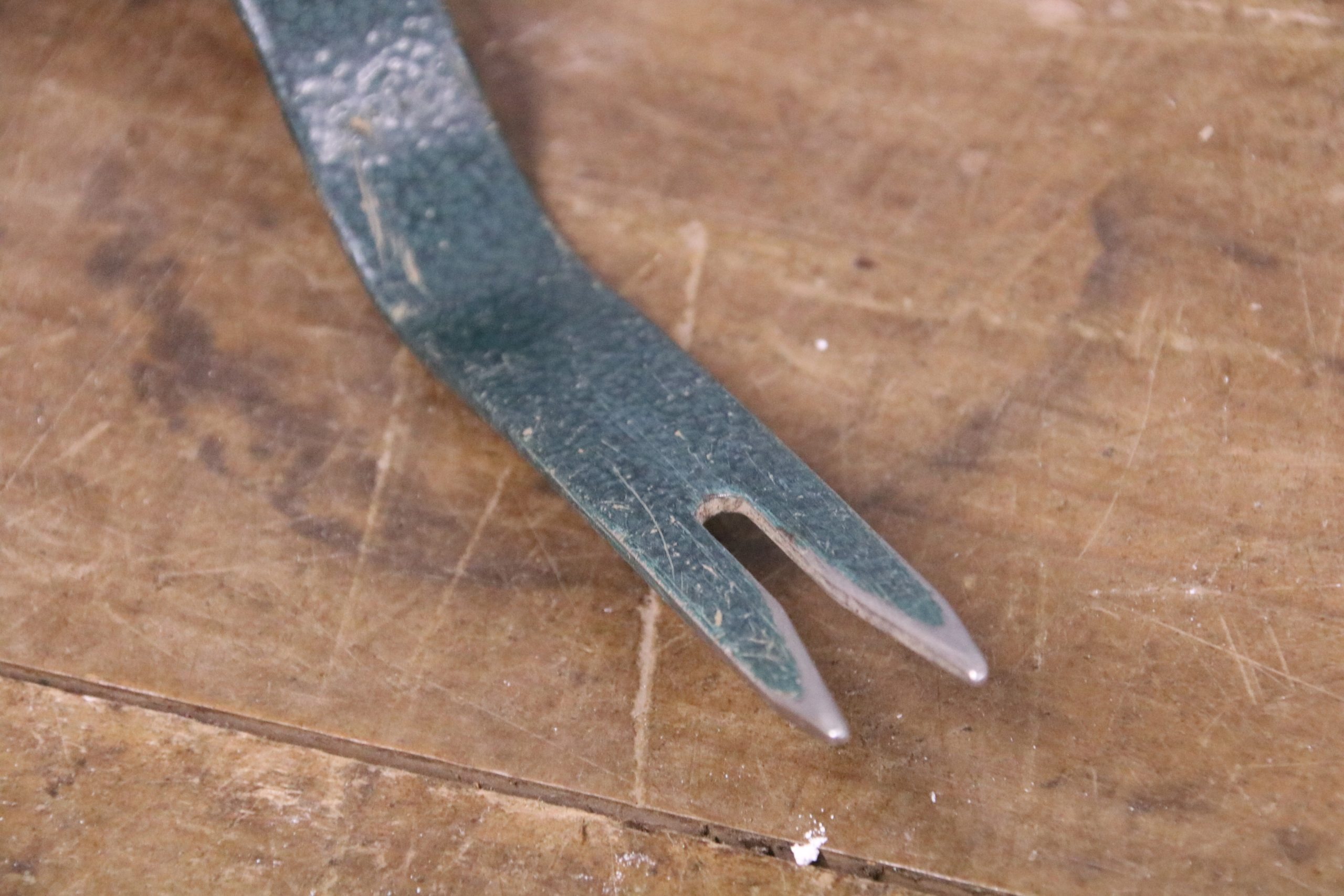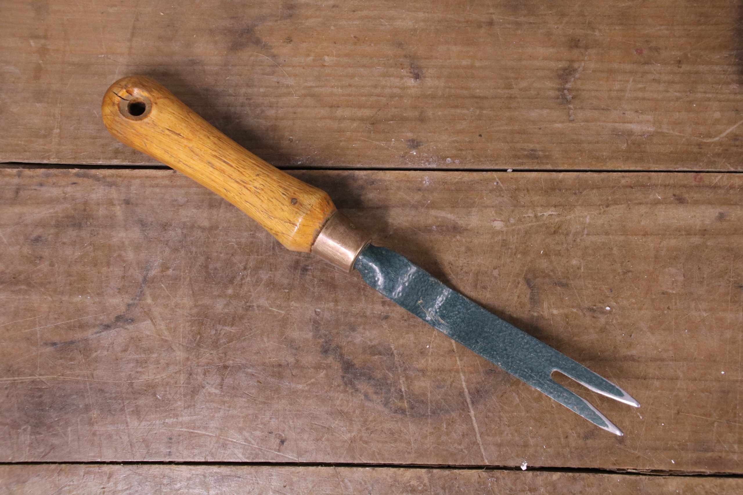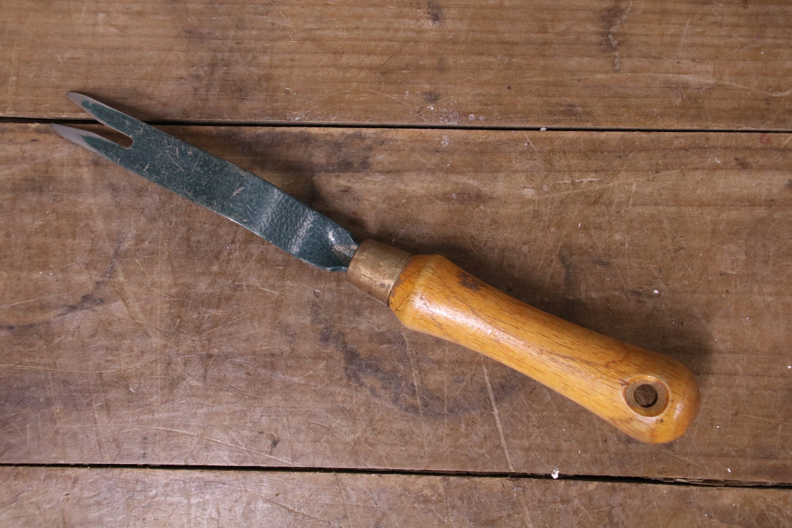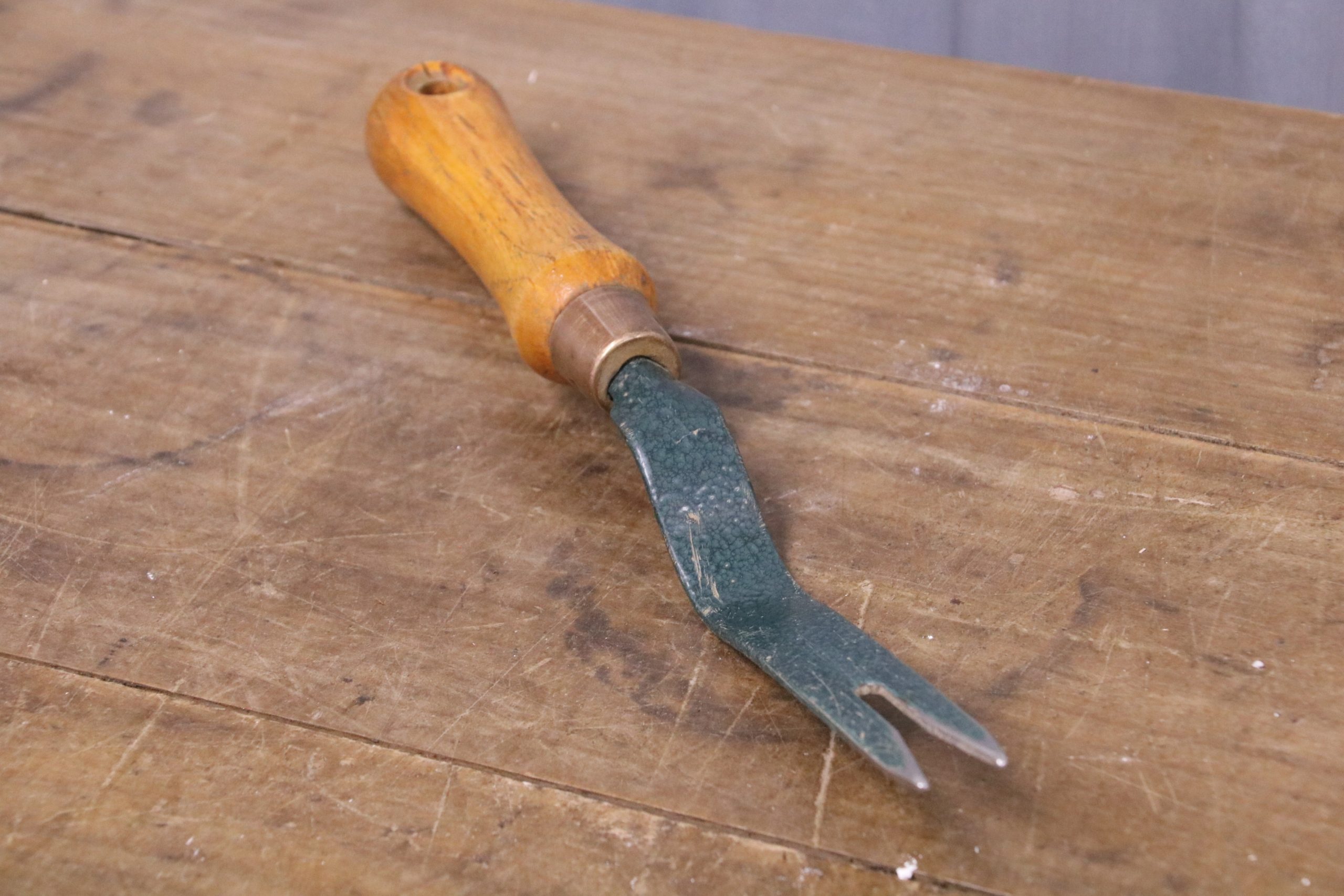 A vintage daisy puller in very good condition with a waxed wooden handle. The original green paintwork is distressed and it has two prongs for removing dandelions and tap rooting weeds.