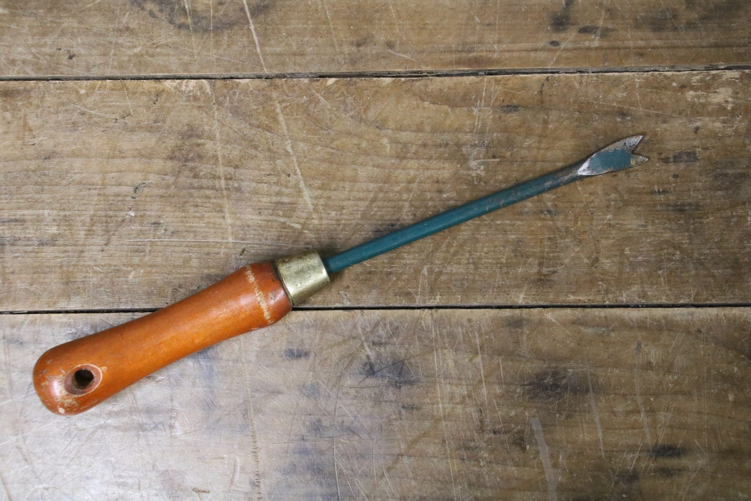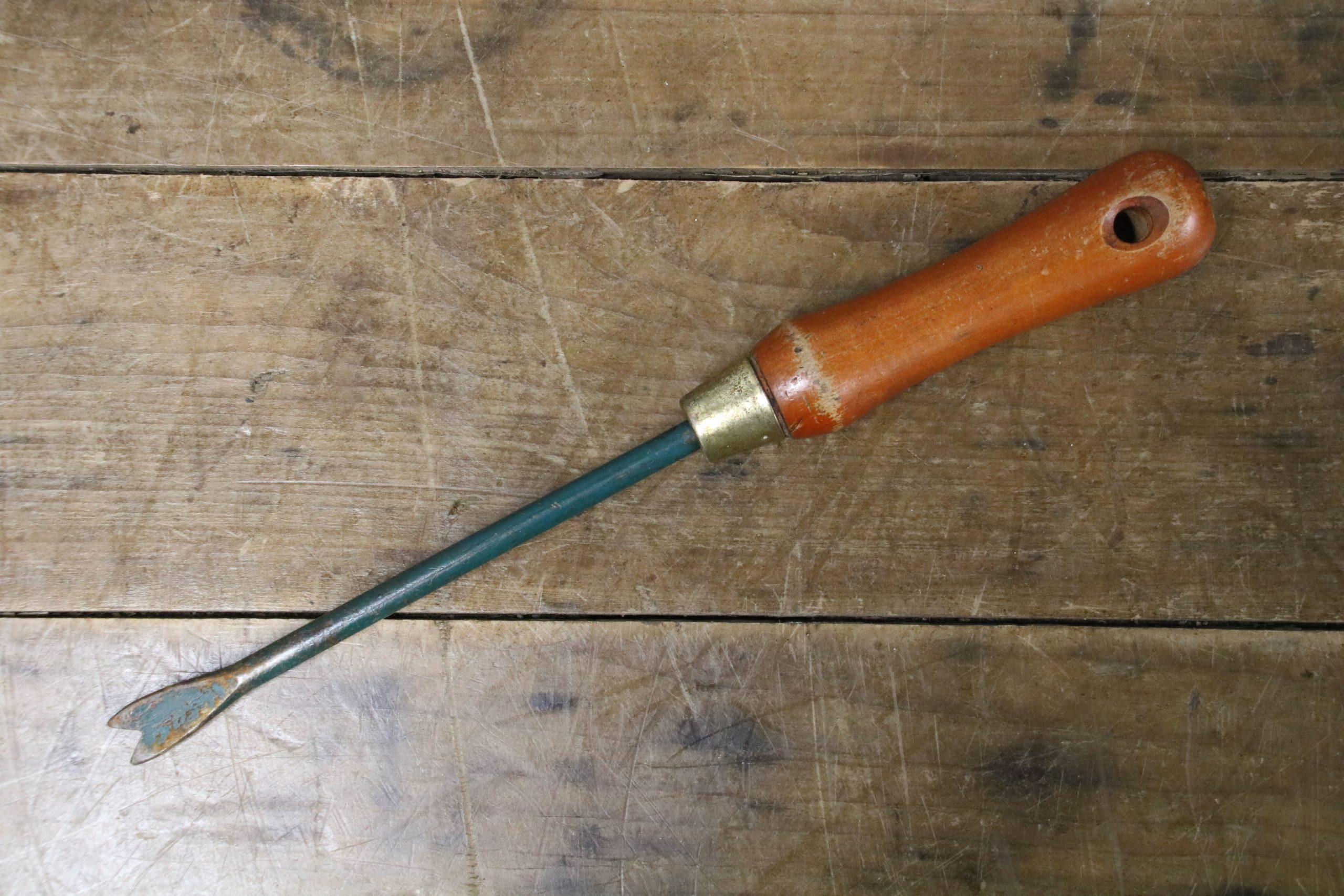 This vintage daisy puller is in good condition with a waxed wooden handle. The original green paintwork has a distressed look to it.
