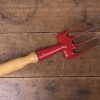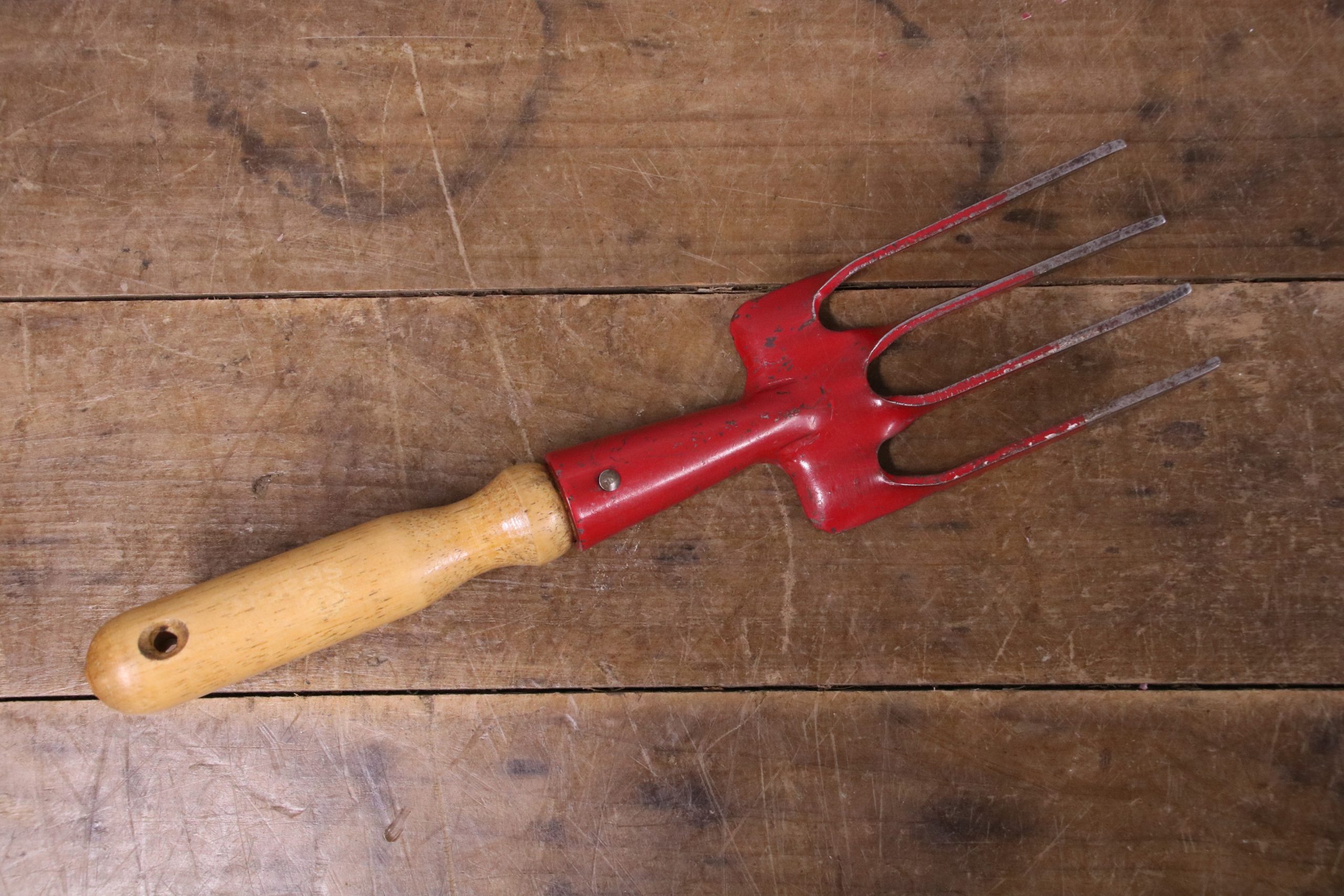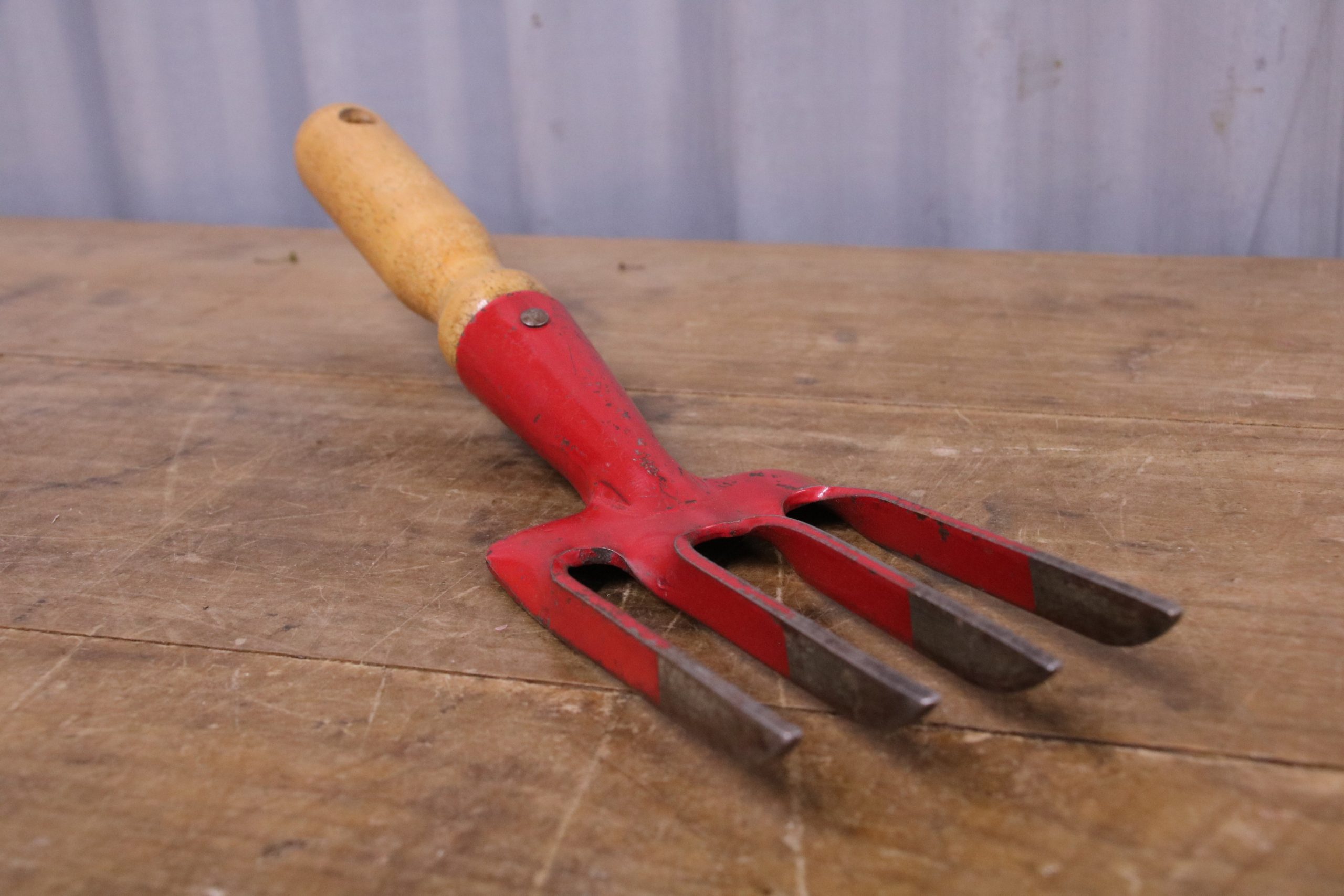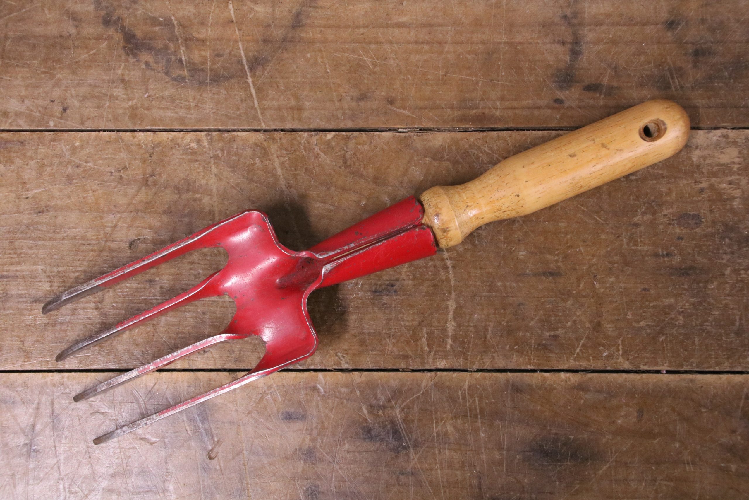 This vintage hand fork is in very good condition with a waxed wooden handle. The metal prongs have distressed red paint on them.